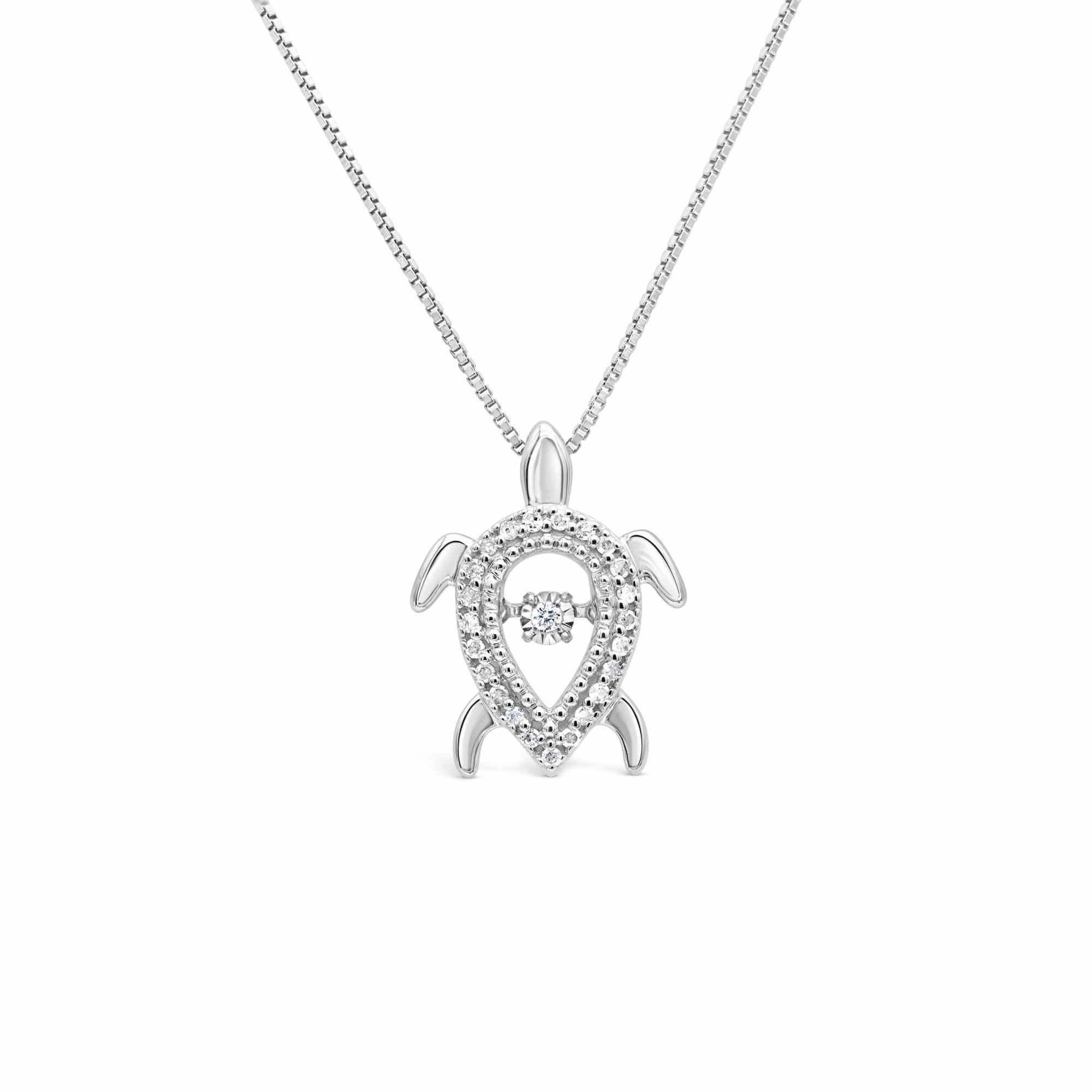 This delightful pendant features a Turtle with a diamond in the center that dances as you move. It also brings an 16 inch chain with a spring ring closure.