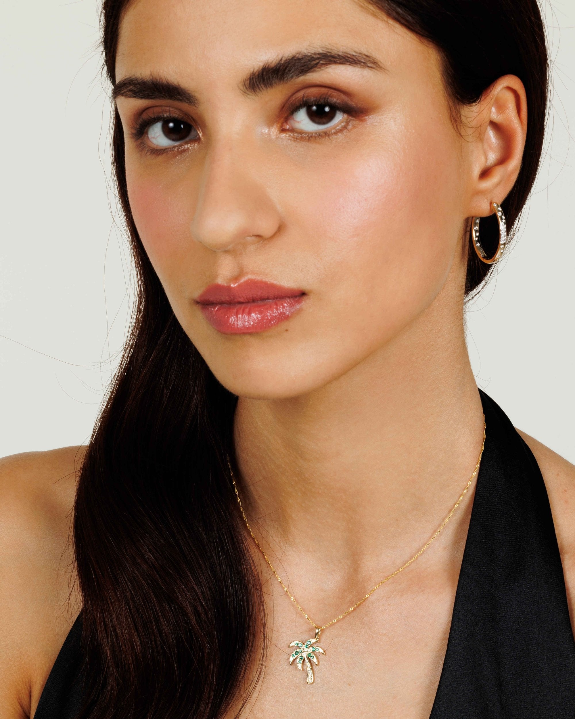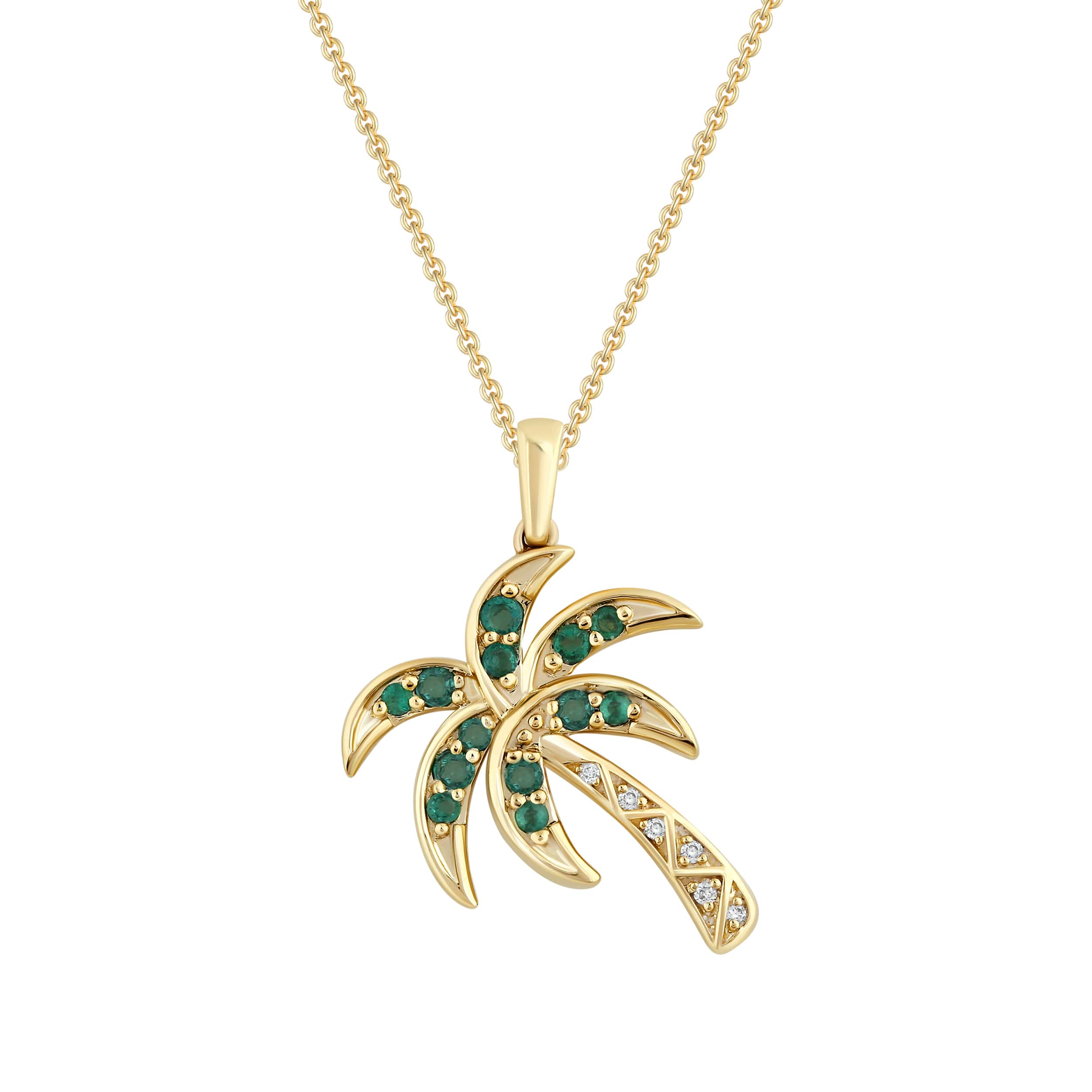 This stunning emerald and diamond pendant features a vibrant emerald set in luxurious yellow gold. The delicate palm tree design adds a touch of tropical elegance to any outfit. With the dazzling sparkle of diamonds, this pendant is sure to catch the eye and make a statement.