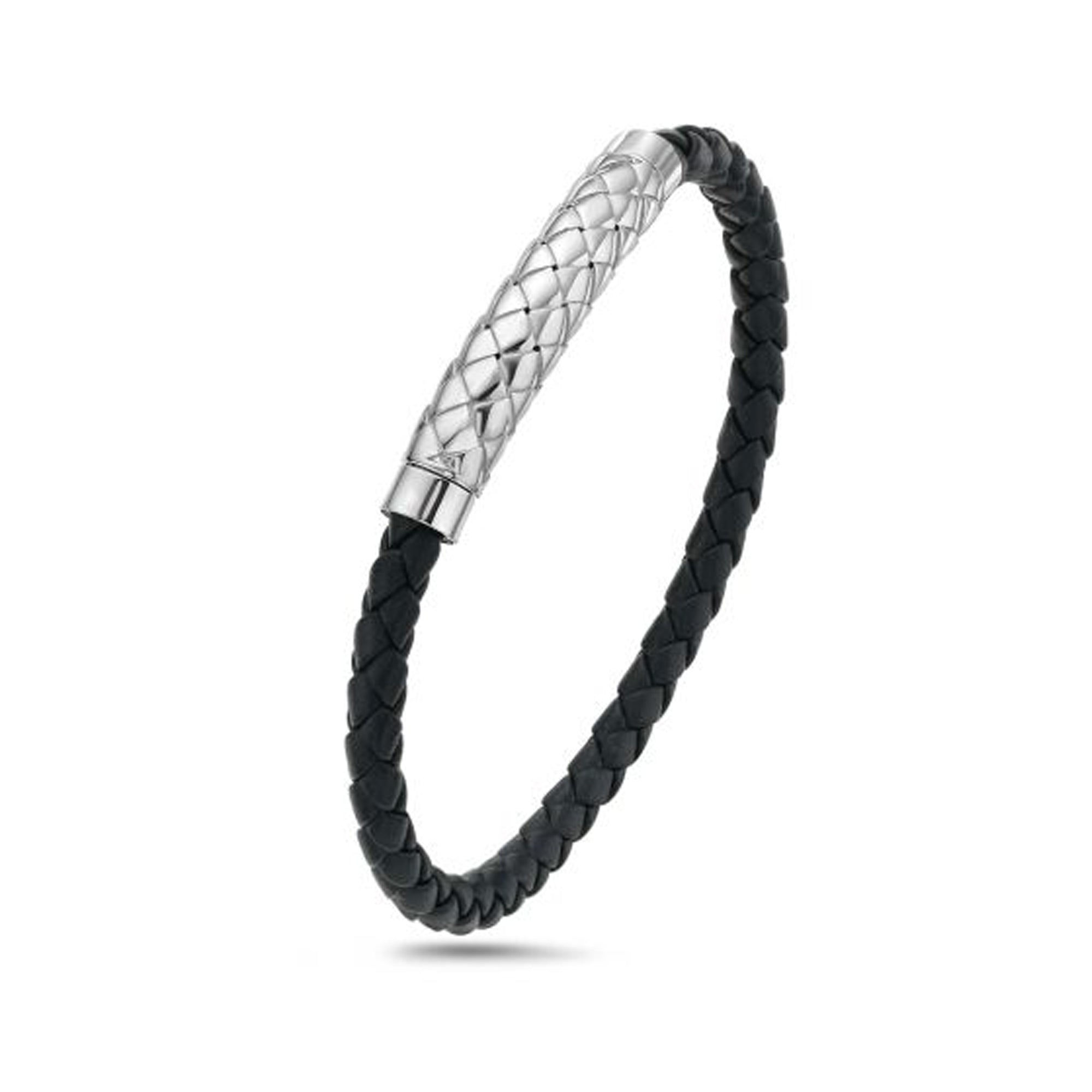 Sterling Silver 8.5" with Rhodium Finish Polished Woven Black Leather Bangle Bracelet with Magnetic Clasp