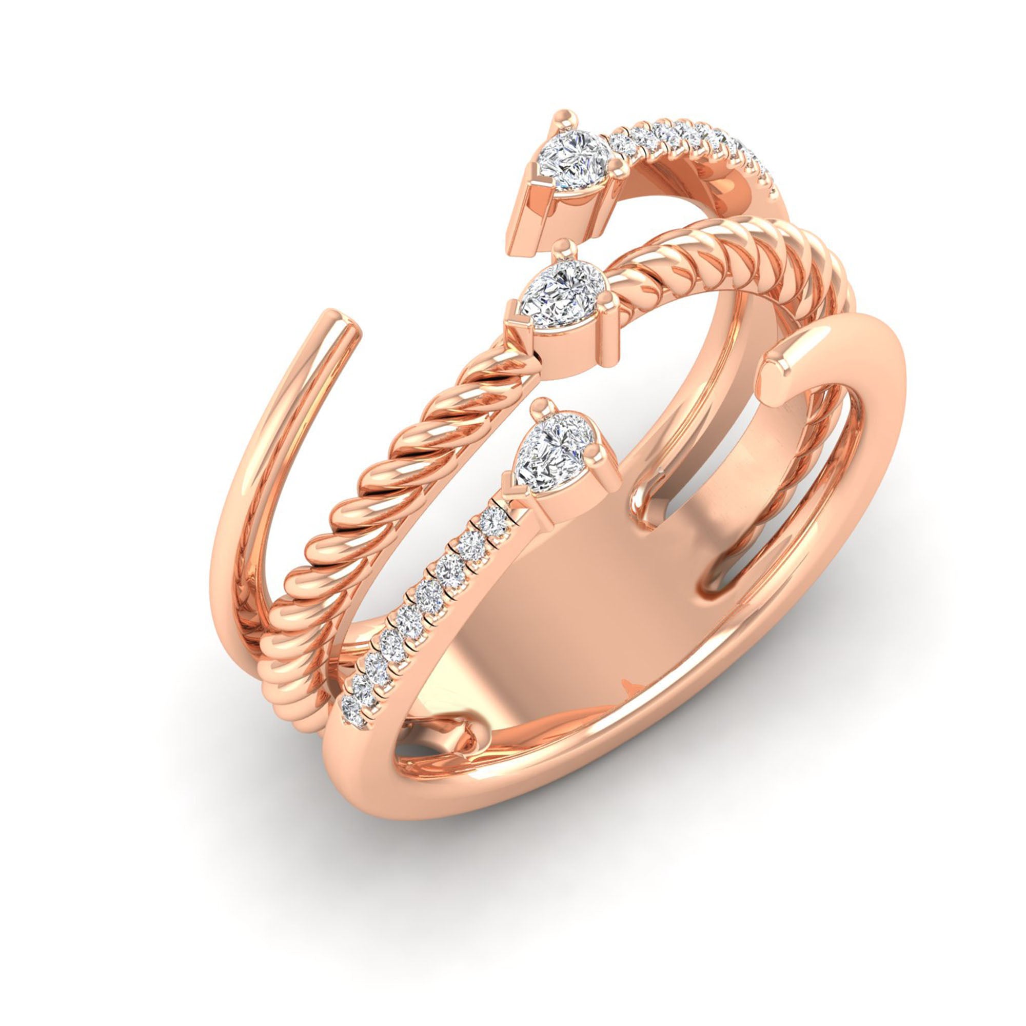 This elegant ring features a unique twisted triple layer design, accentuated by stunning bezel-set pear diamonds. Crafted with precision and expertise, this piece adds a touch of sophistication to any outfit.