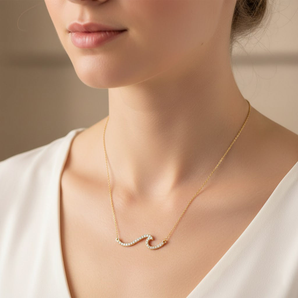 Catch the sparkle wave! This dazzling necklace features lab grown diamonds cleverly arranged in a flowing, ripple pattern that mimics ocean waves. The continuous diamond cascade creates a playful shimmer that dances with your every move!