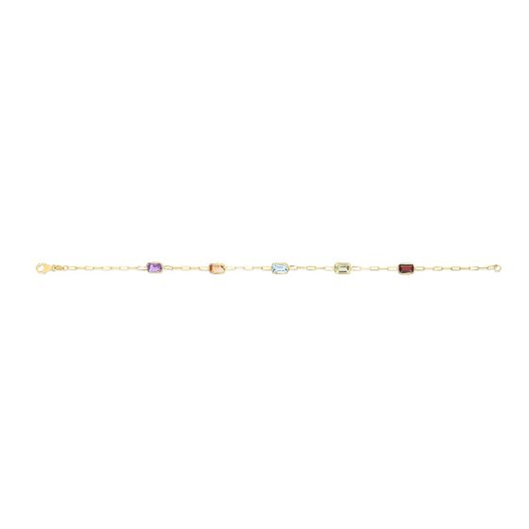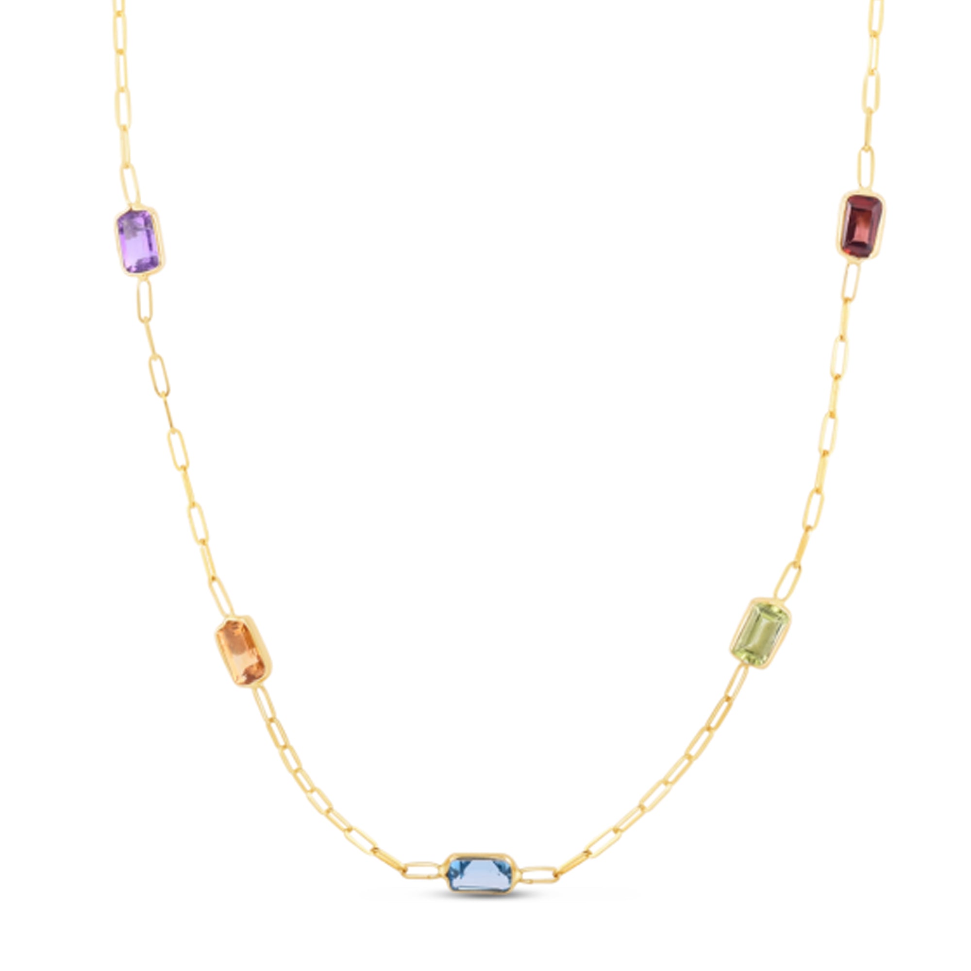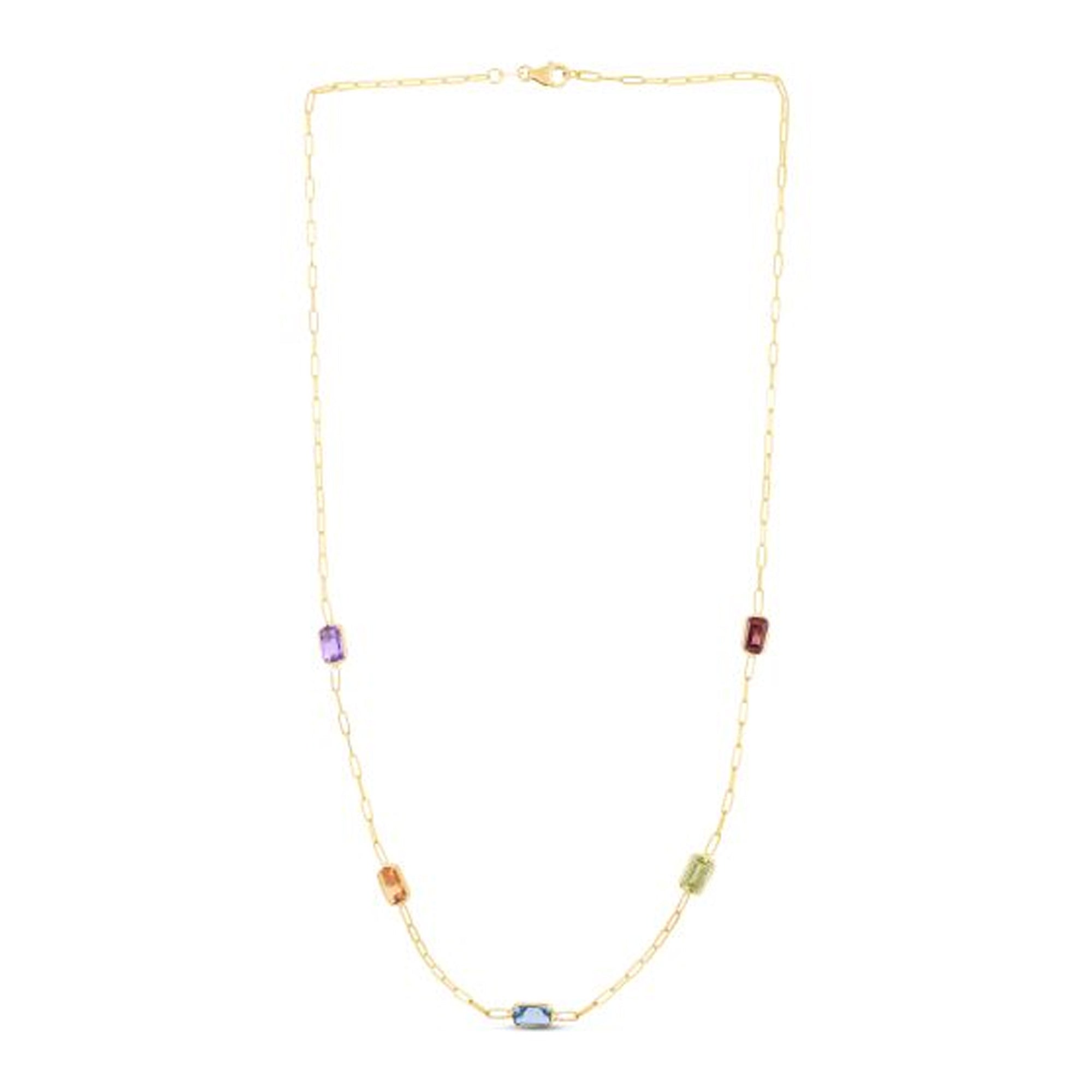 This playful 14K gold paperclip chain dazzles with a polished yellow finish and a pear-shaped lobster clasp. It’s decorated with six 4x6mm baguette-cut gemstones in garnet, peridot, blue topaz, citrine, and amethyst, bringing a colorful sparkle to your style.