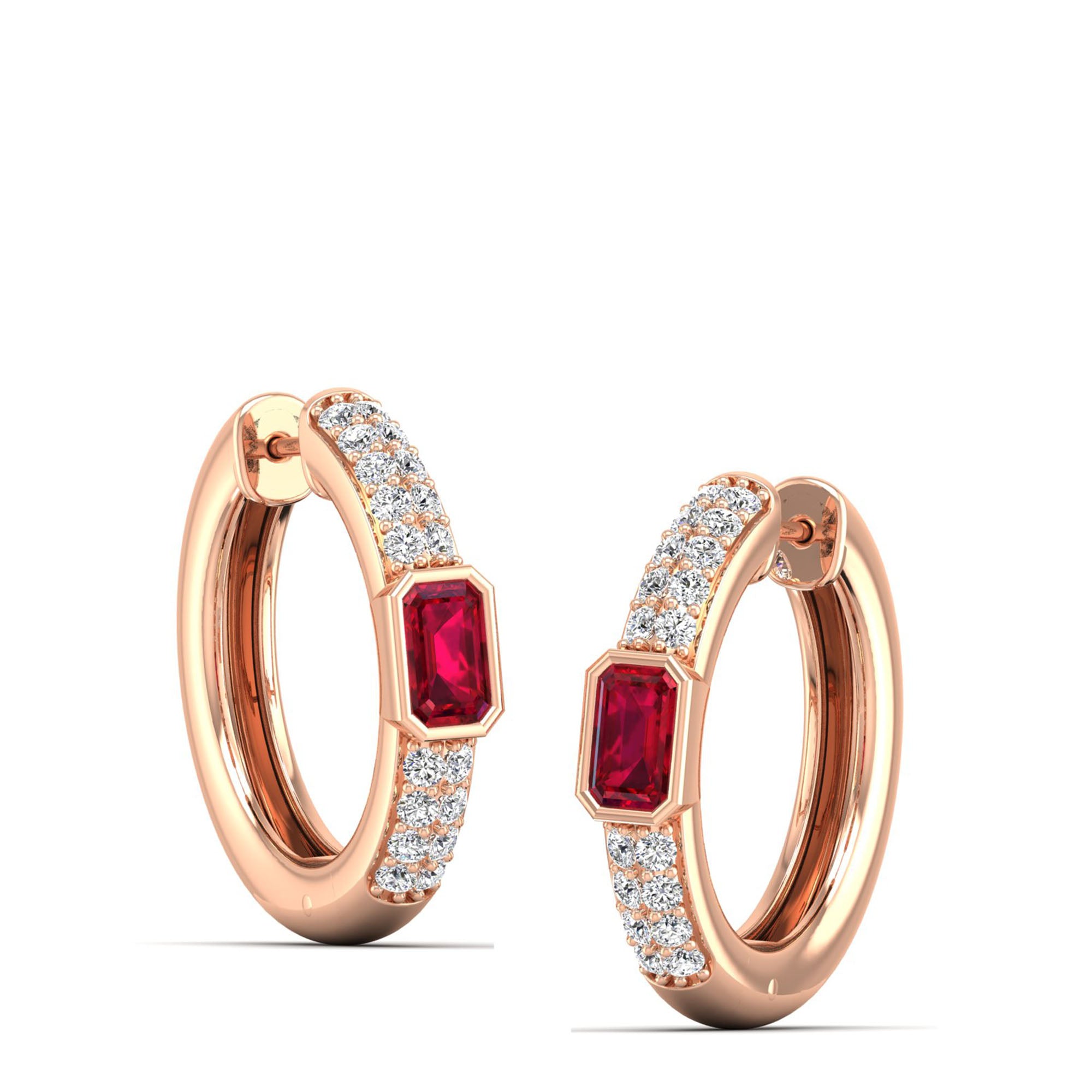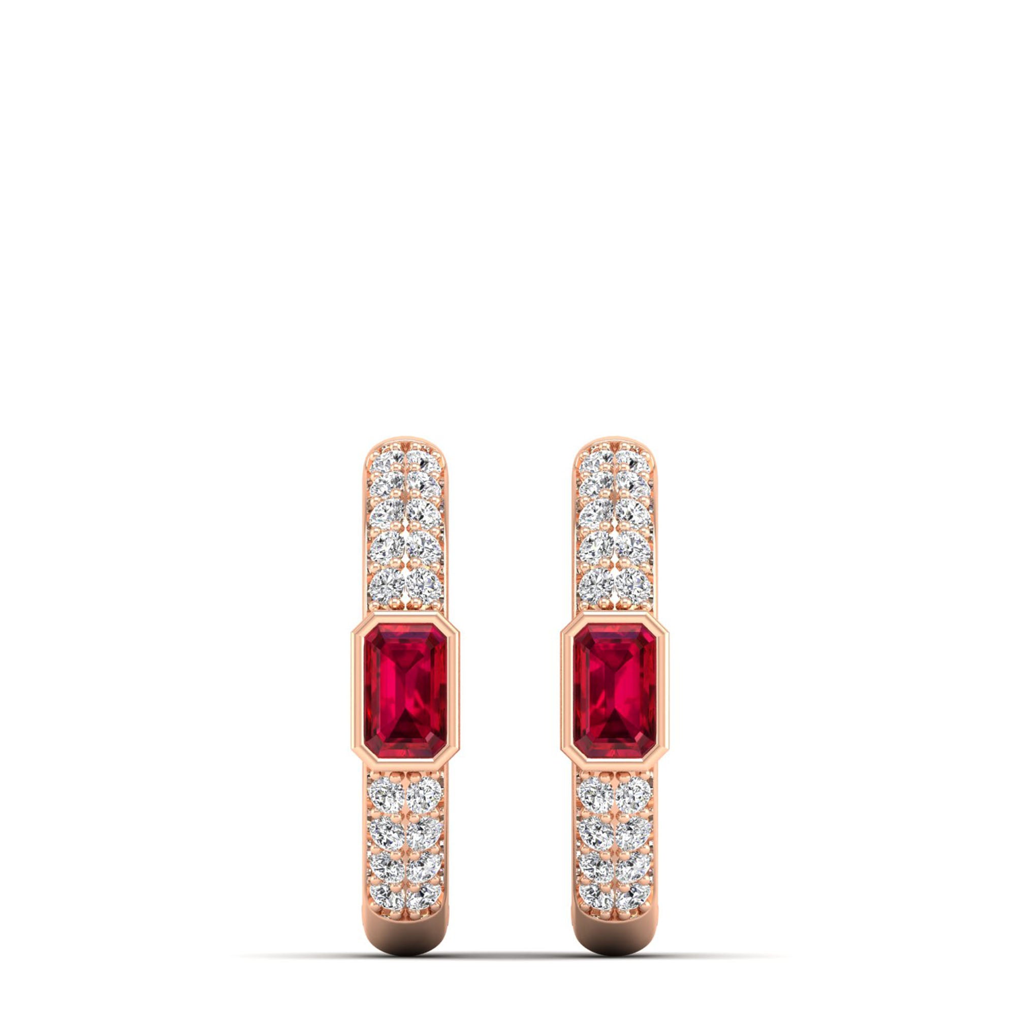These exceptional hoops feature emerald-cut rubies secured in precision-engineered bezel settings, complemented by a double row of meticulously calibrated diamonds.