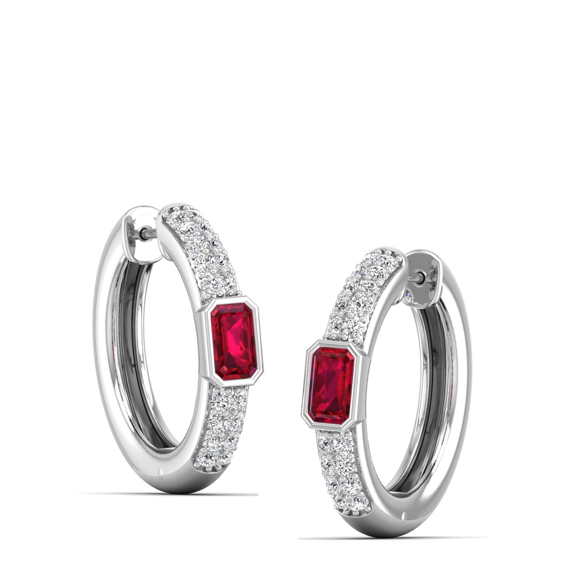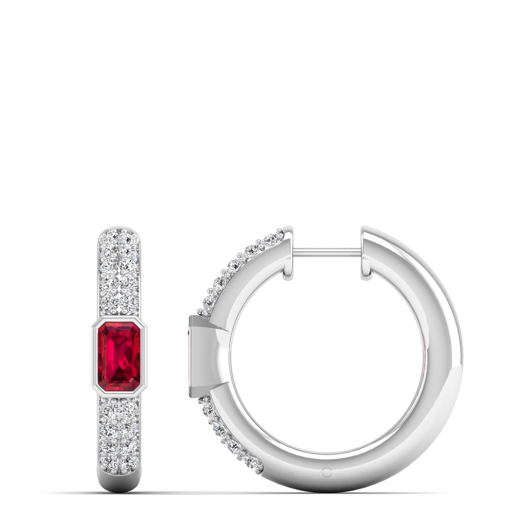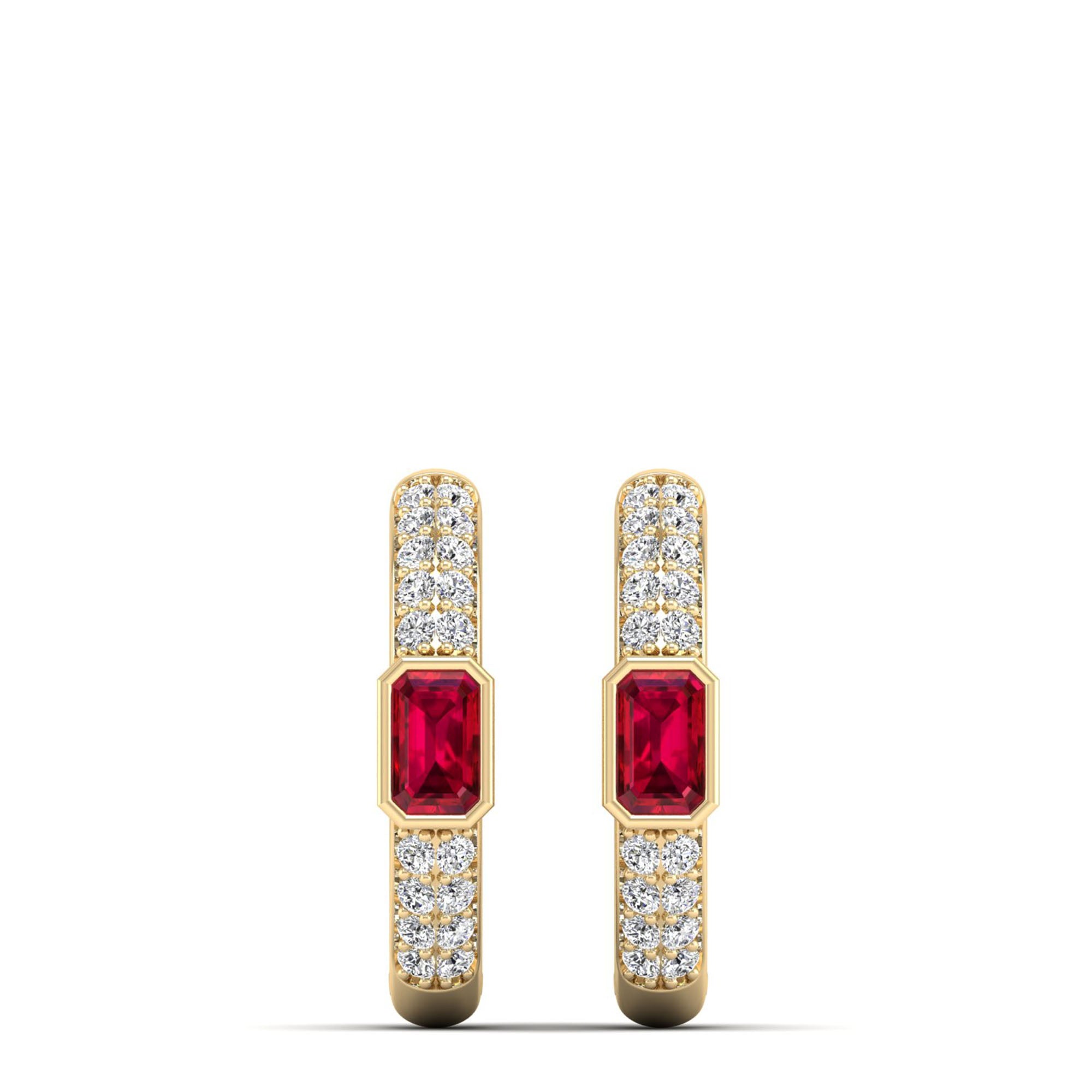 Emerald Cut Bezel-Set Ruby and Double Row Diamond Hoops