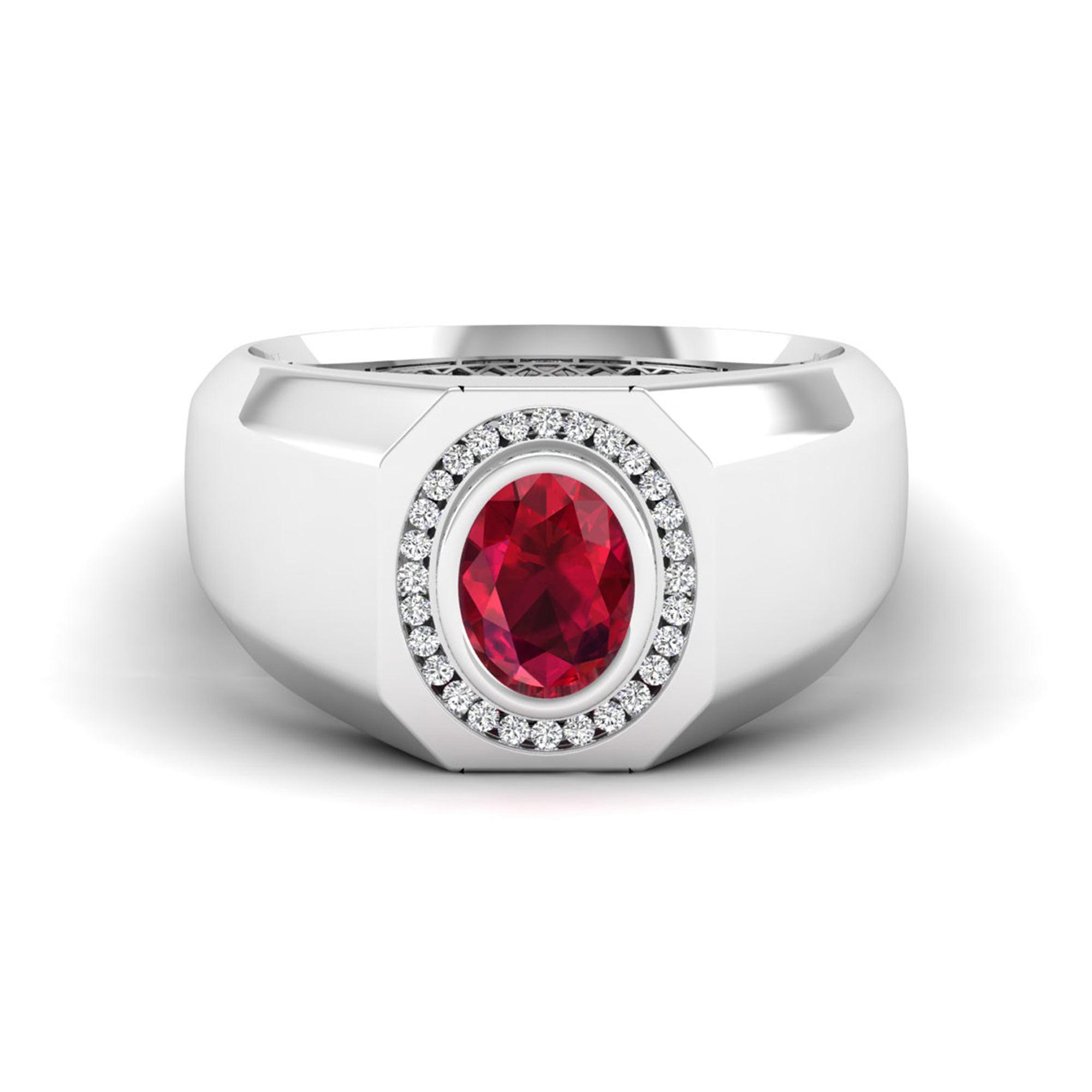 This distinguished Men's Oval Ruby Bezel-Set Halo Diamond Ring features a premium oval-cut ruby secured within a protective bezel setting, surrounded by a meticulous halo of brilliant-cut diamonds.