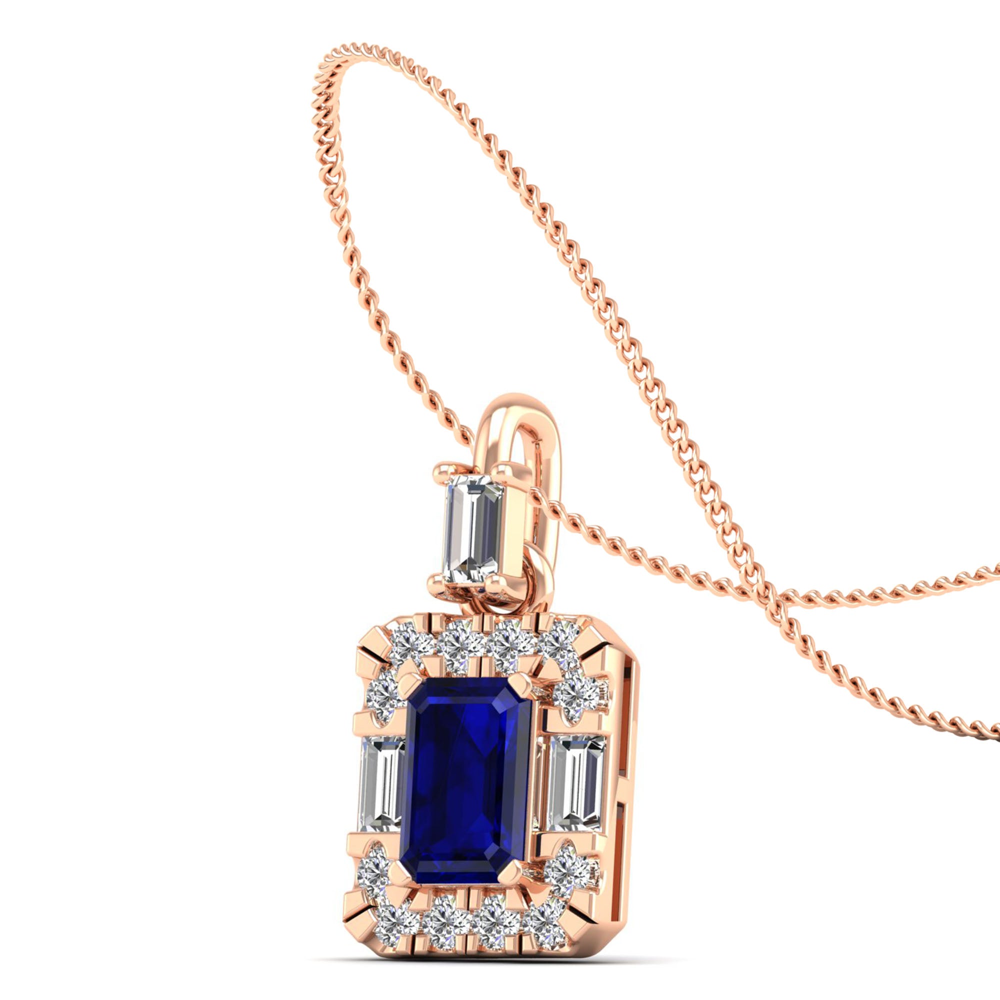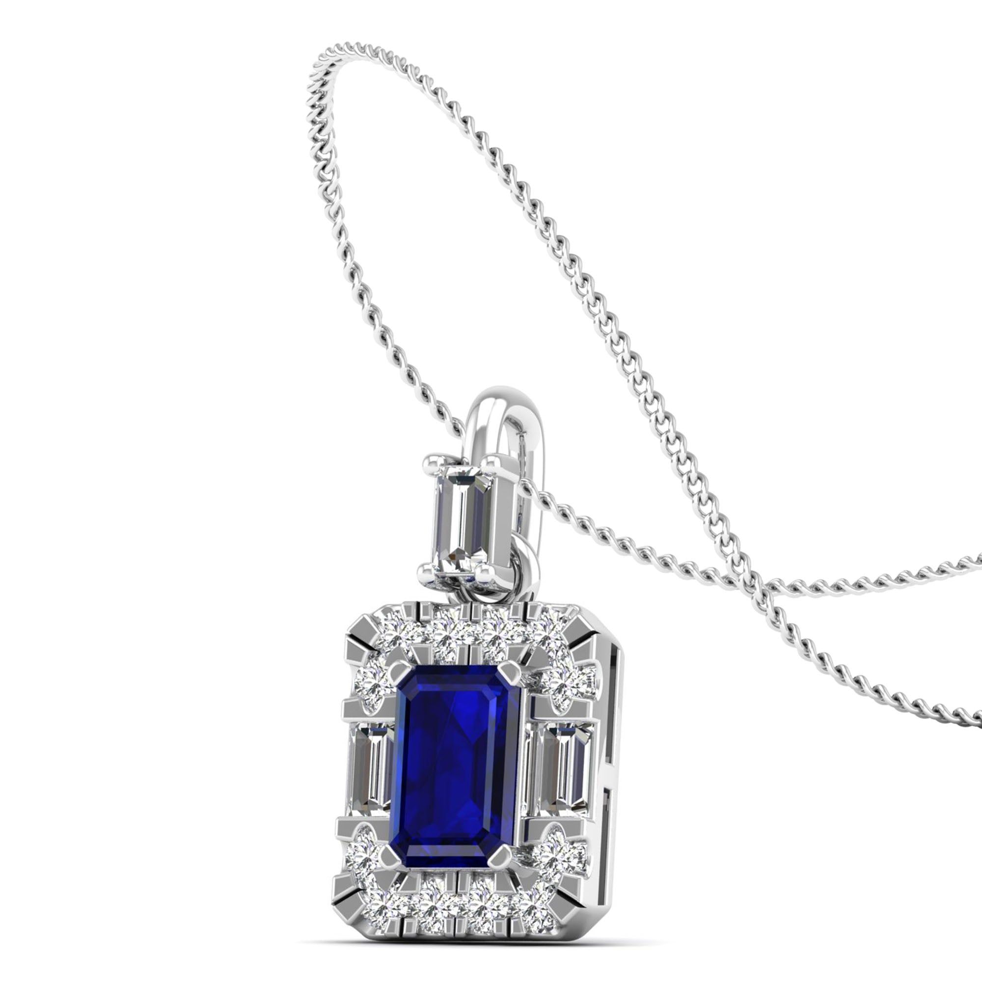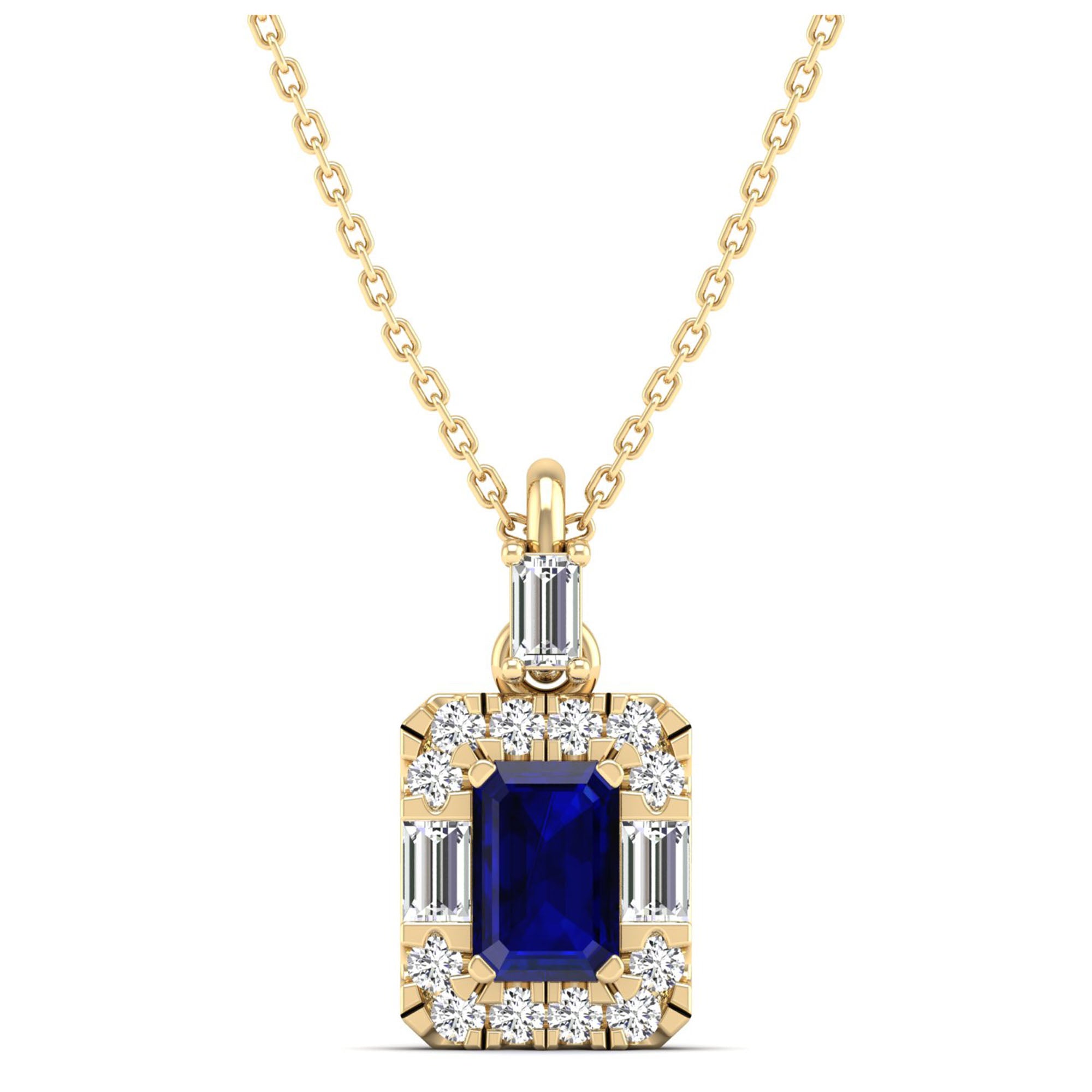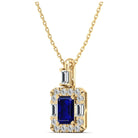 Elevate your style with our Sapphire Halo Baguette and Round Diamond Pendant. Crafted from sparkling sapphires and shimmering diamonds, it adds a touch of elegance to any outfit.