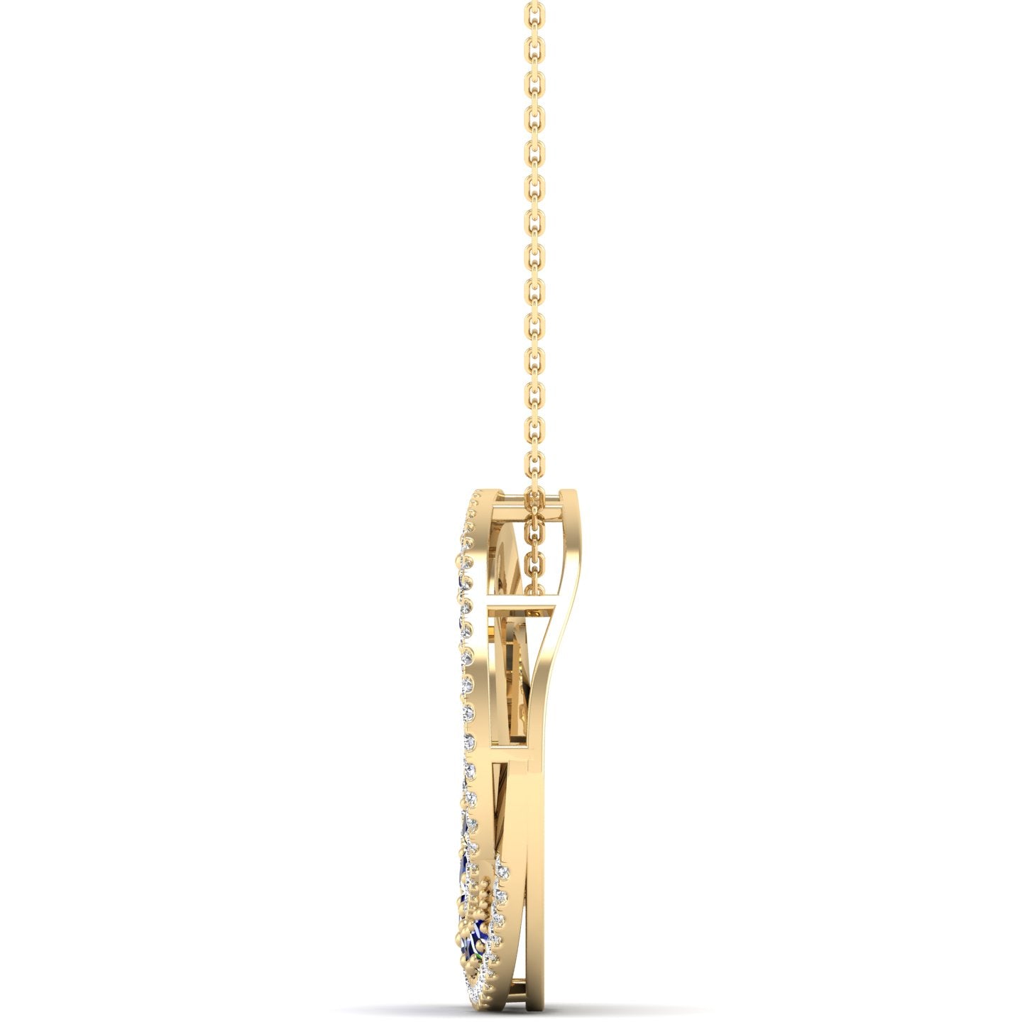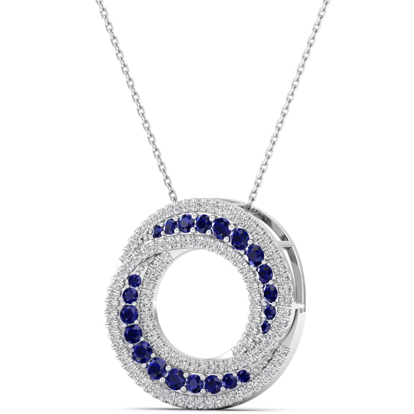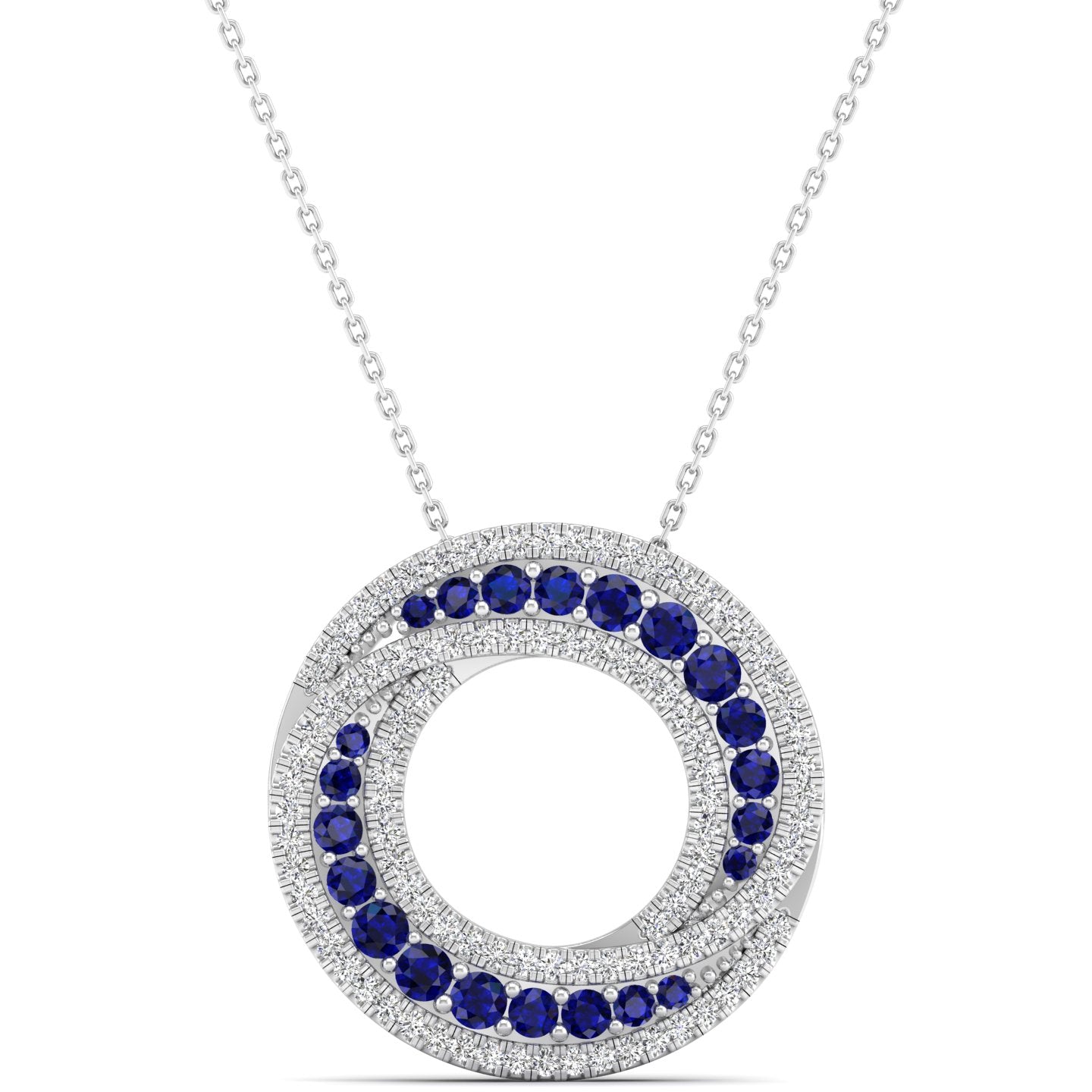 This Swirl Halo Sapphire and Diamond Pendant features a stunning swirl design set with a brilliant sapphire and sparkling diamonds.
