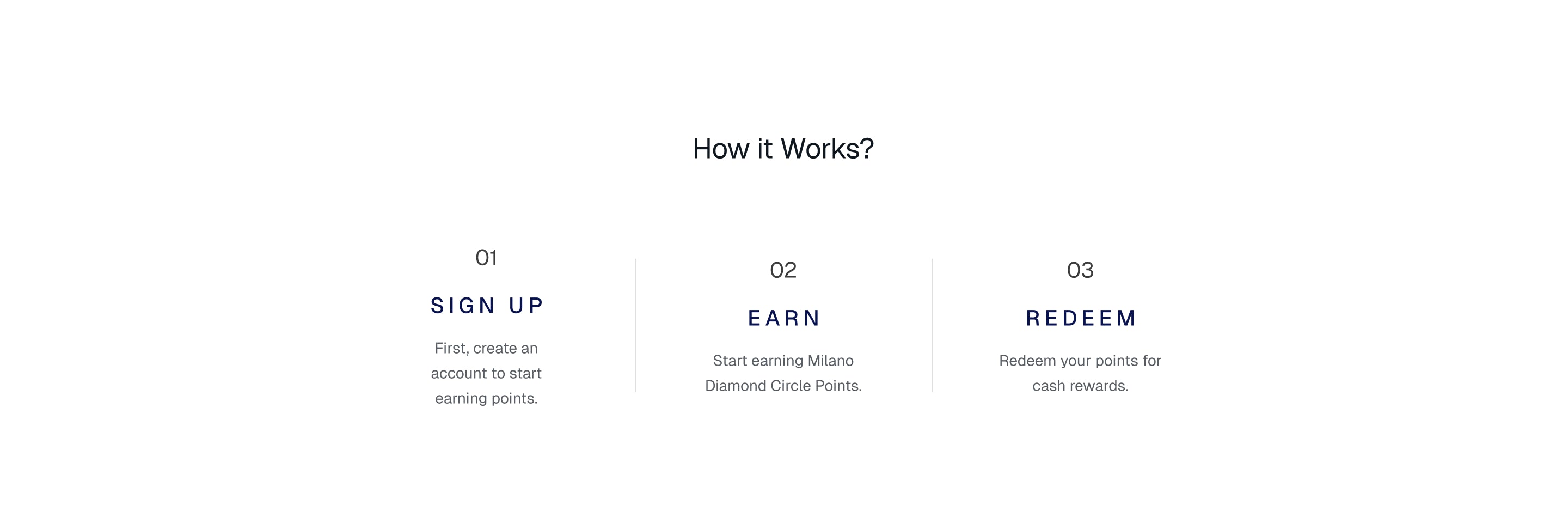 Milano Diamond Circle is available to all ShopMilano.com customers in the United States. Participation requires no initial purchase; however, rewards earned through the program may only be used on future purchases. To join, customers must create an account at www.shopmilano.com/register. Enrollment can occur during checkout or through the account creation page. Customers with existing accounts are automatically enrolled. Signing up for the Milano Diamond Circle does not require email or SMS subscription, but opting out of these communications may limit updates about eligible rewards and special offers. Customers who prefer not to participate can use the "checkout as guest" feature.
