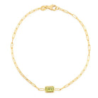 14K Yellow Gold 7" Gemstone Paperclip Bracelet with Lobster Clasp, featuring 6x4 baguette Peridot center element.
