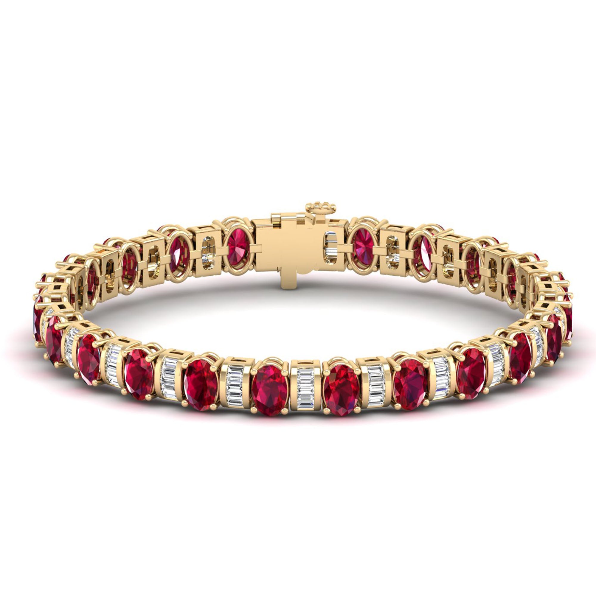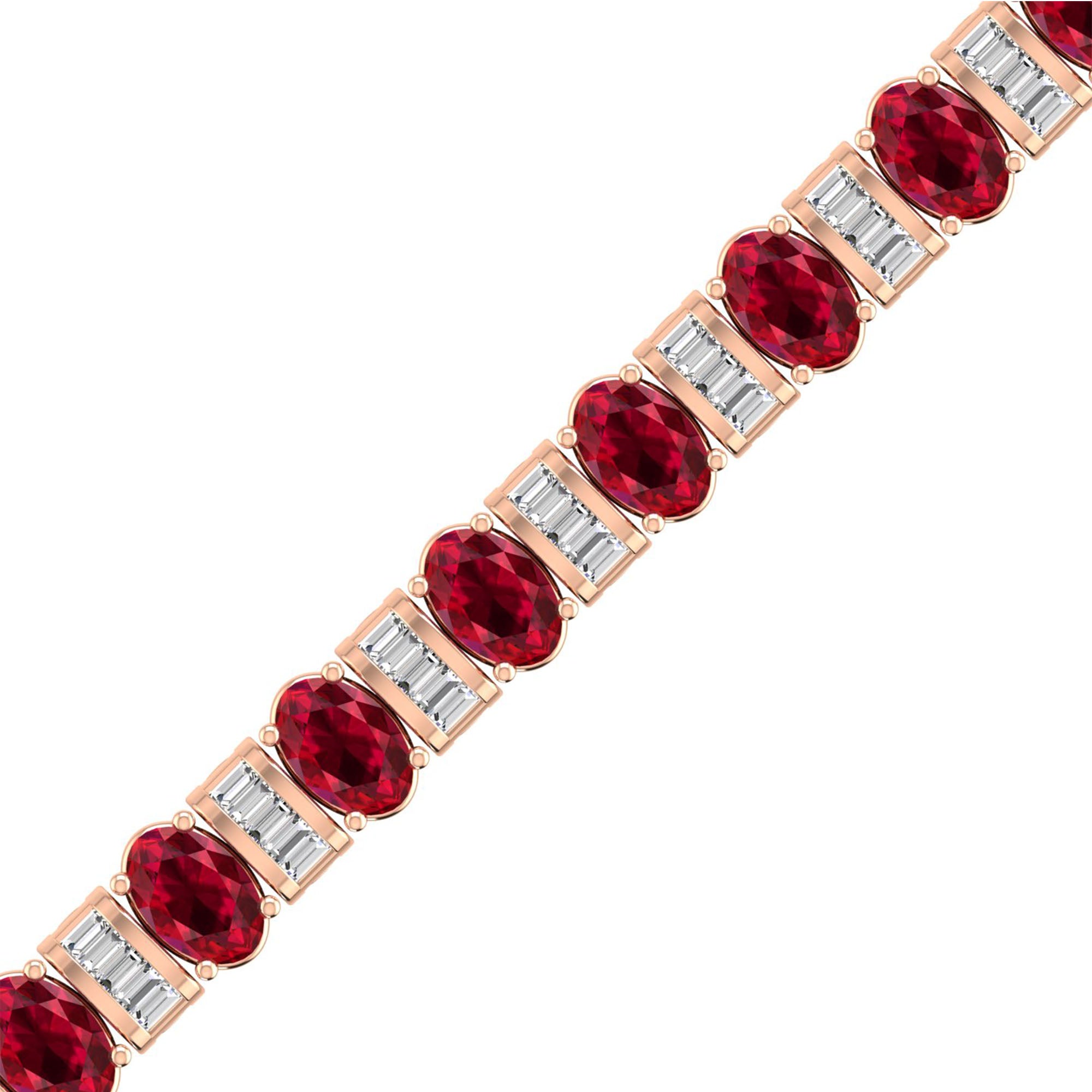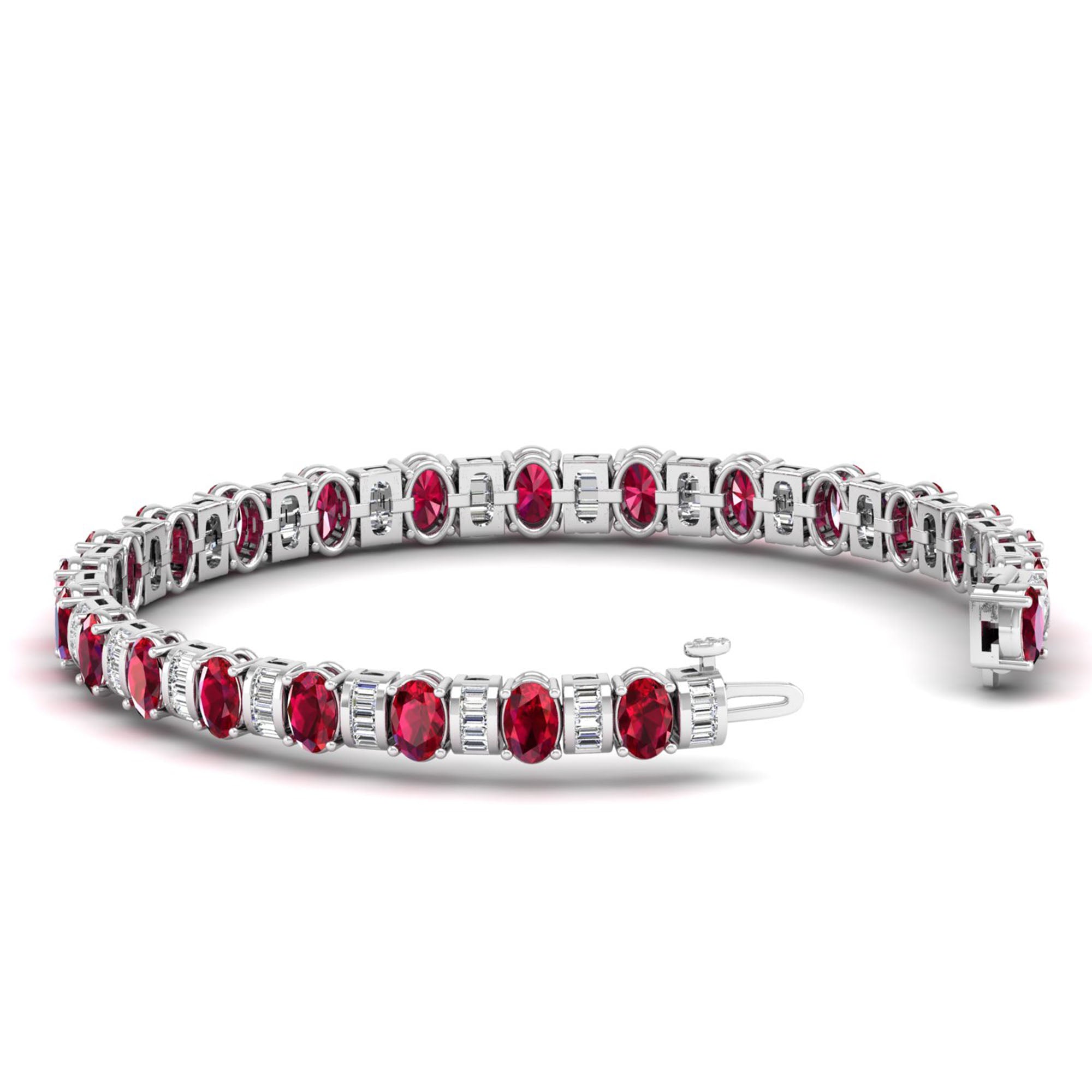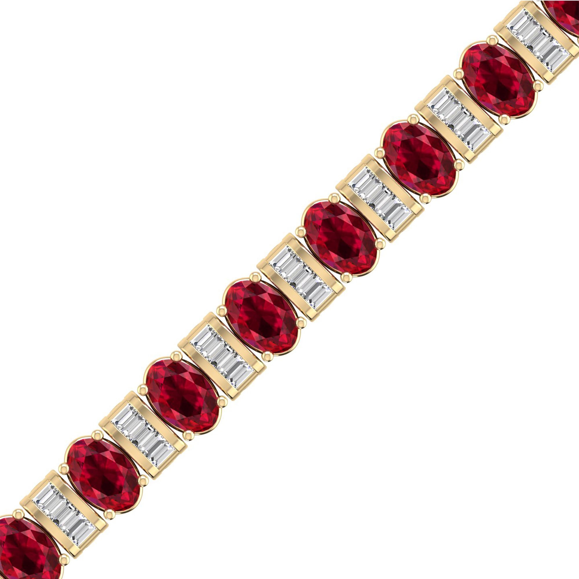 This elegant bangle features alternating oval ruby and baguette diamond stones, creating a stunning and unique design.