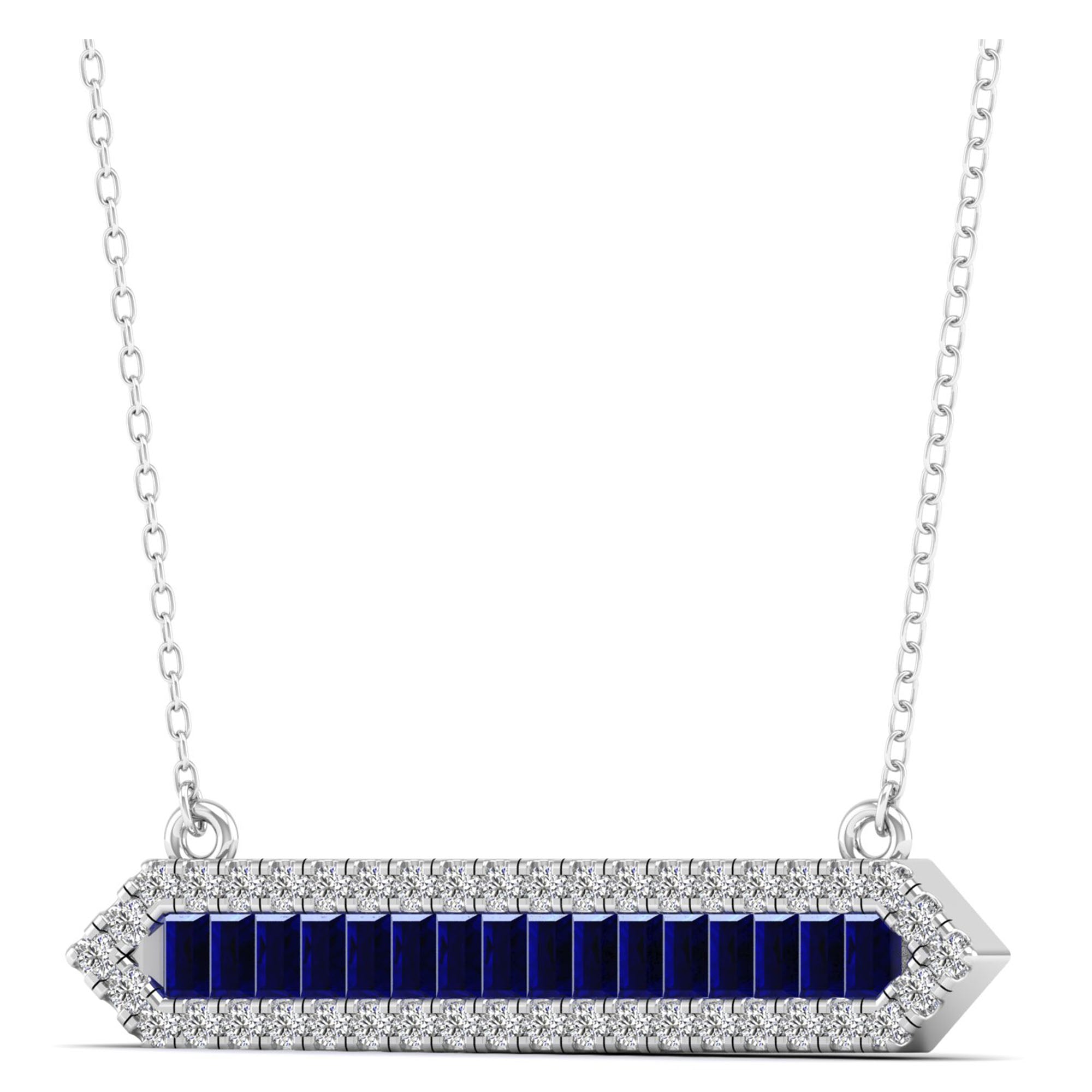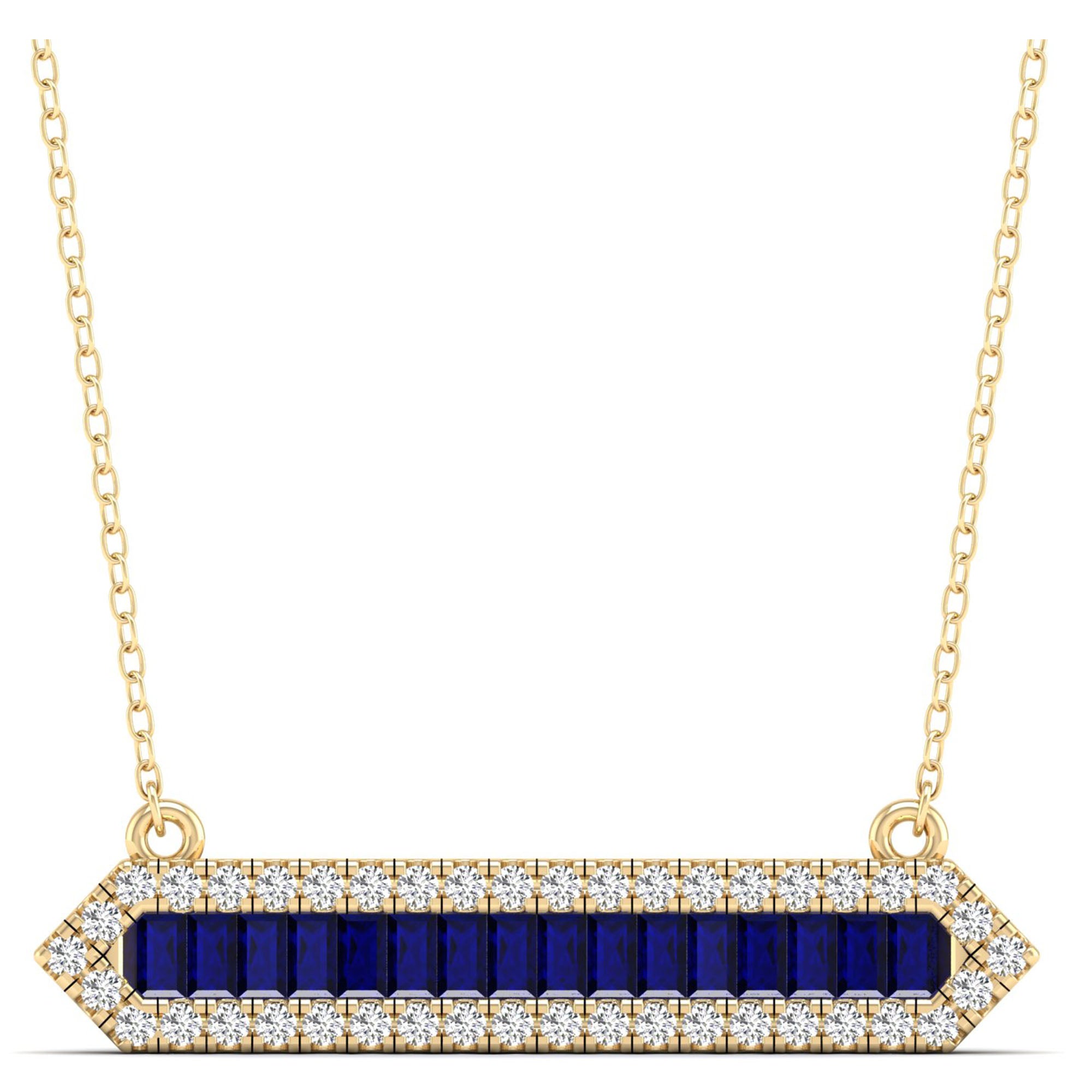 This elegant necklace features a stunning baguette sapphire surrounded by a halo of sparkling diamonds. With a bar design, it exudes sophistication and is perfect for both formal and casual occasions.