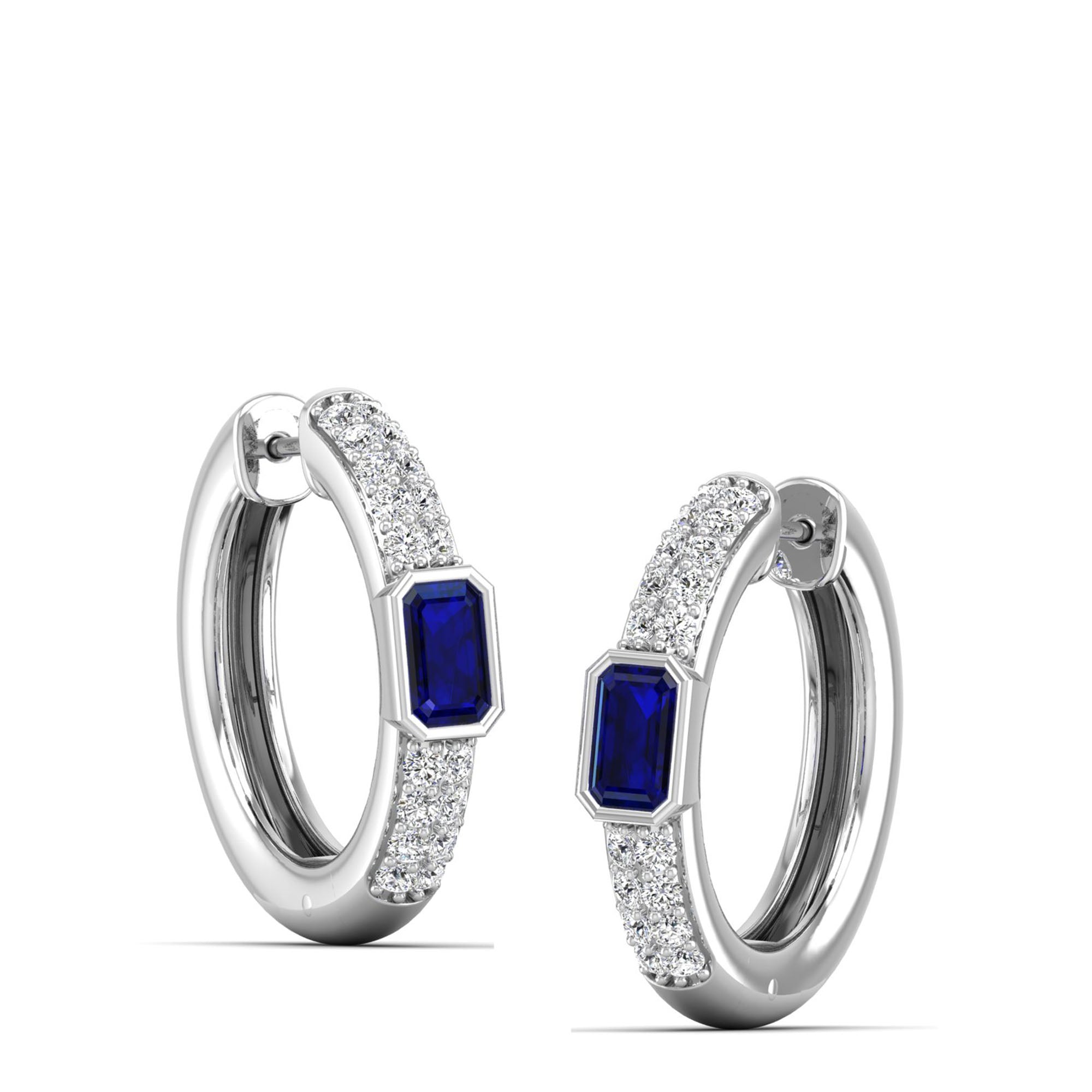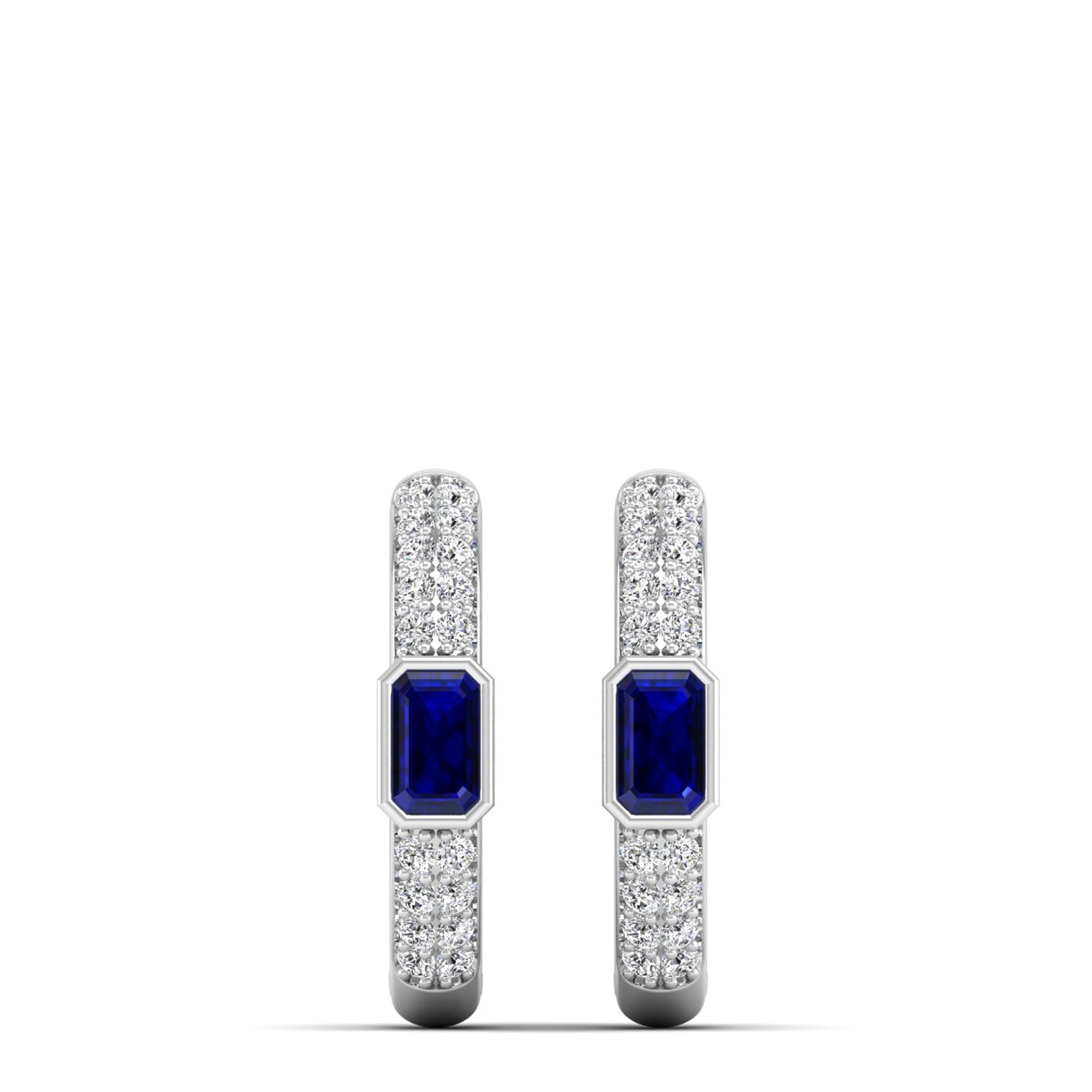 These sophisticated hoops feature emerald-cut sapphires secured in precision-engineered bezel settings, complemented by a double row of meticulously calibrated diamonds.