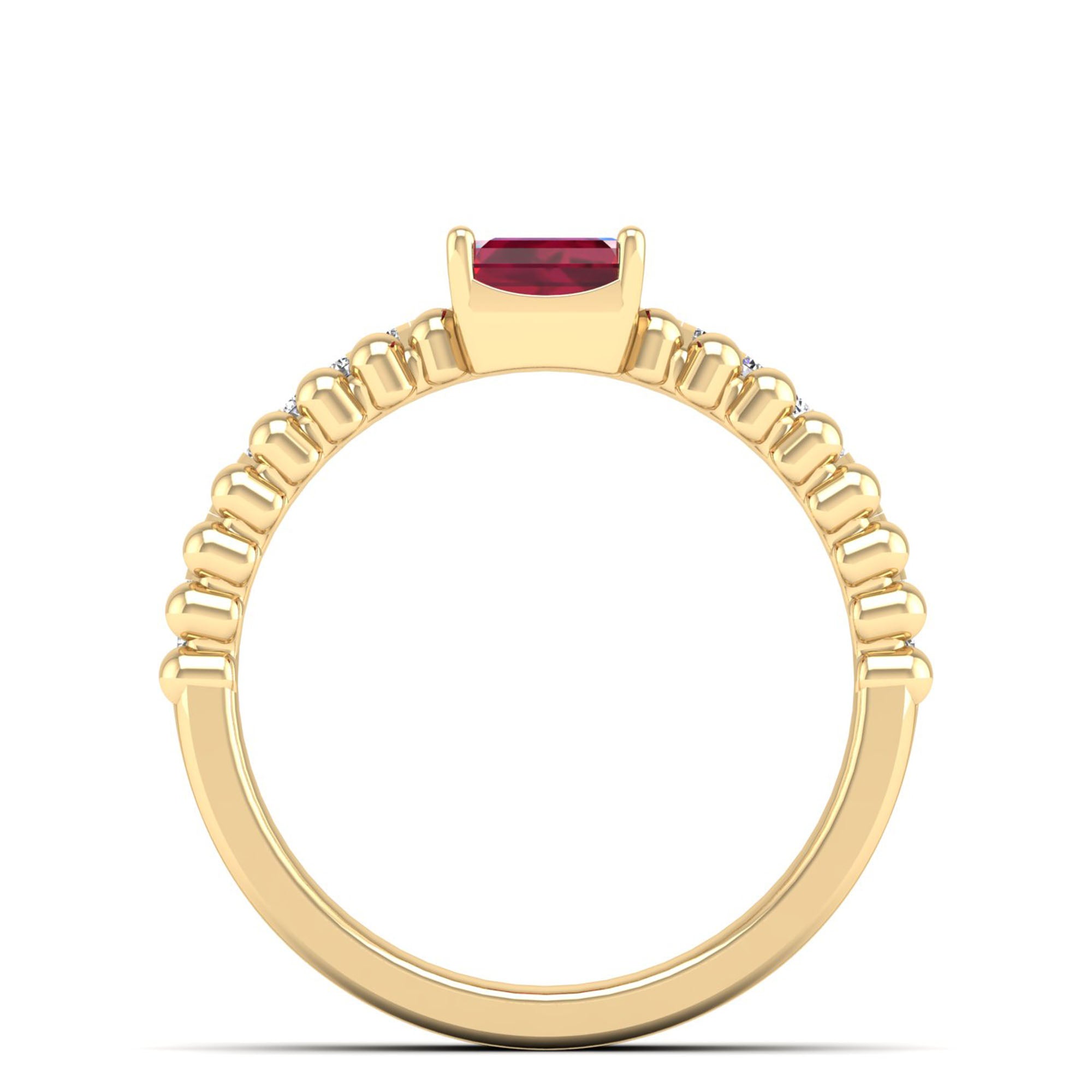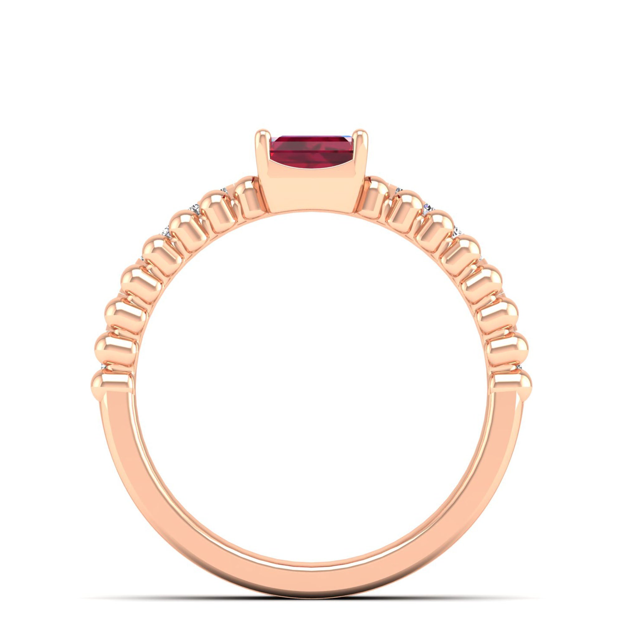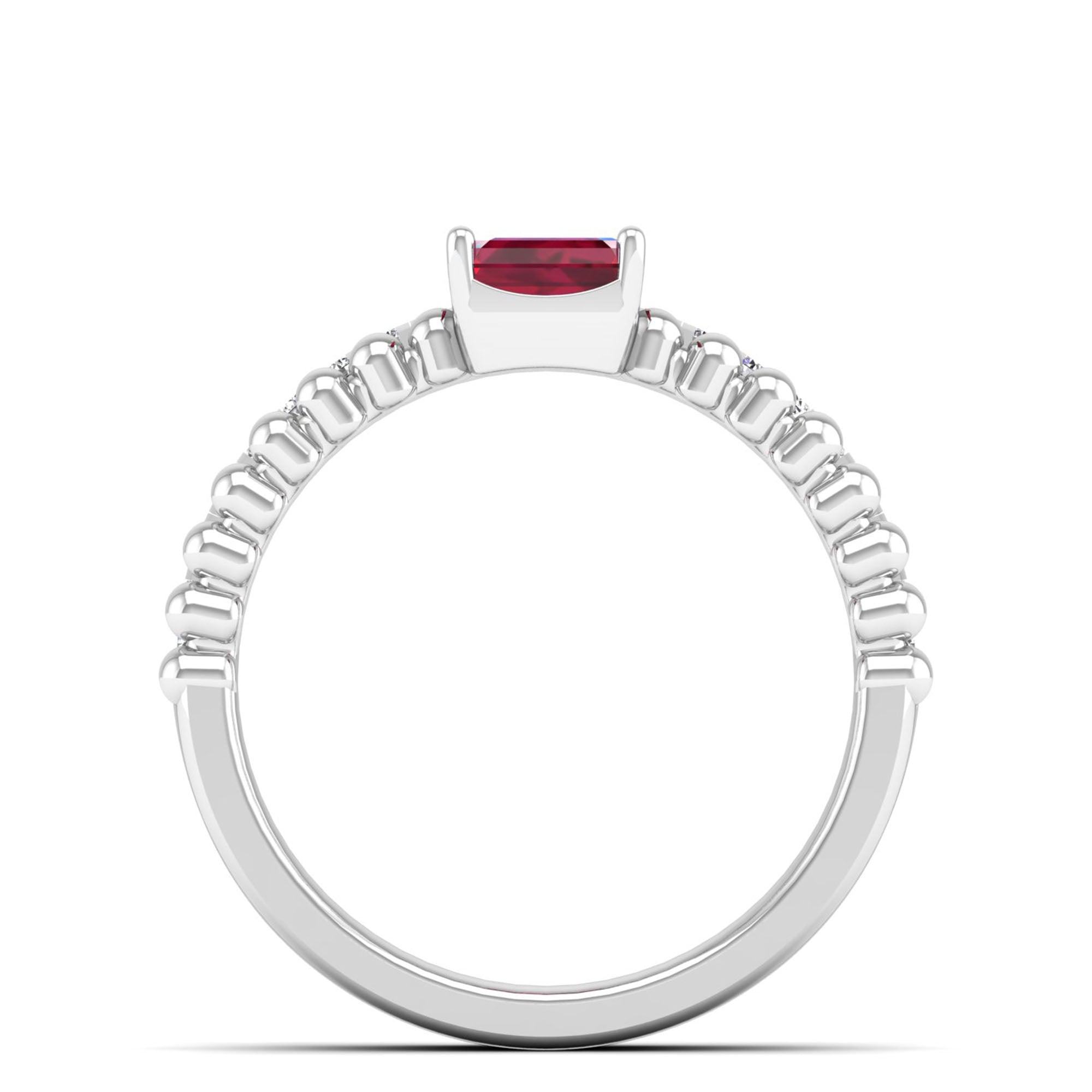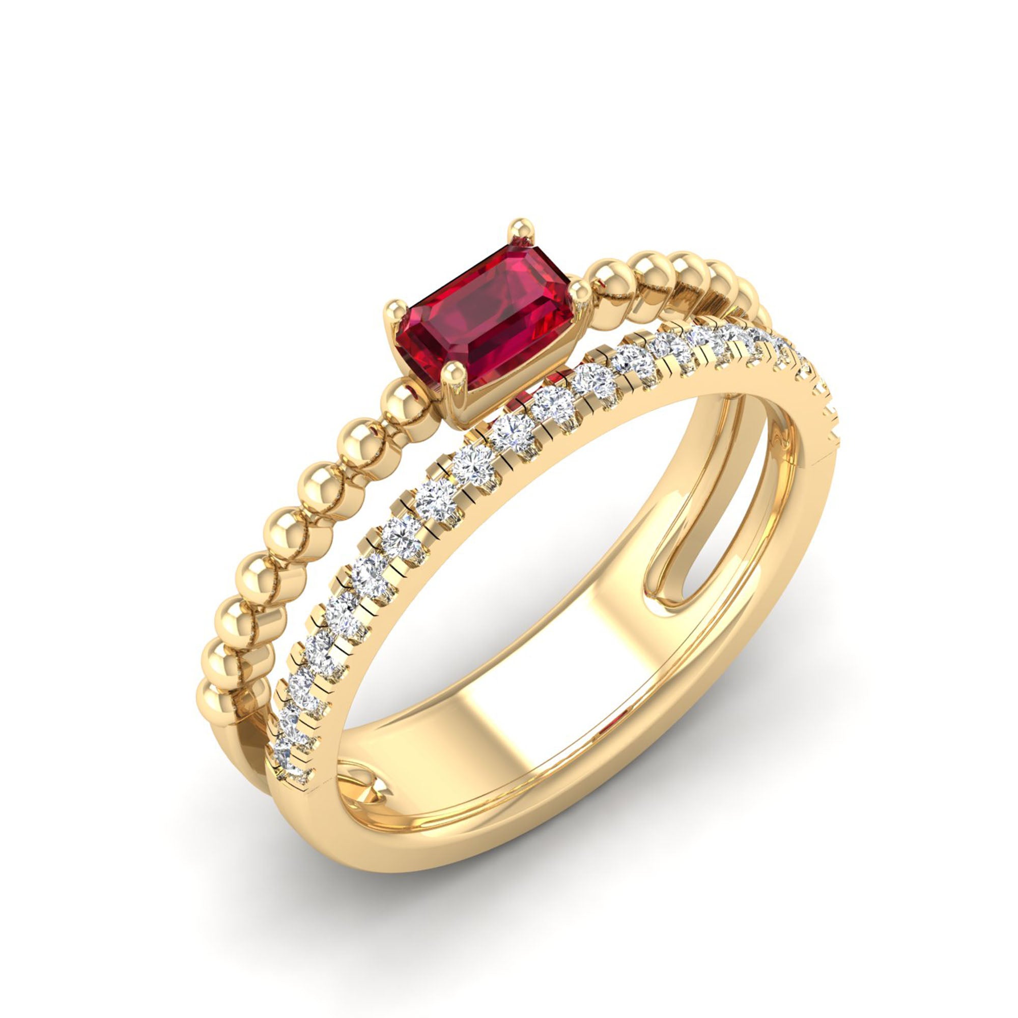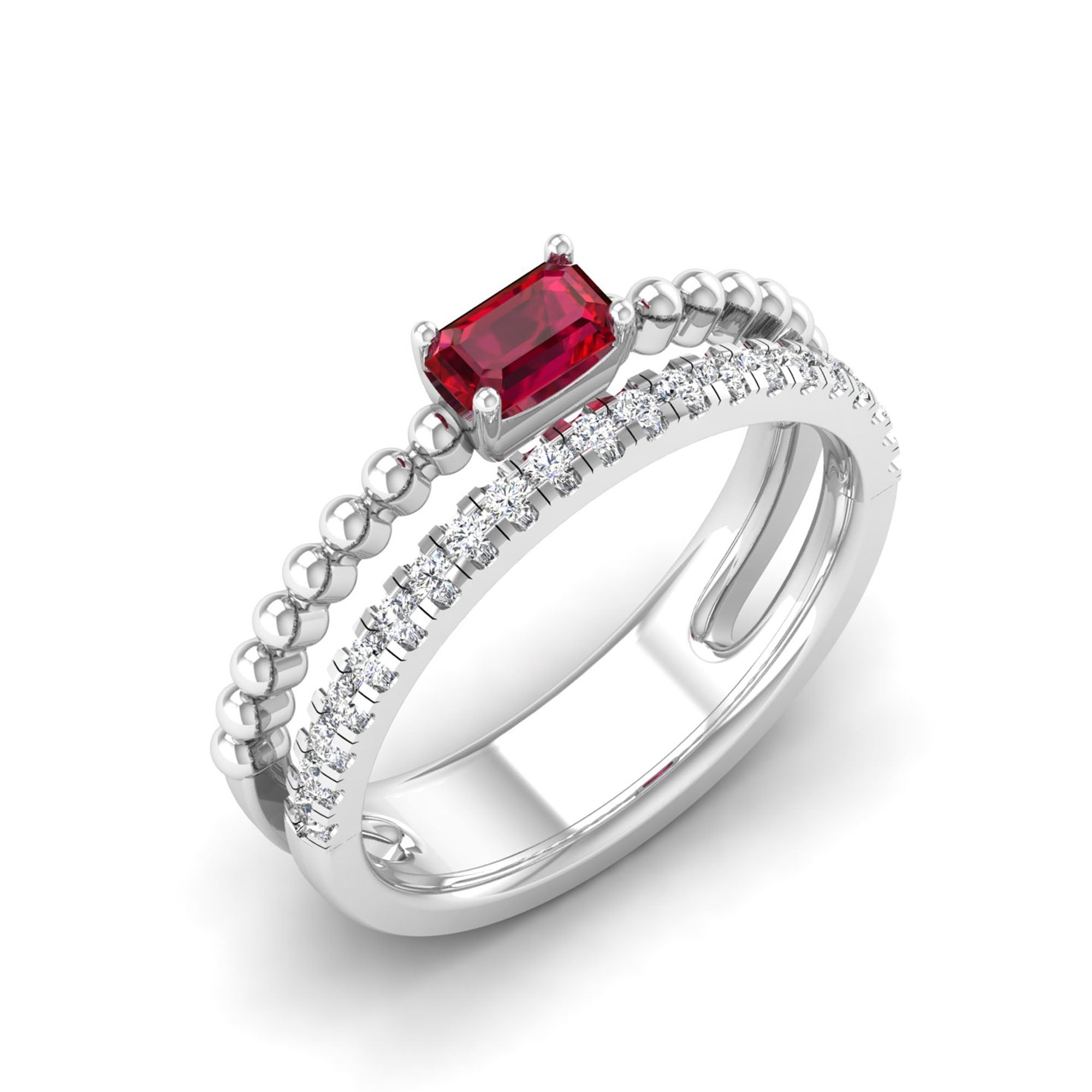 This stunning Emerald Cut East-West Ruby and Diamond Ring features a bold, unique design that is sure to make a statement. The brilliant emerald cut ruby is complemented by sparkling diamonds on either side, creating a timeless and elegant look.