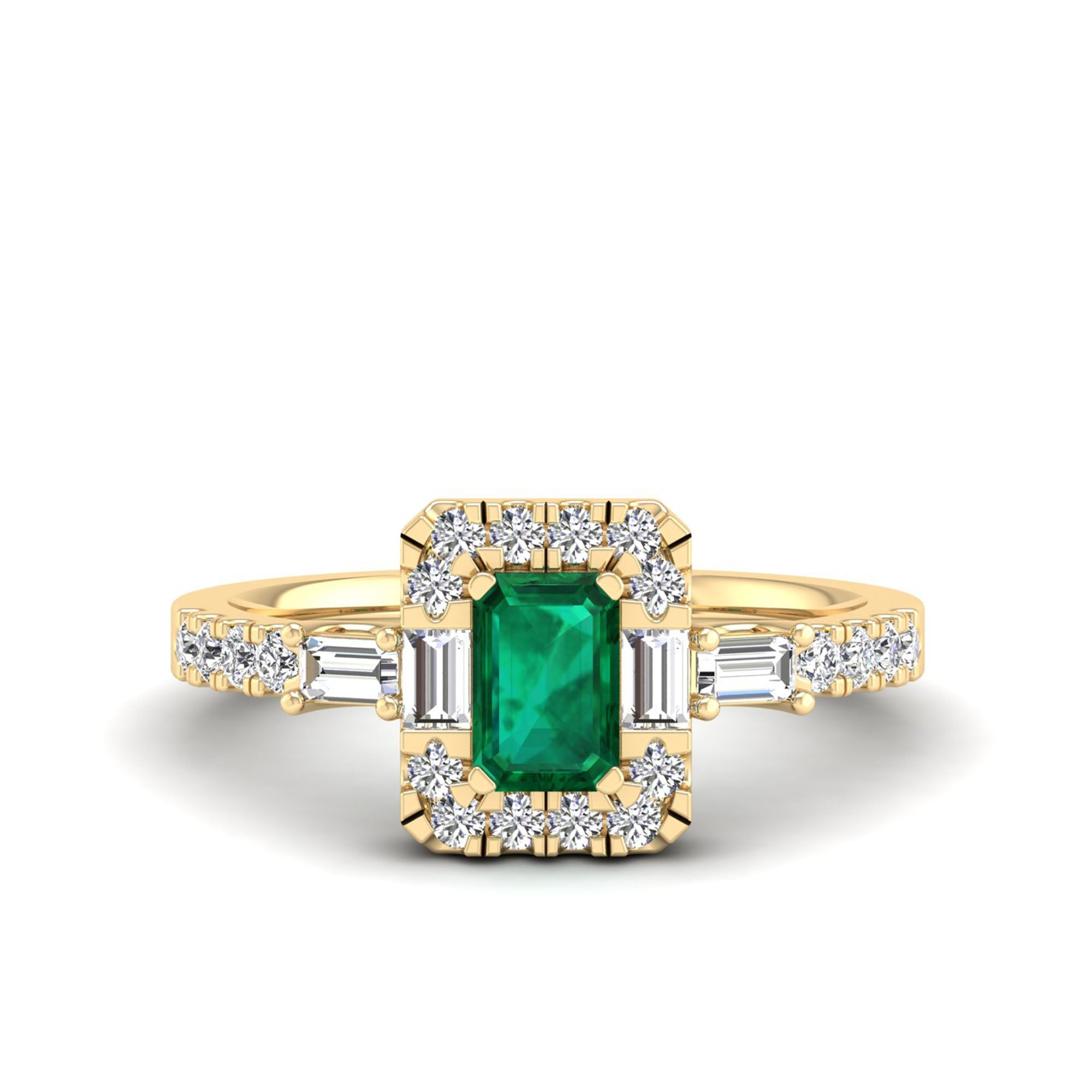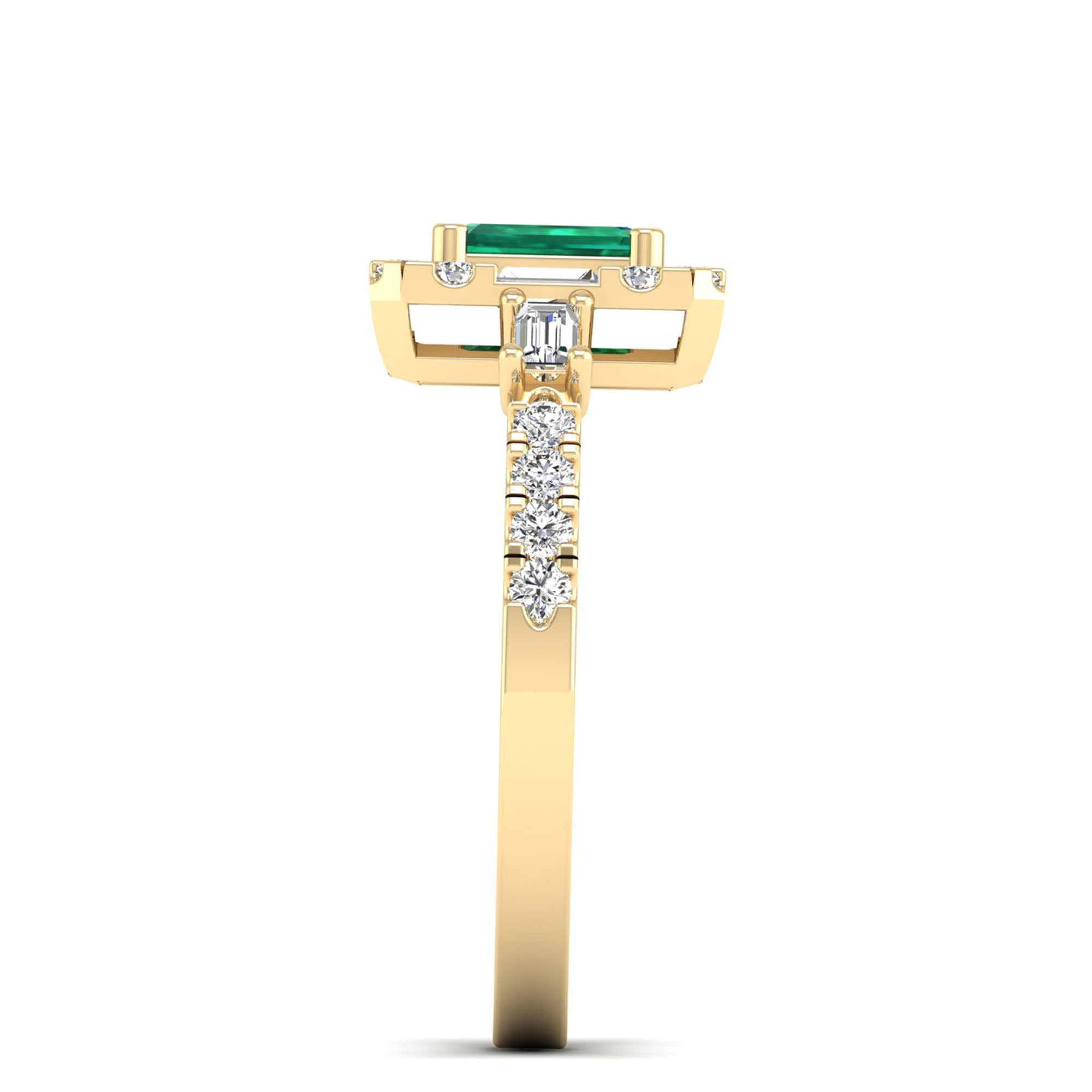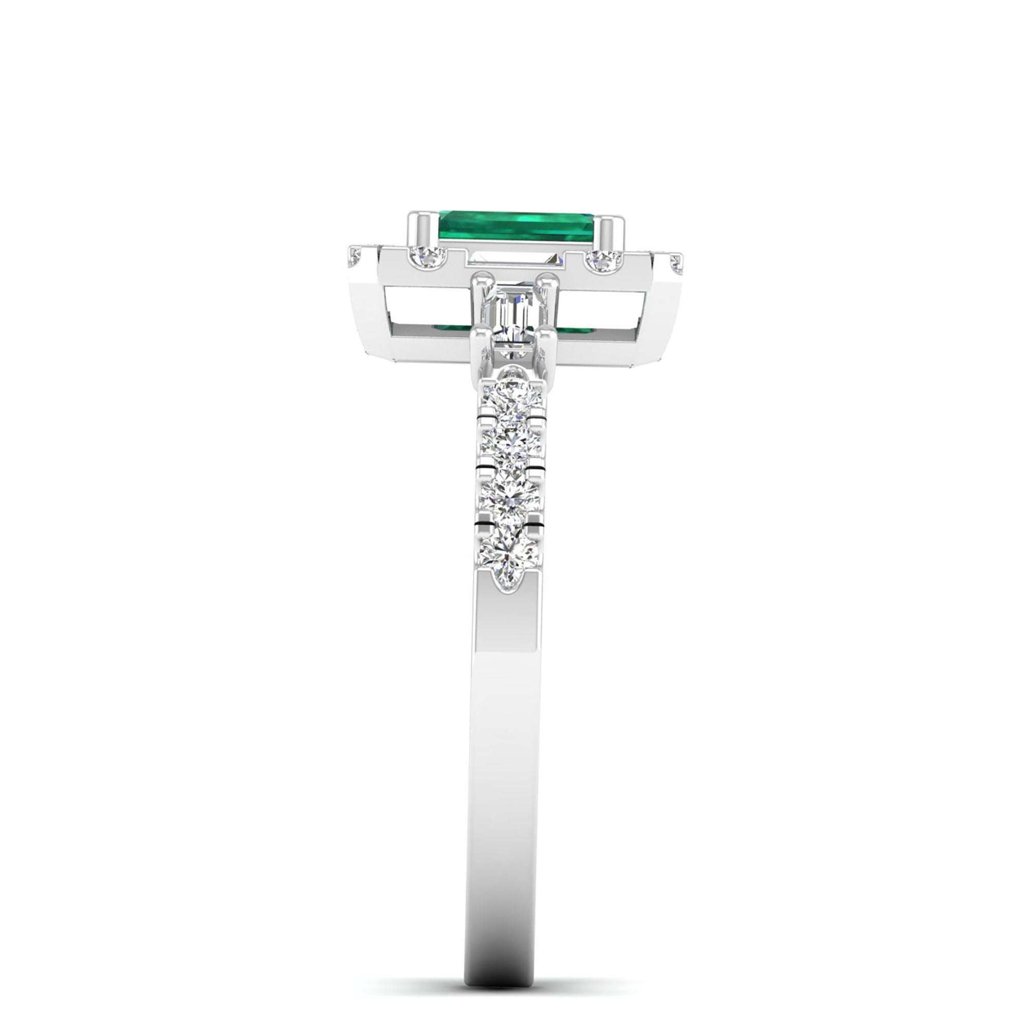 This elegant ring features a stunning octagon cut emerald, accented by round and baguette cut diamonds. The emerald's unique shape and vibrant color make it a sophisticated and eye-catching choice, while the diamonds add sparkle and luxury.