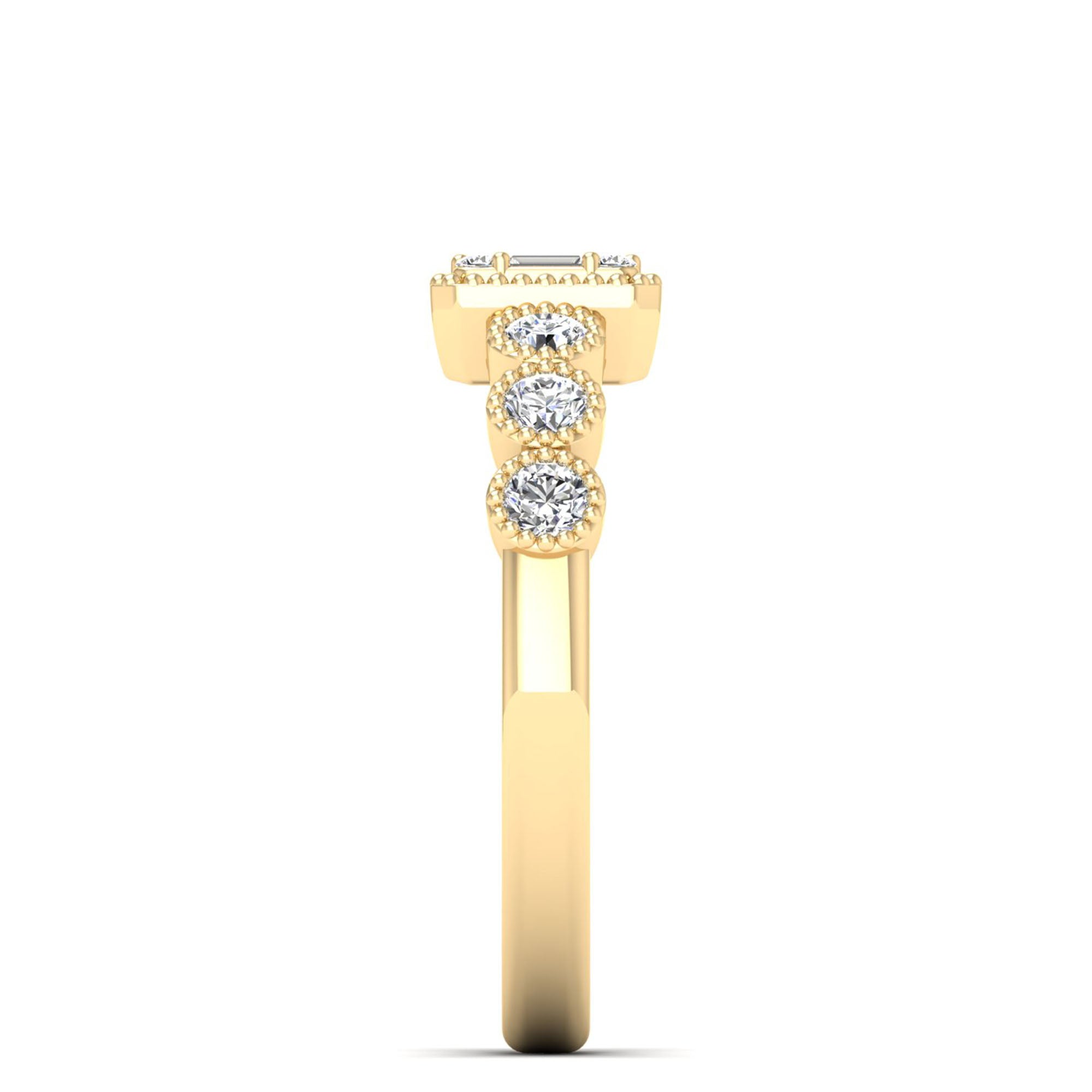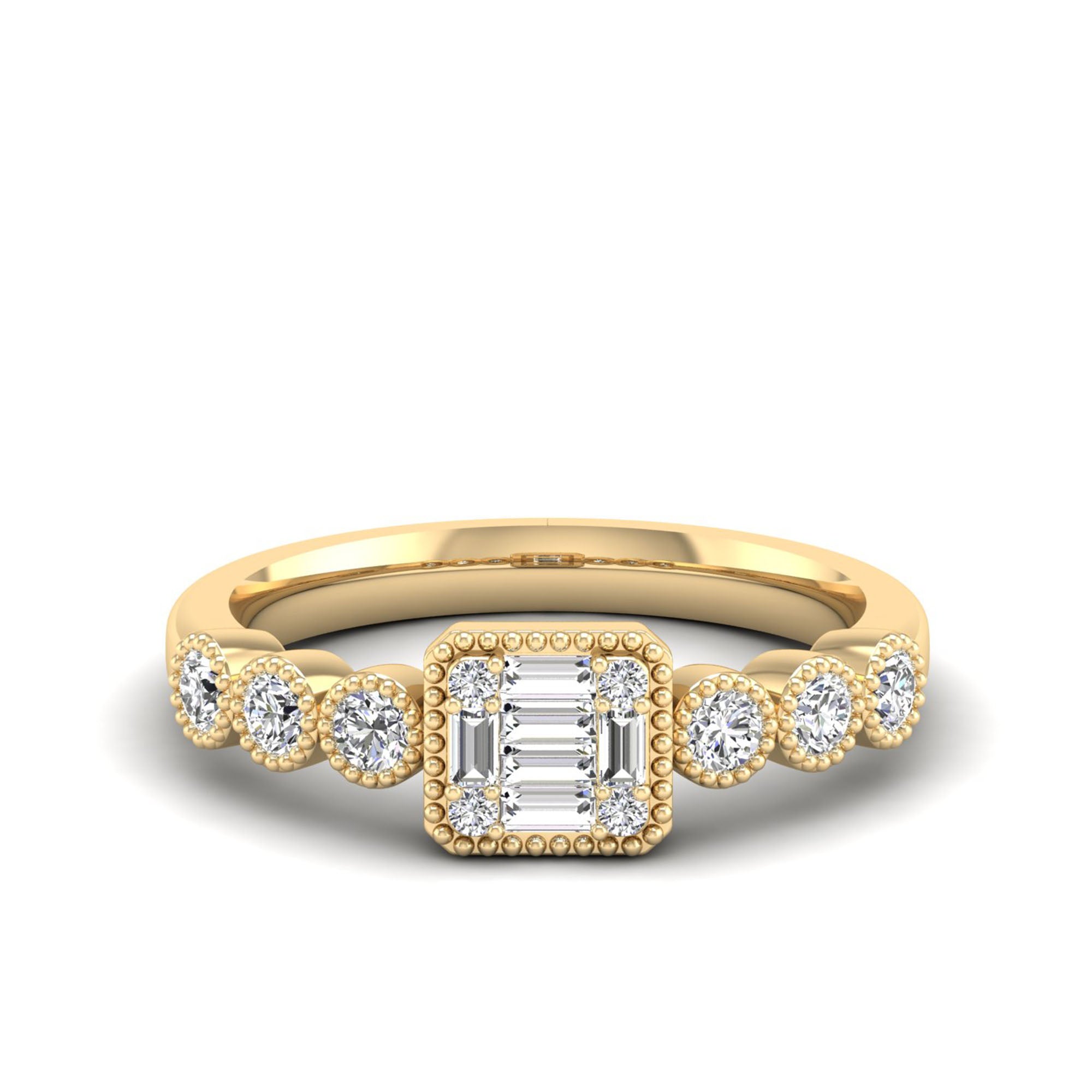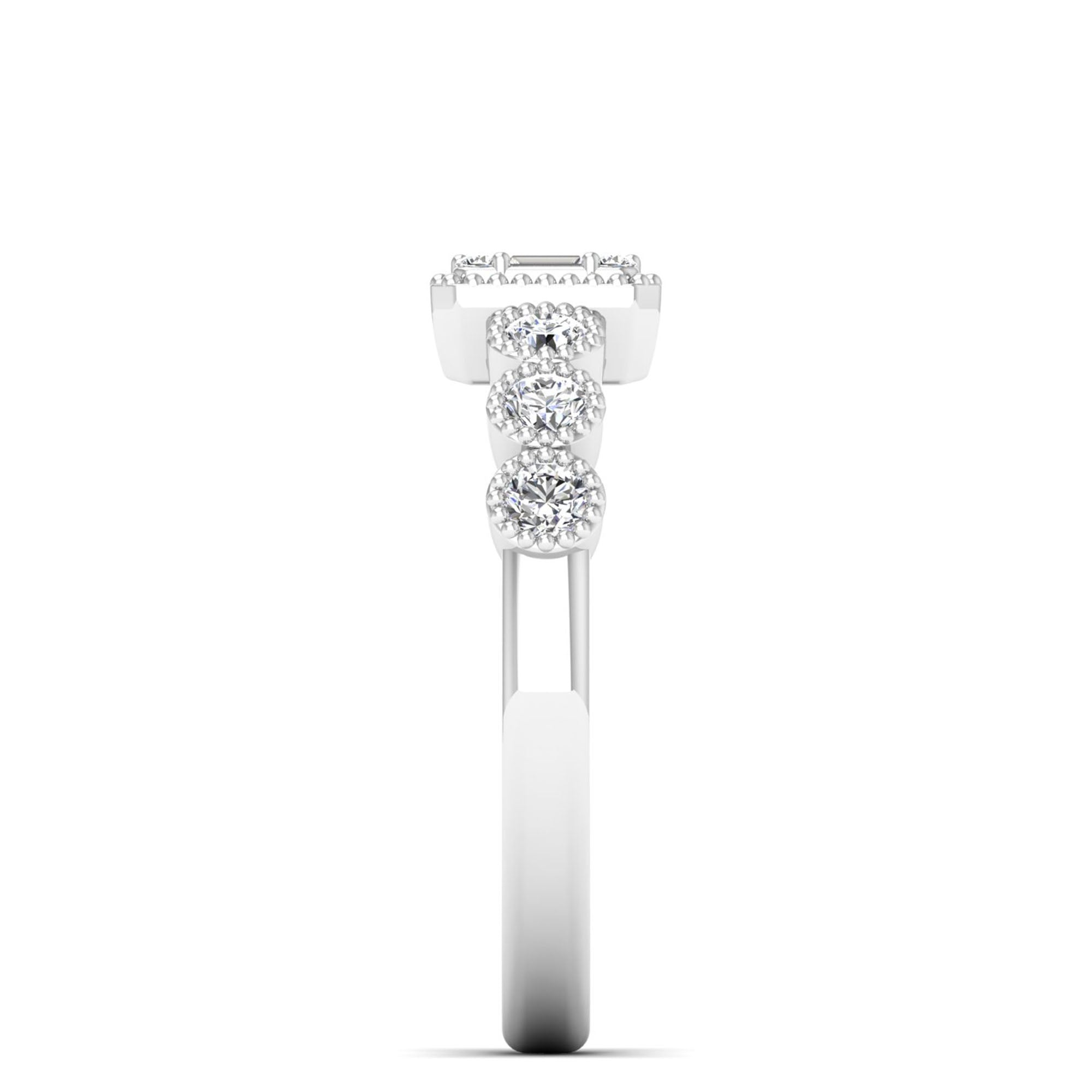 This exquisite Emerald Cut Halo Round and Baguette Diamond Ring is expertly crafted to showcase the sparkling brilliance of its diamonds. The center emerald cut diamond is surrounded by a halo of round diamonds, while baguette diamonds adorn the band.