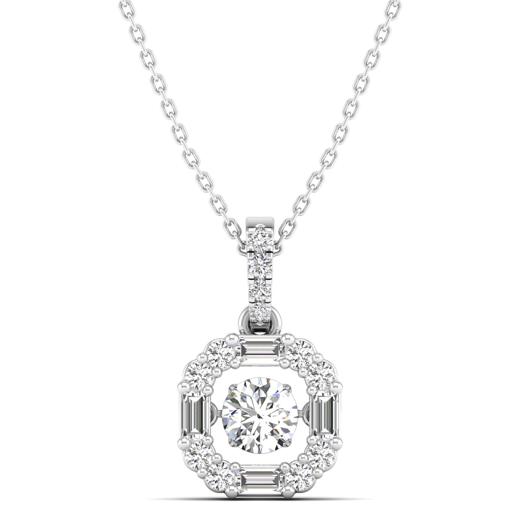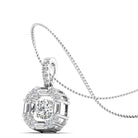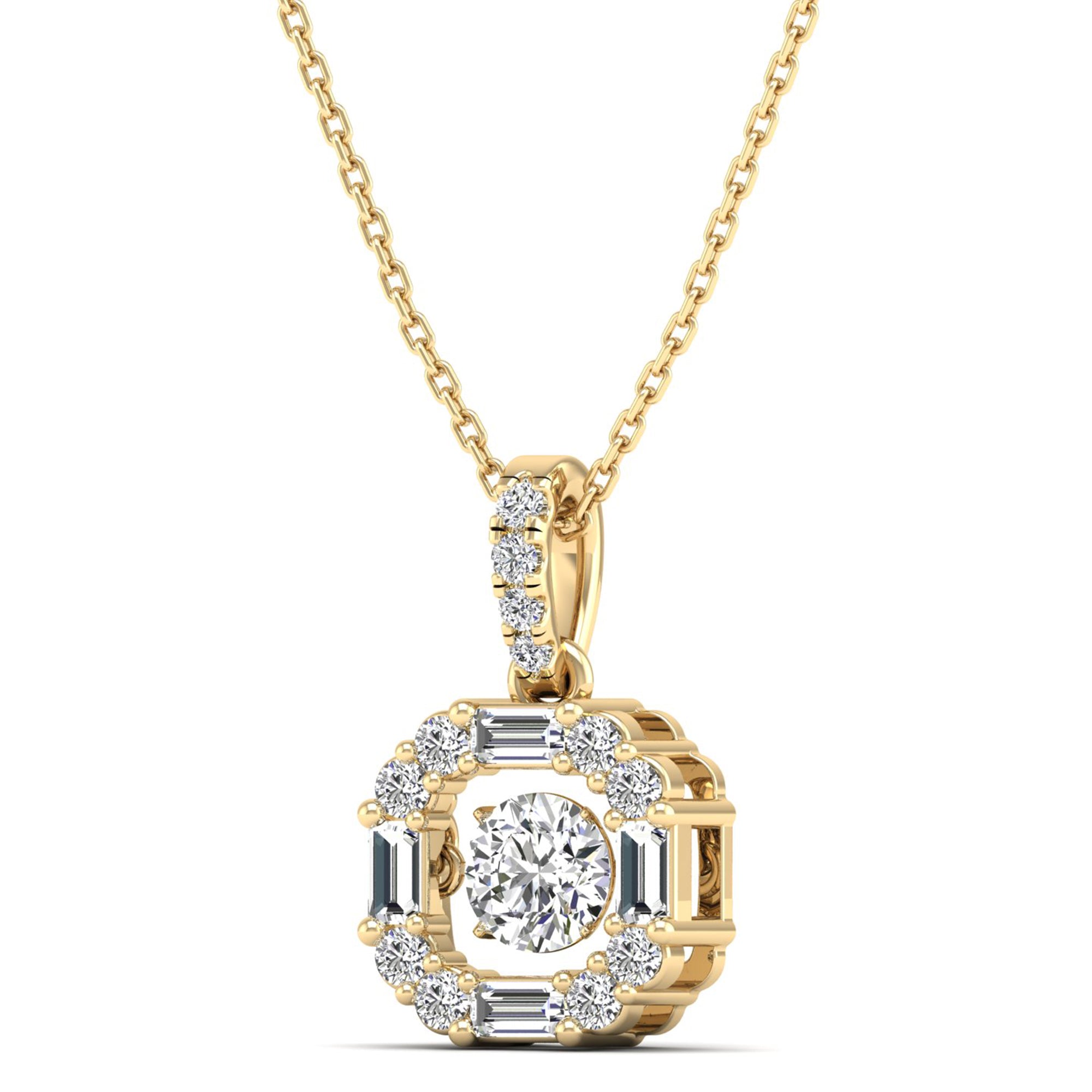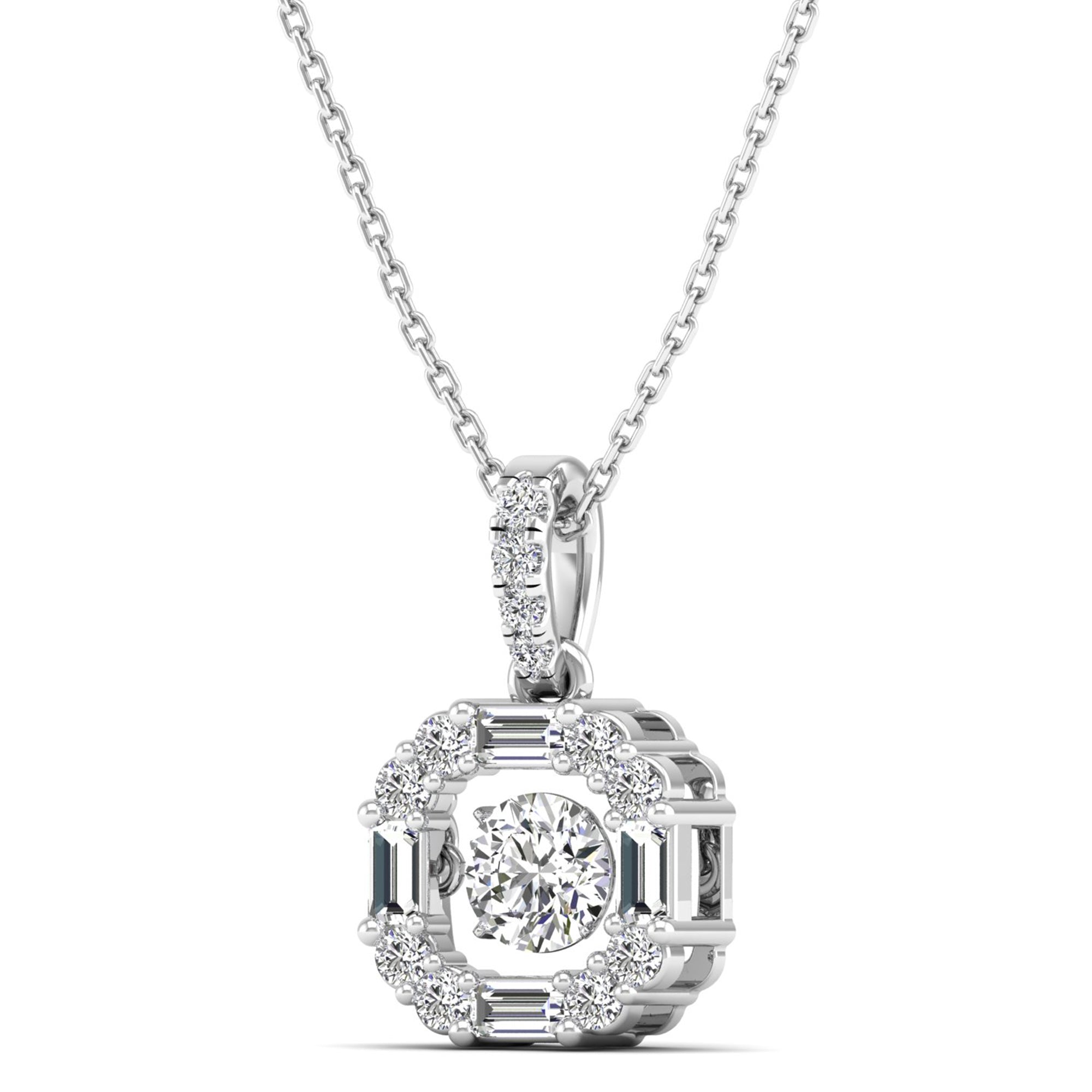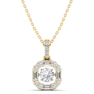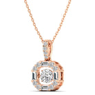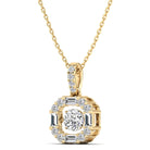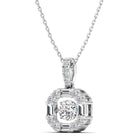 This elegant pendant features a unique design with halo baguette and round dancing diamonds. The halo setting enhances the sparkle of the diamonds, while the dancing feature allows them to move and catch the light from every angle.