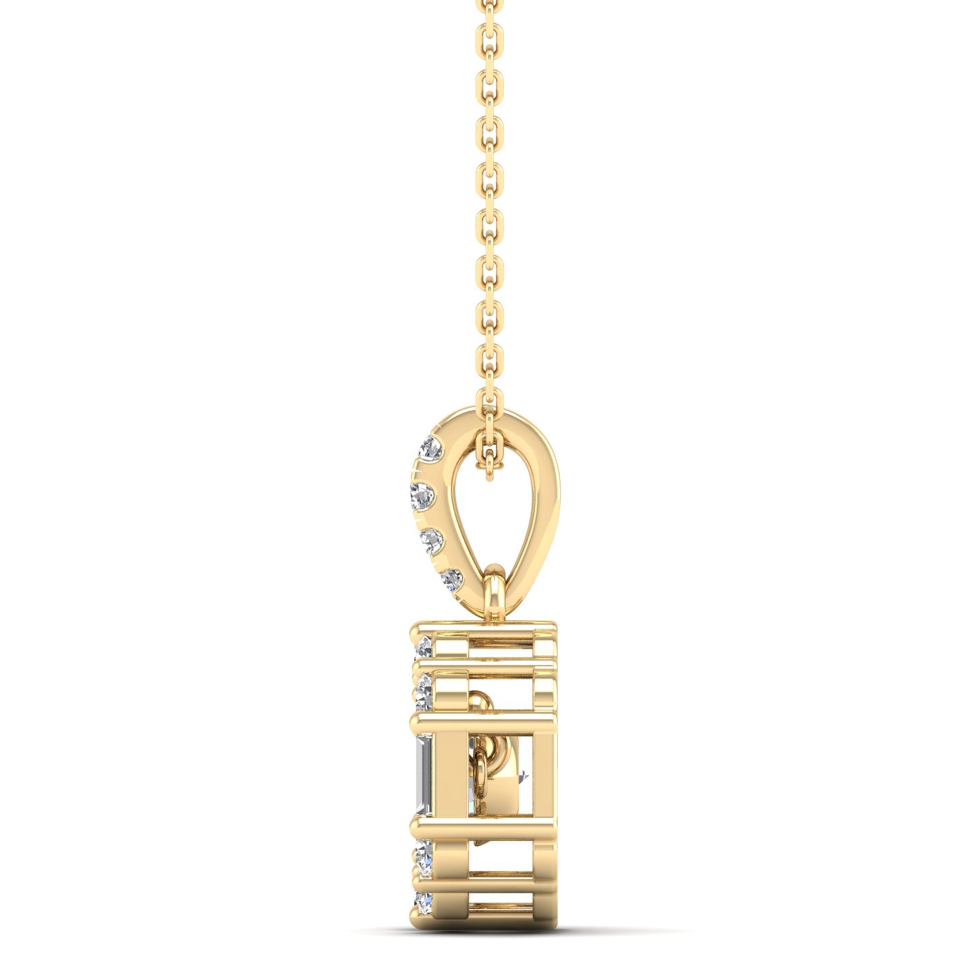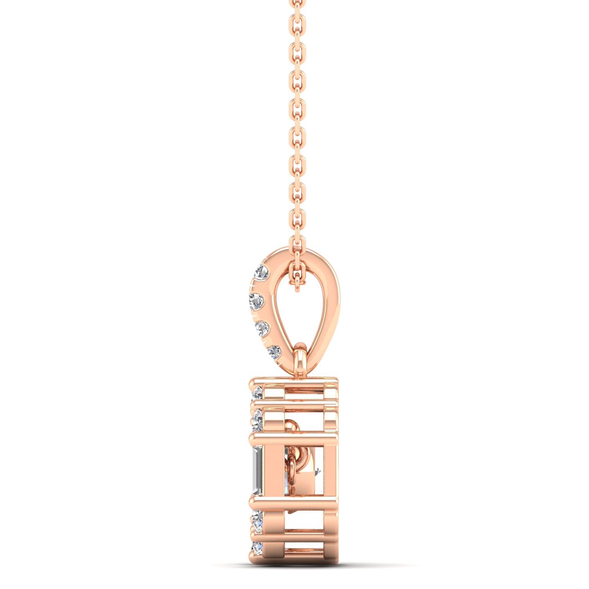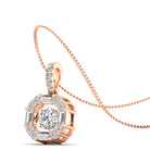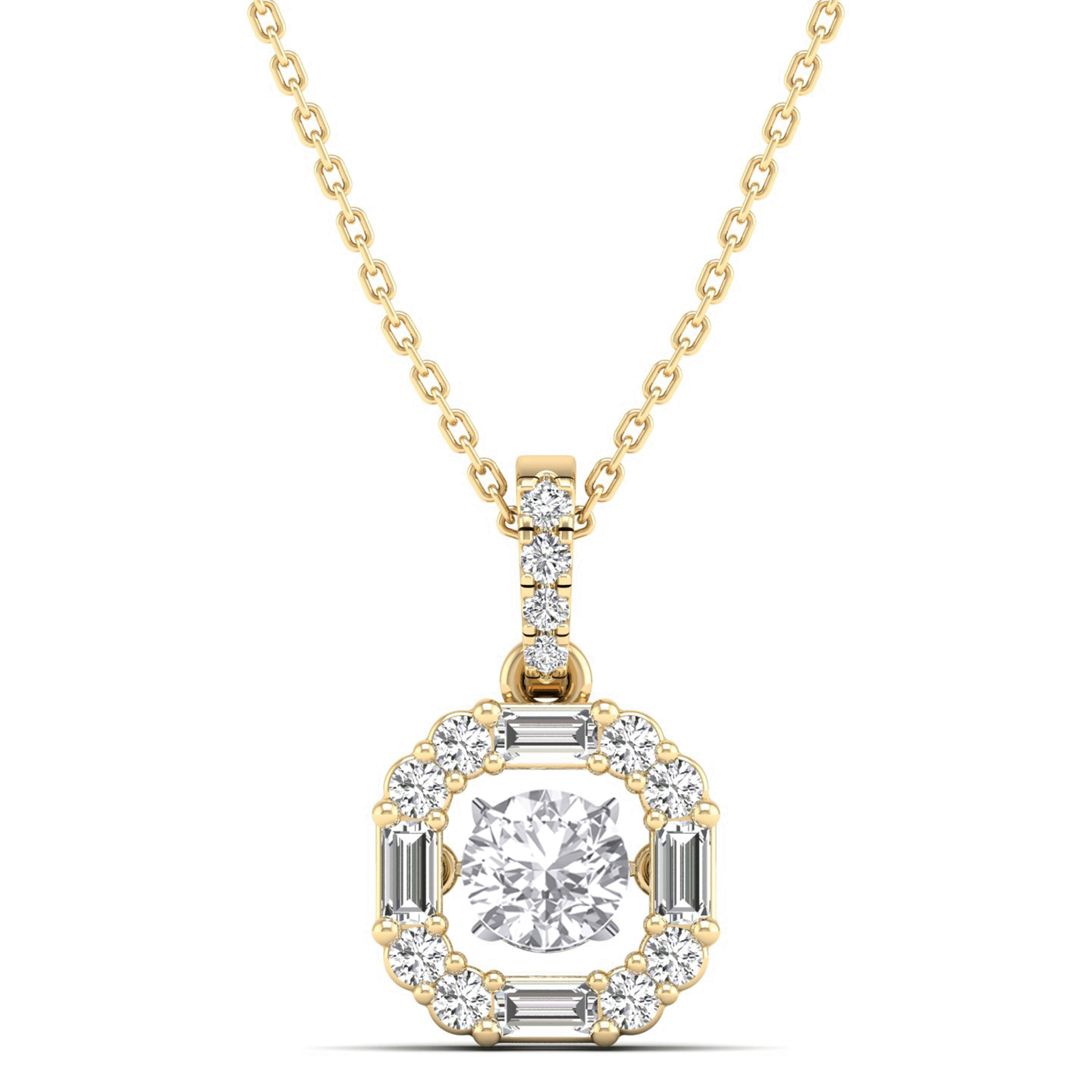This elegant pendant features a unique design with halo baguette and round dancing diamonds. The halo setting enhances the sparkle of the diamonds, while the dancing feature allows them to move and catch the light from every angle.