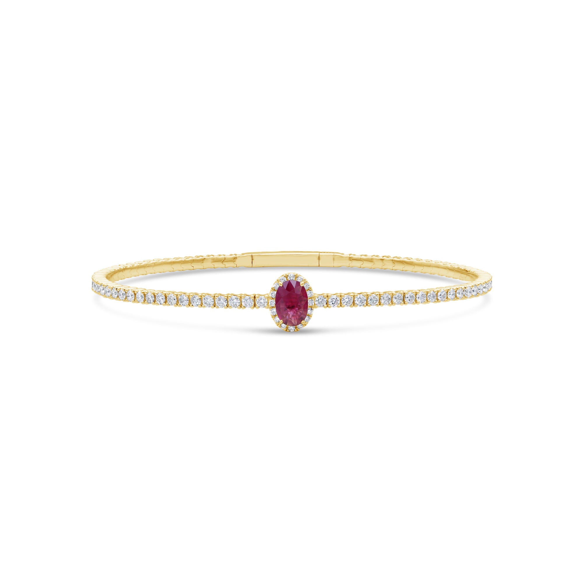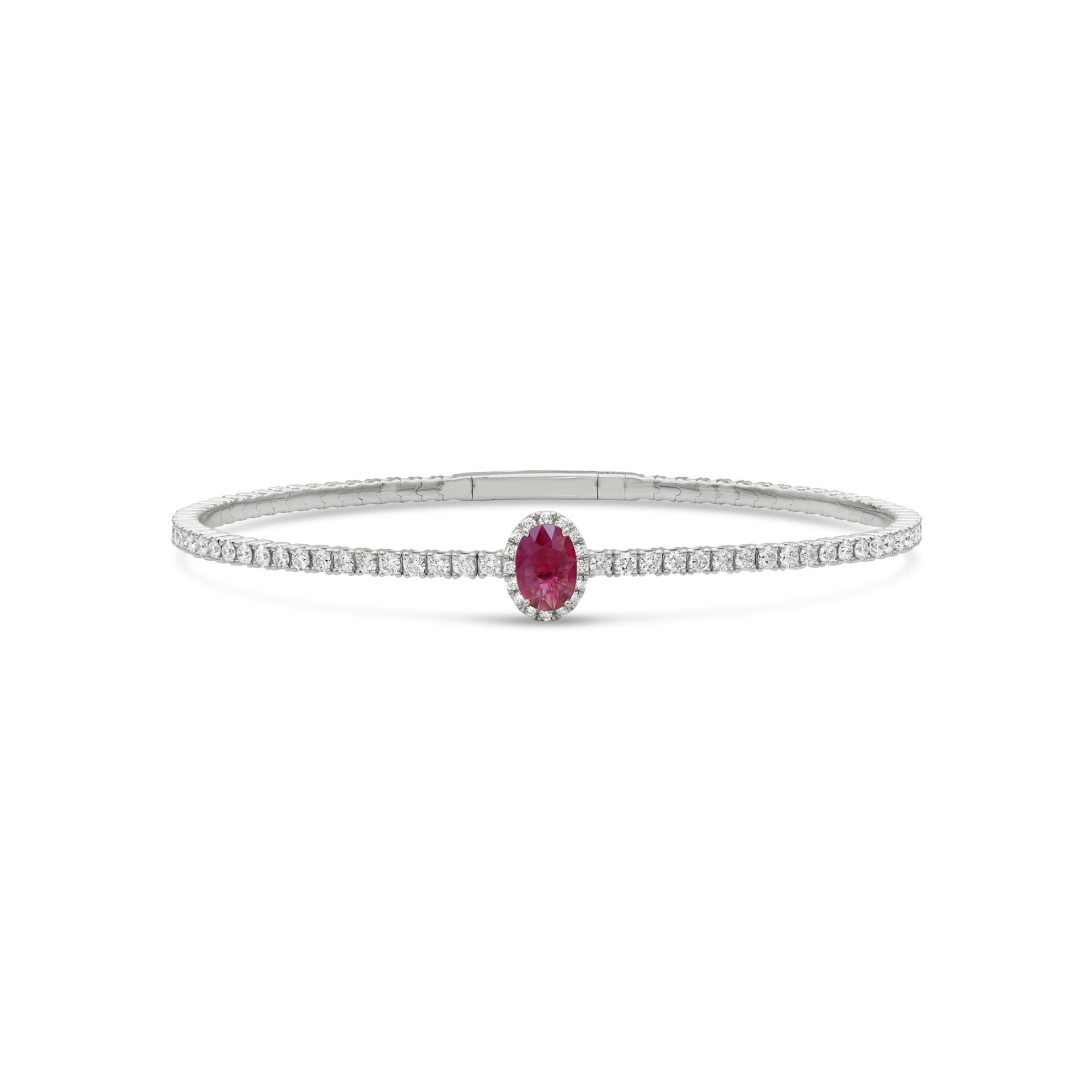 This exquisite bangle features sparkling oval rubies and brilliant diamonds in a flexible design. The Halo Oval Ruby and Diamond Flexible Bangle is a perfect addition to any jewelry collection, adding a touch of elegance and sophistication to any outfit.