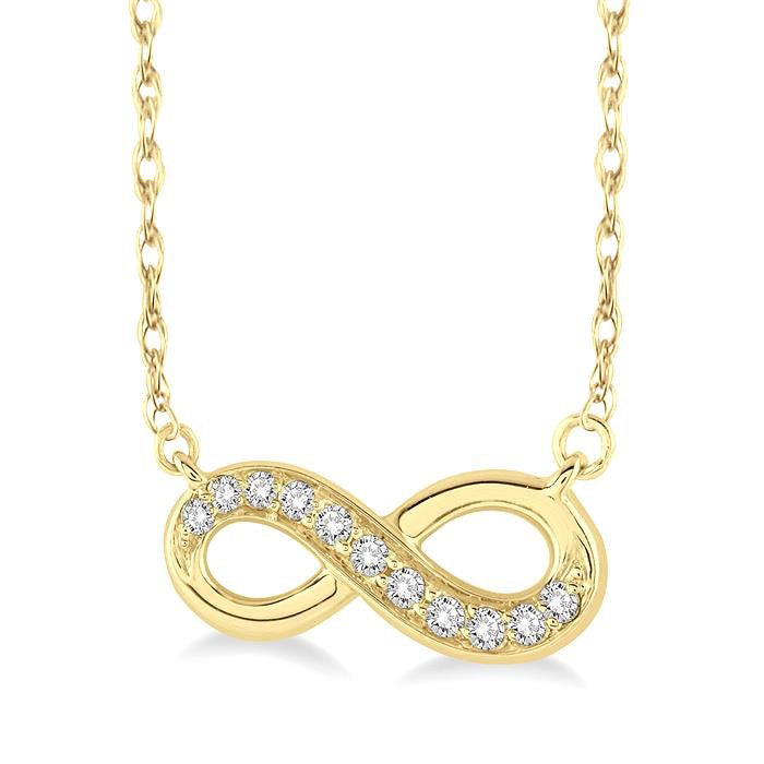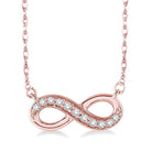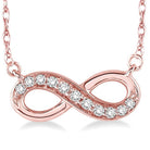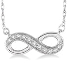 The sparkling look of this diamond infinity pendant will take her breath away. Crafted in 14 karat white gold, this twisting infinity pendant is lined with elegant 11 shimmering round cut diamonds, perfectly prong set to a brilliant shine. A sophisticated Rope chain complements the pendant.