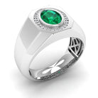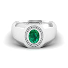 This sophisticated Men's Oval Emerald Bezel-Set Halo Diamond Ring features a vibrant center emerald secured in a protective bezel setting, encircled by a halo of meticulously placed diamonds.