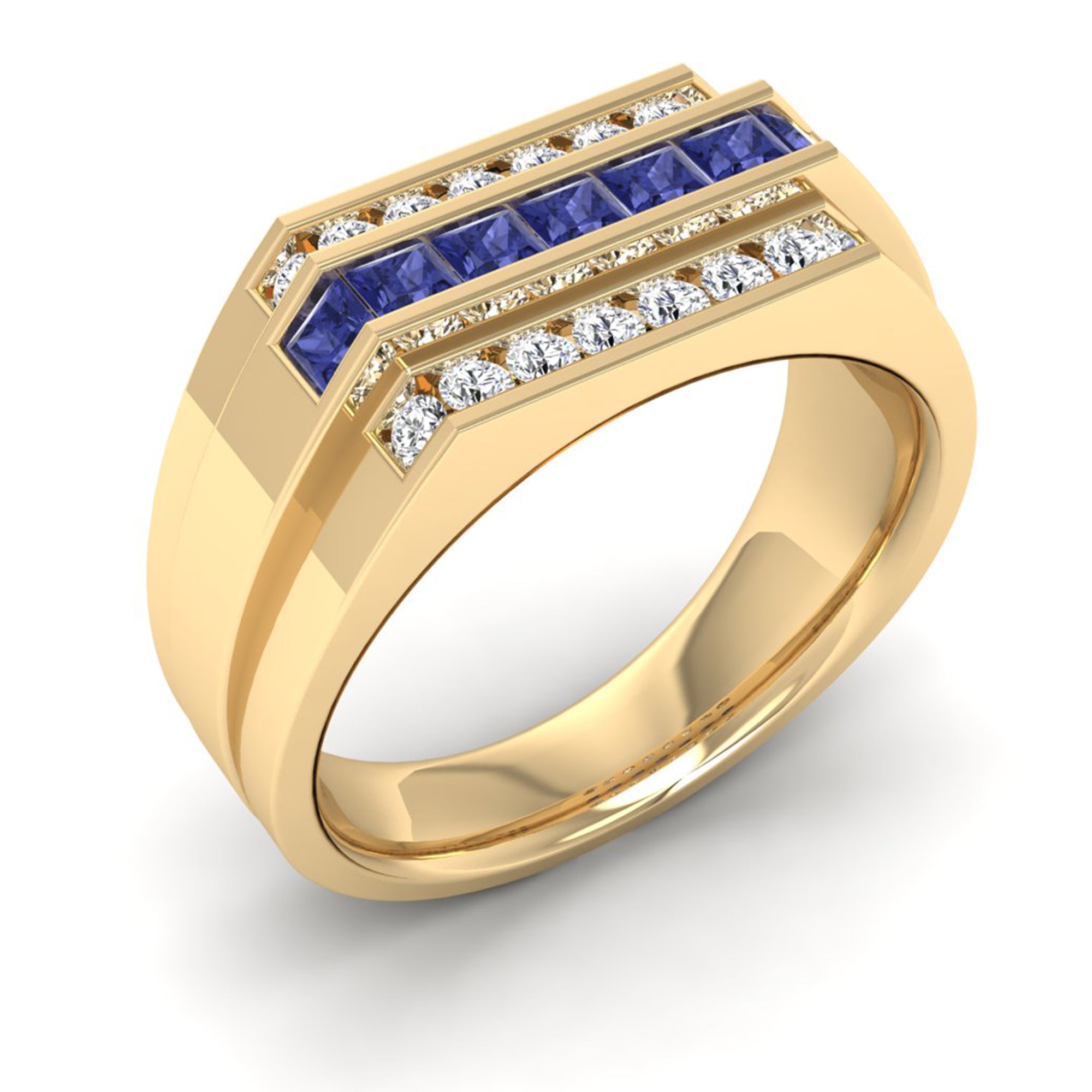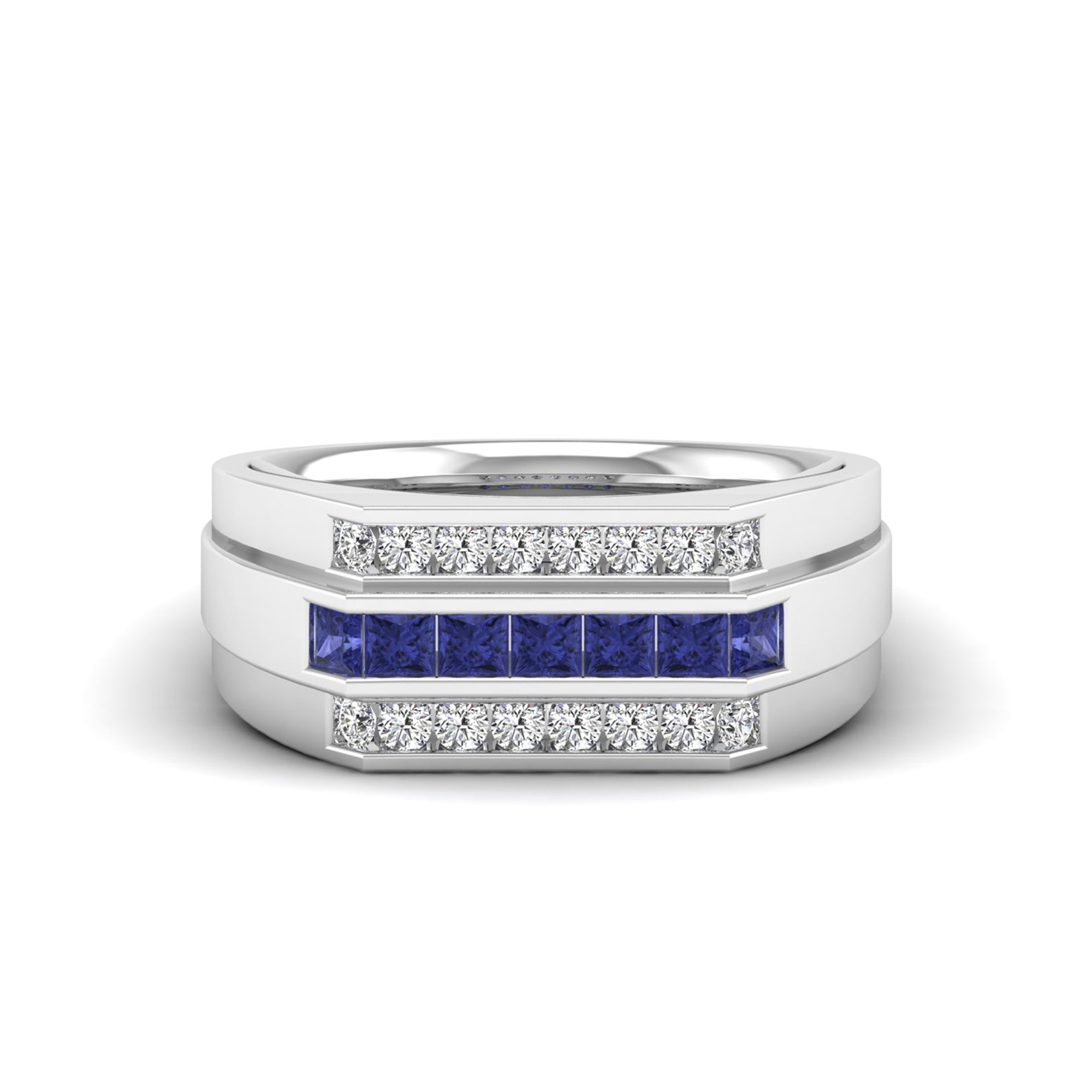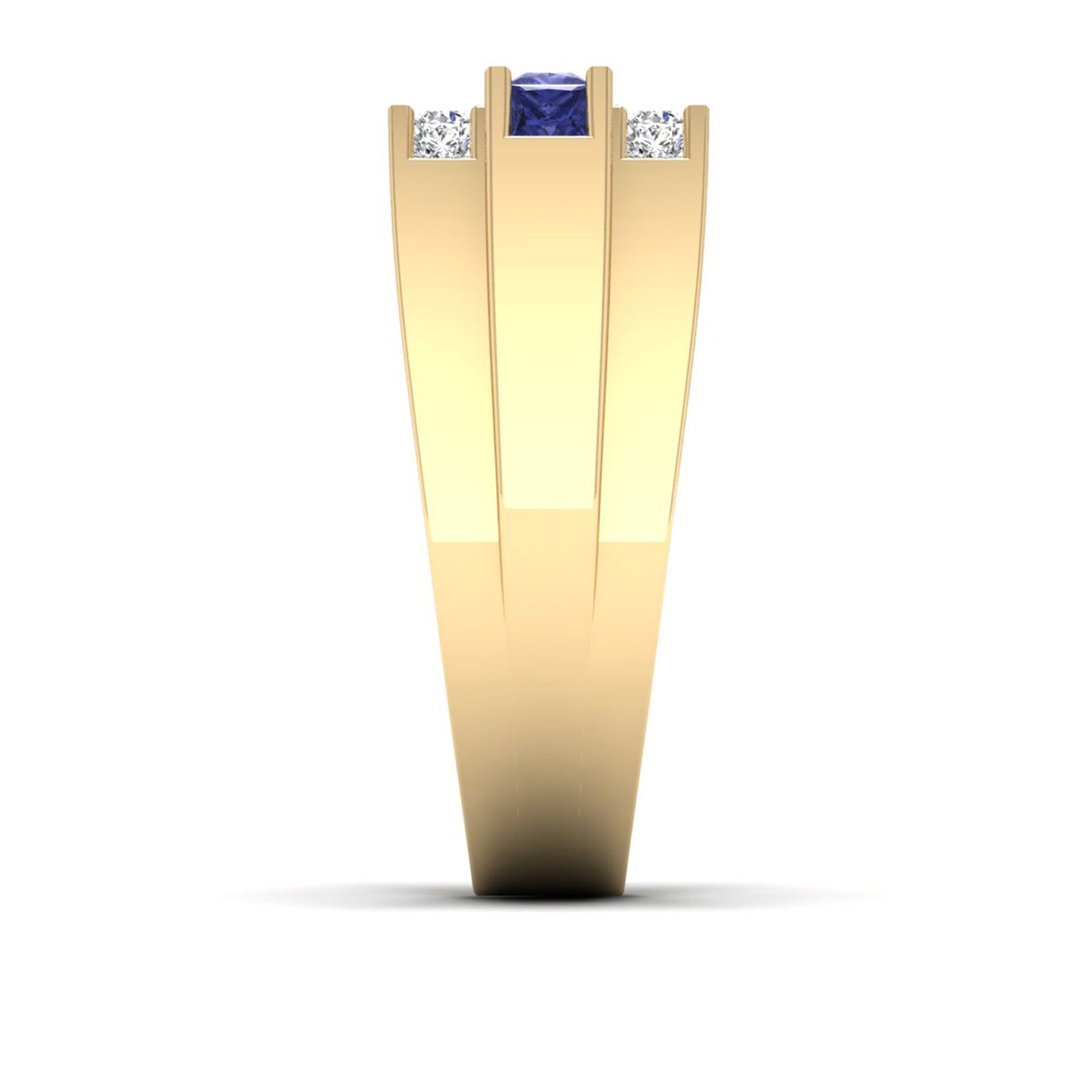 This Men's Princess Cut Tanzanite Triple Row Diamond Ring exemplifies advanced jewelry engineering with a rare tanzanite centerpiece complemented by three precise rows of princess-cut diamonds.