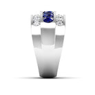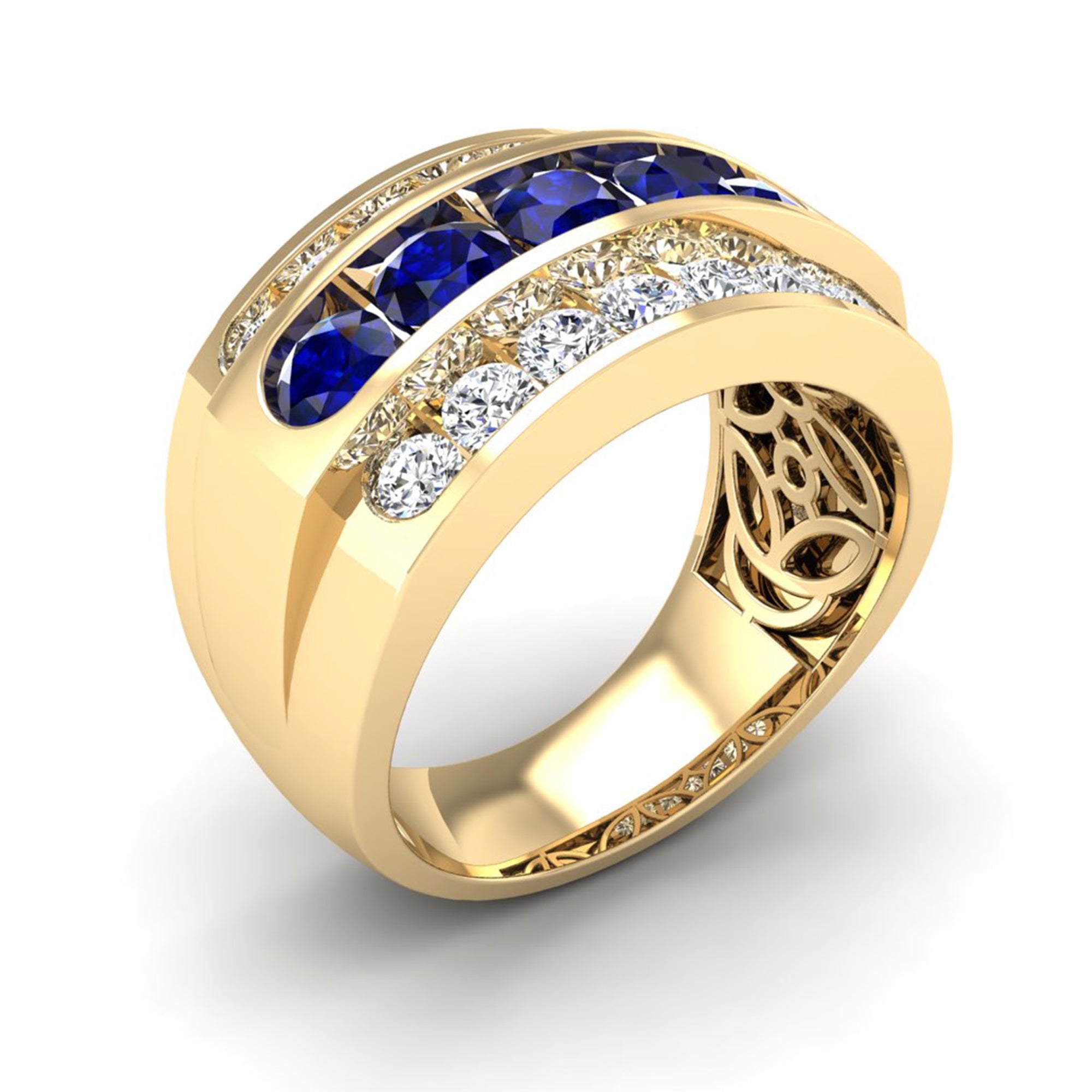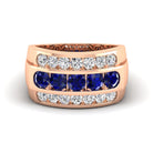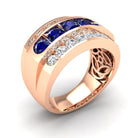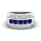 This refined men's ring features a triple row configuration with precisely calibrated sapphires and diamonds arranged in an engineered pattern.