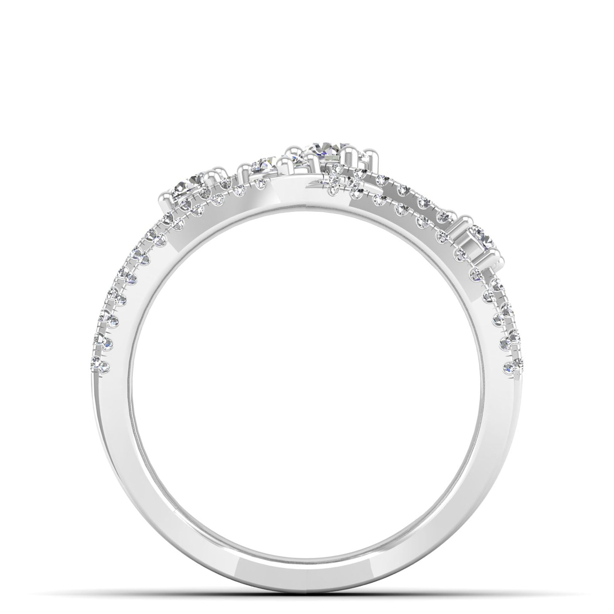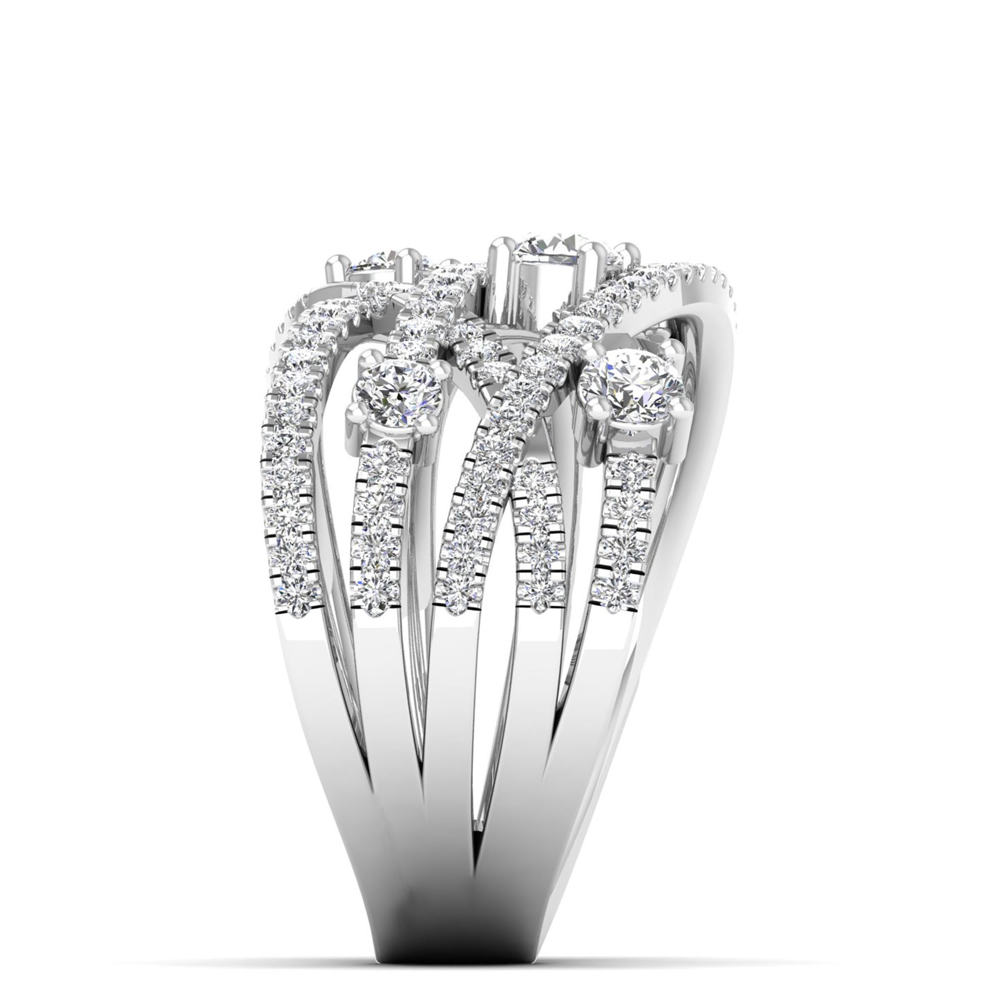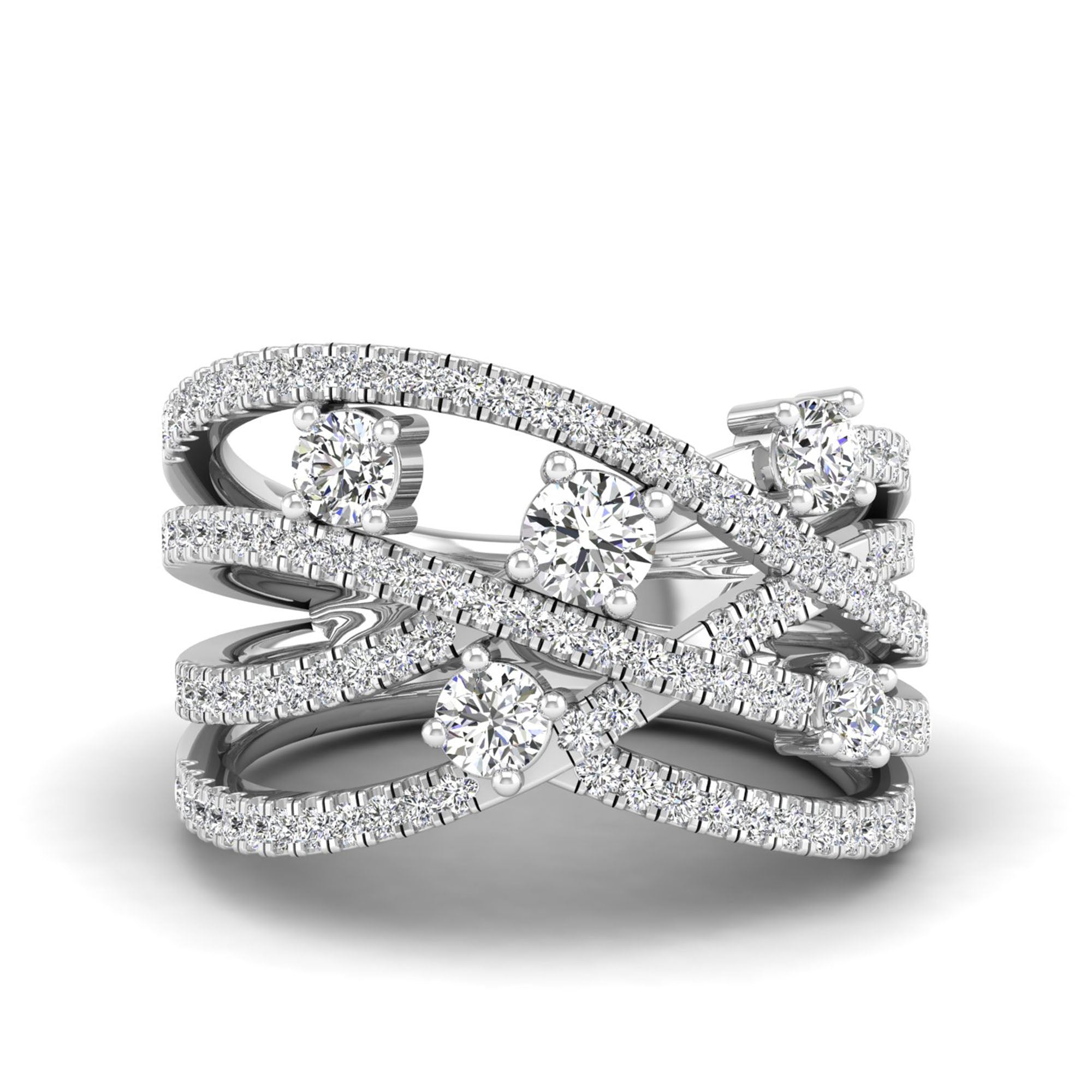 This elegant Multi Row Solitaire Crossover Diamond Ring features multiple rows of sparkling diamonds, creating a stunningly intricate and unique design.