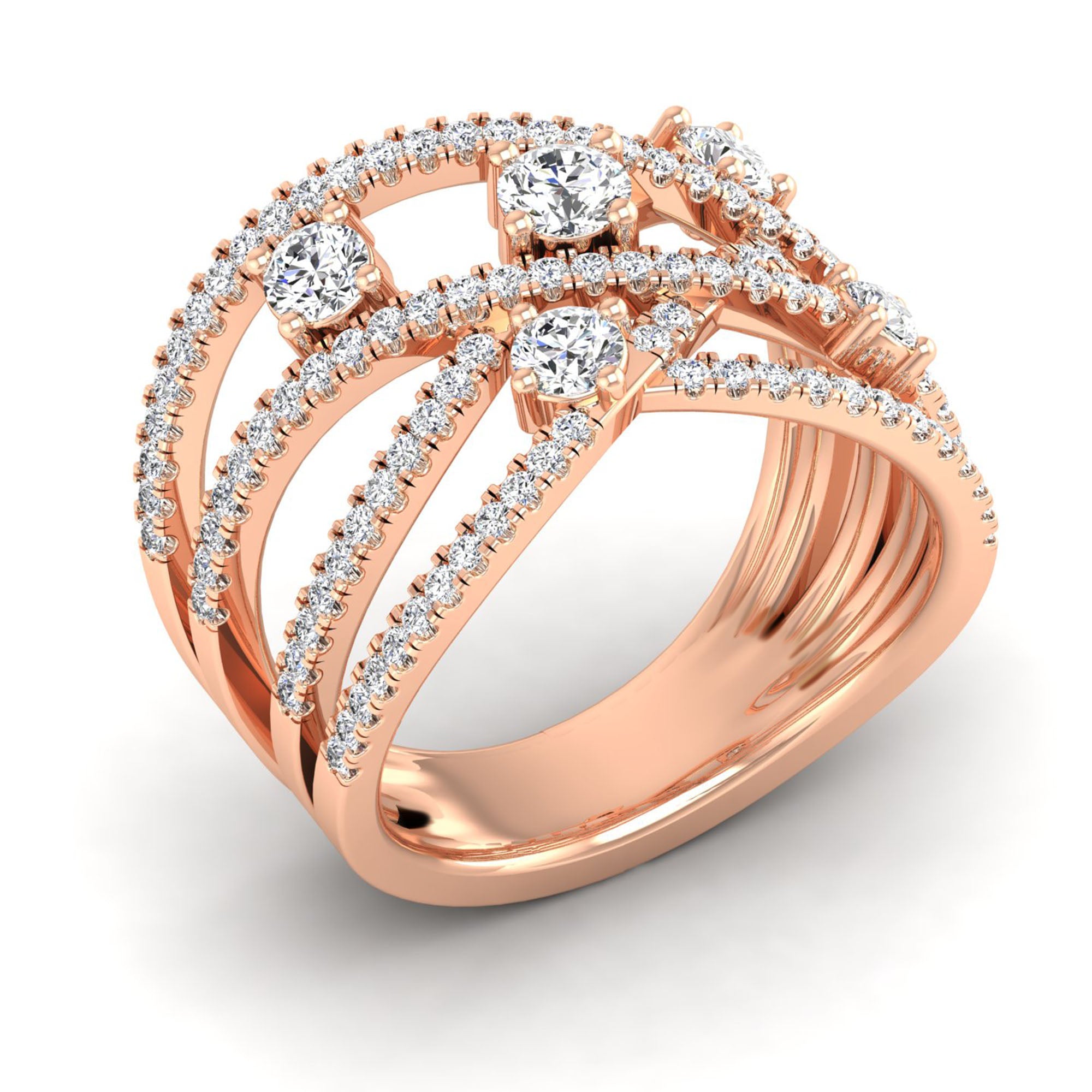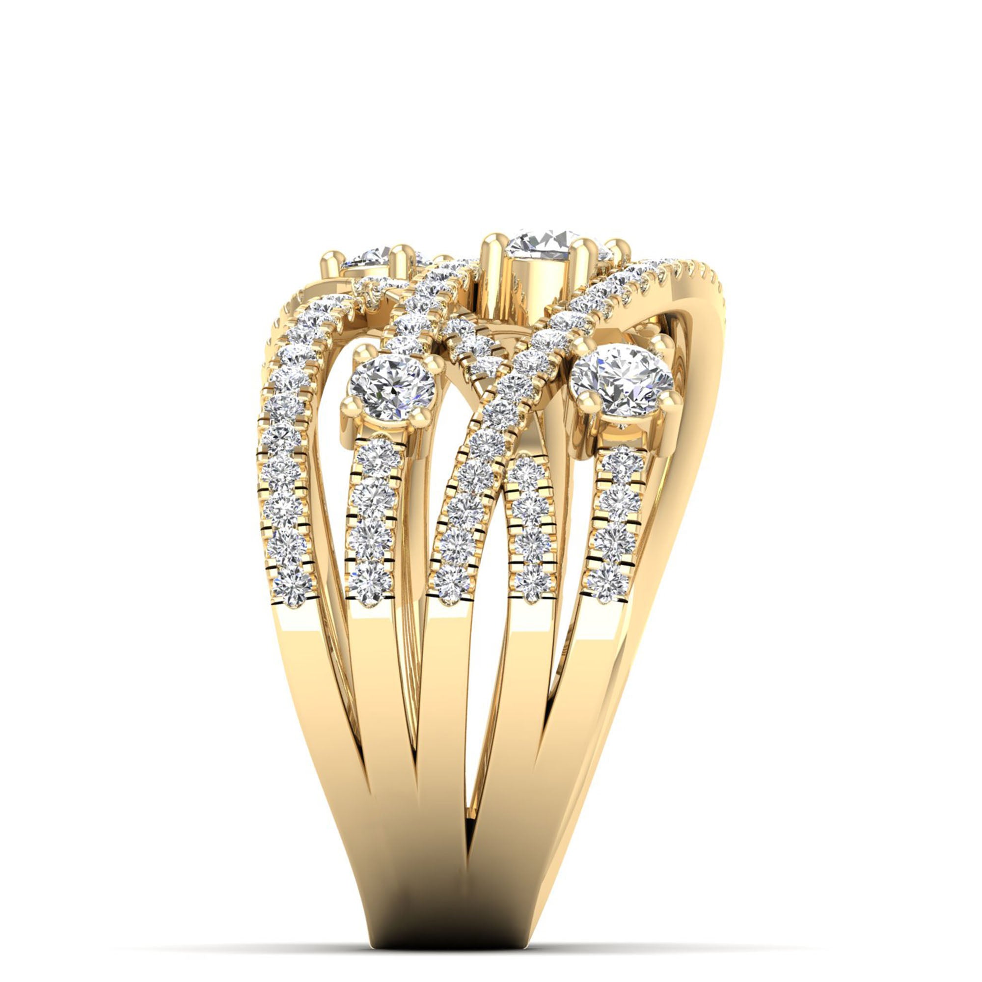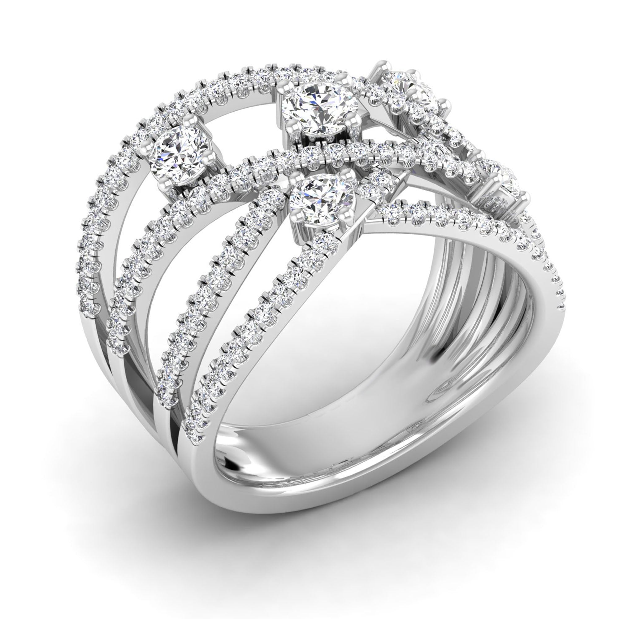 This elegant Multi Row Solitaire Crossover Diamond Ring features multiple rows of sparkling diamonds, creating a stunningly intricate and unique design.
