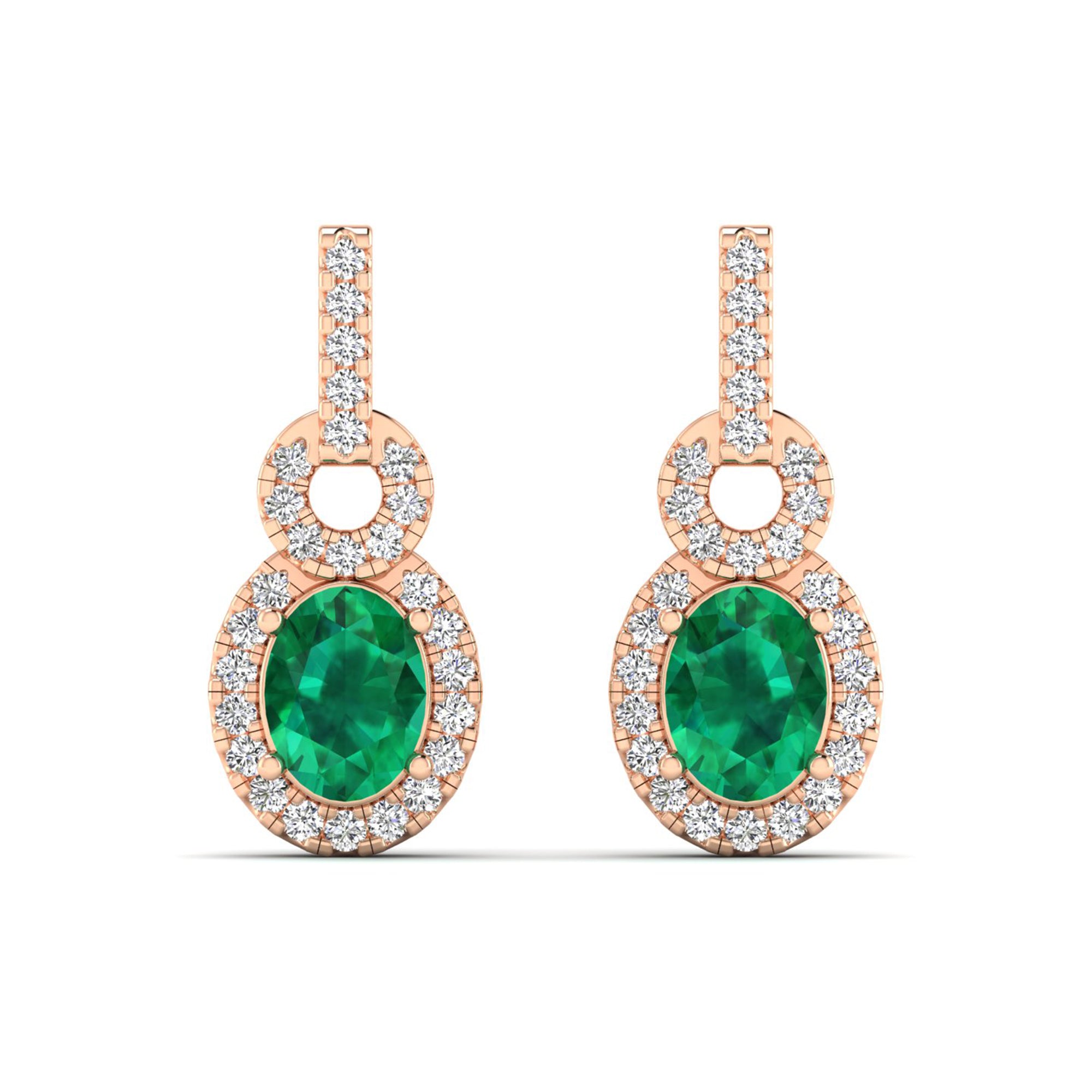 Oval Emerald and Halo Diamond Dangle Drop Earrings