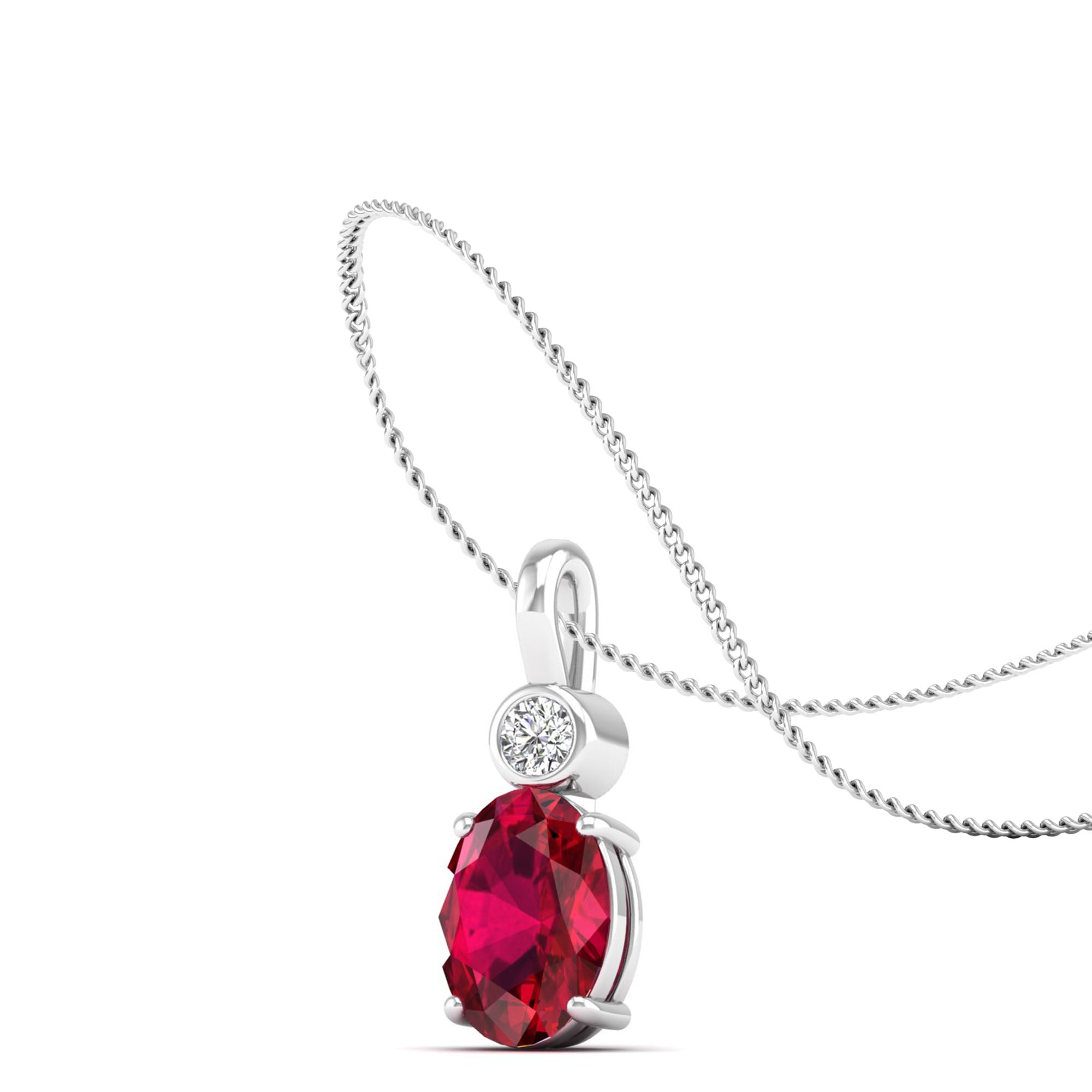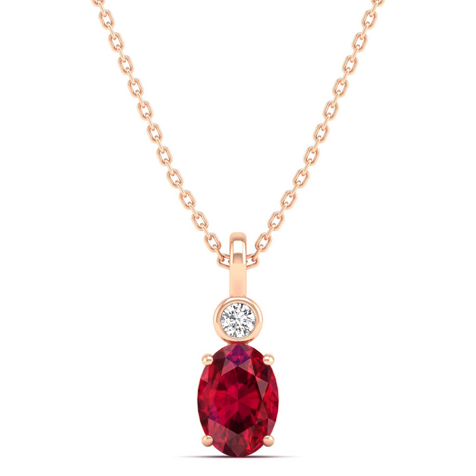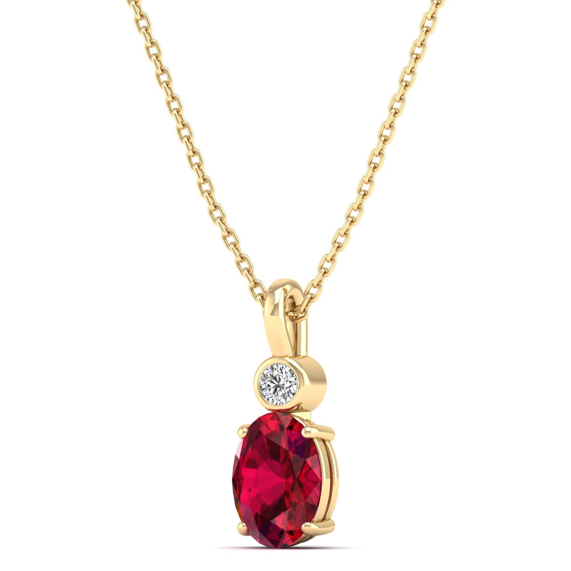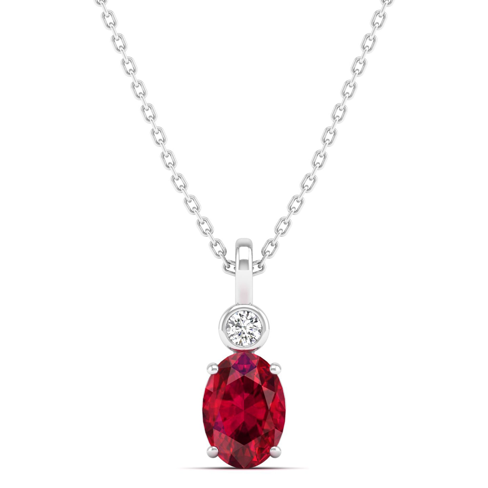 This elegant pendant features a dazzling oval ruby surrounded by a bezel-set accent diamond. The ruby's deep, rich color adds a touch of sophistication to any outfit, while the diamond provides a subtle sparkle.