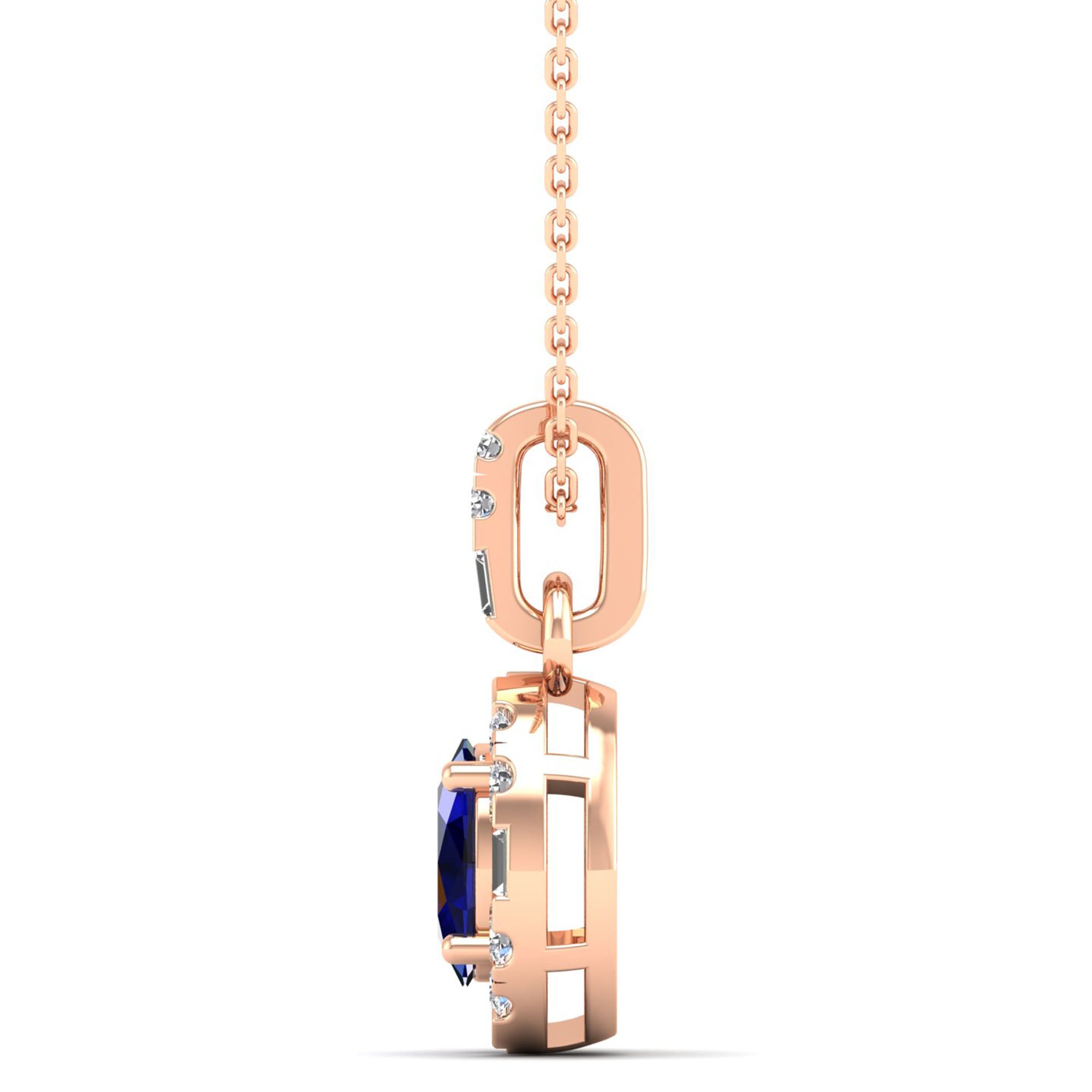 This elegant pendant features a stunning oval sapphire surrounded by a halo of baguette and round diamonds. Its unique design combines timeless sophistication with a modern touch, making it the perfect accessory for any occasion.