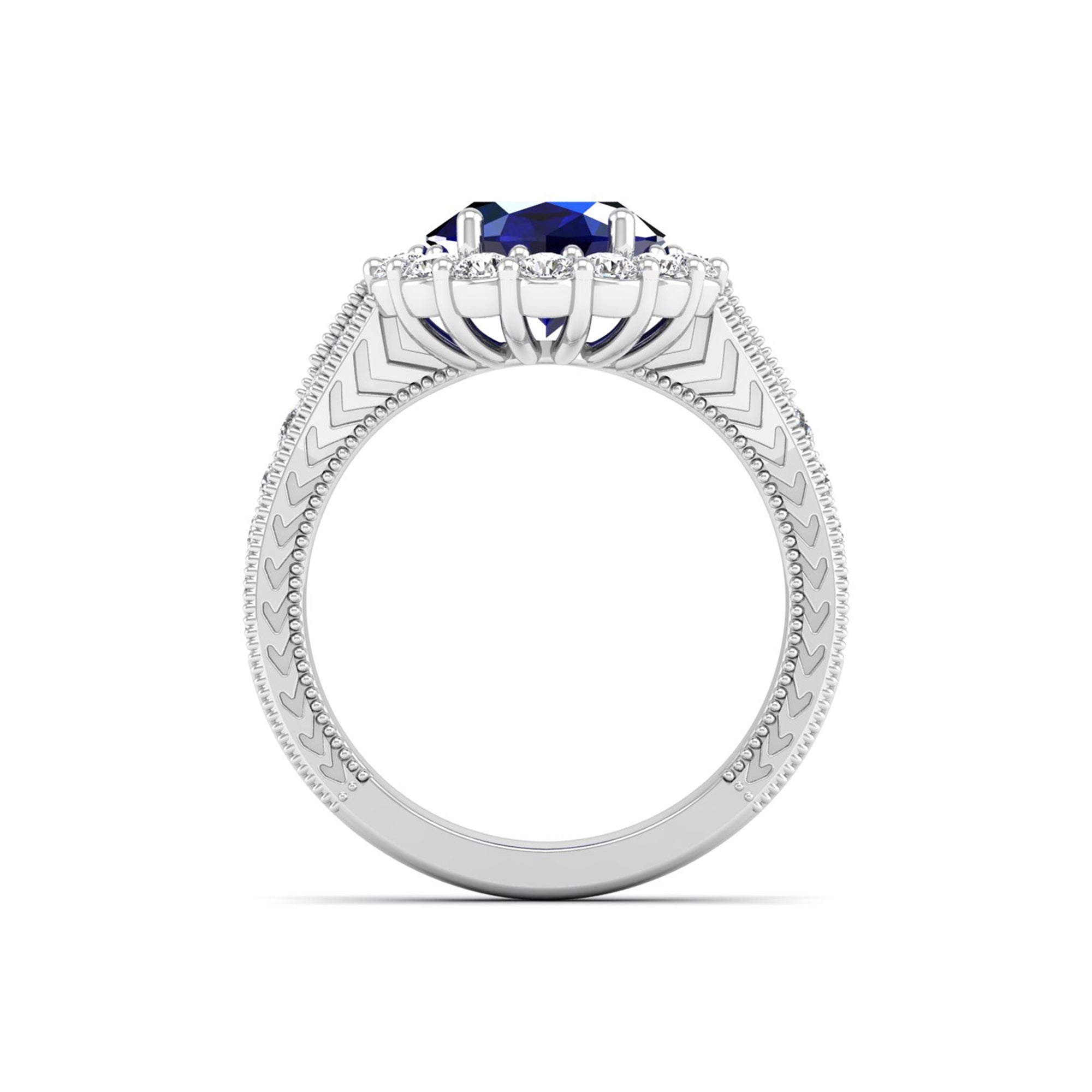 This exquisite Oval Sapphire Shared Prong Halo Diamond Ring showcases a stunning oval sapphire center stone surrounded by sparkling diamonds in a shared prong halo setting.