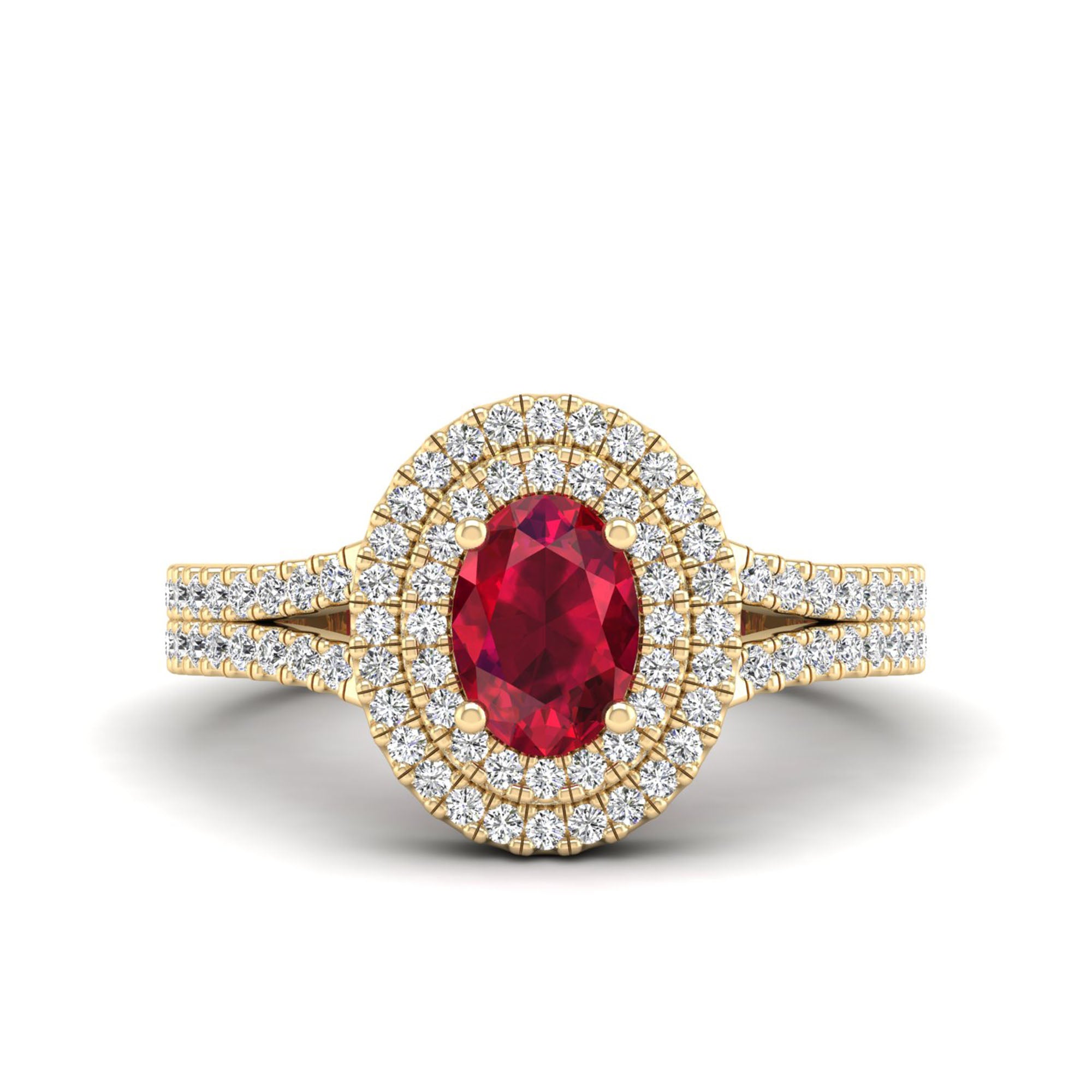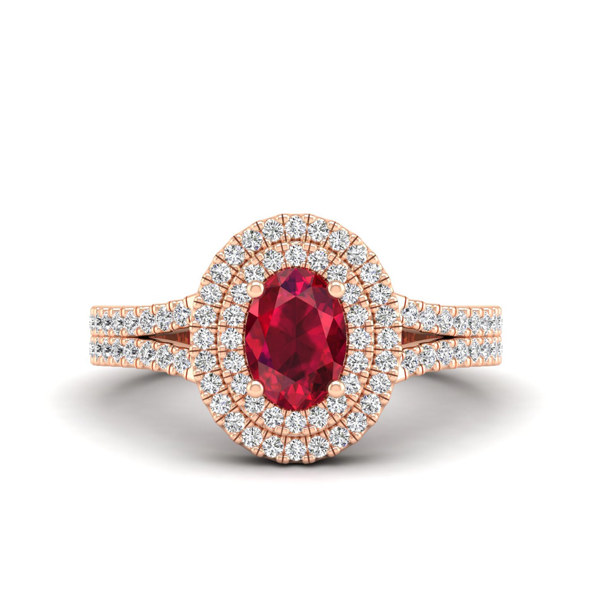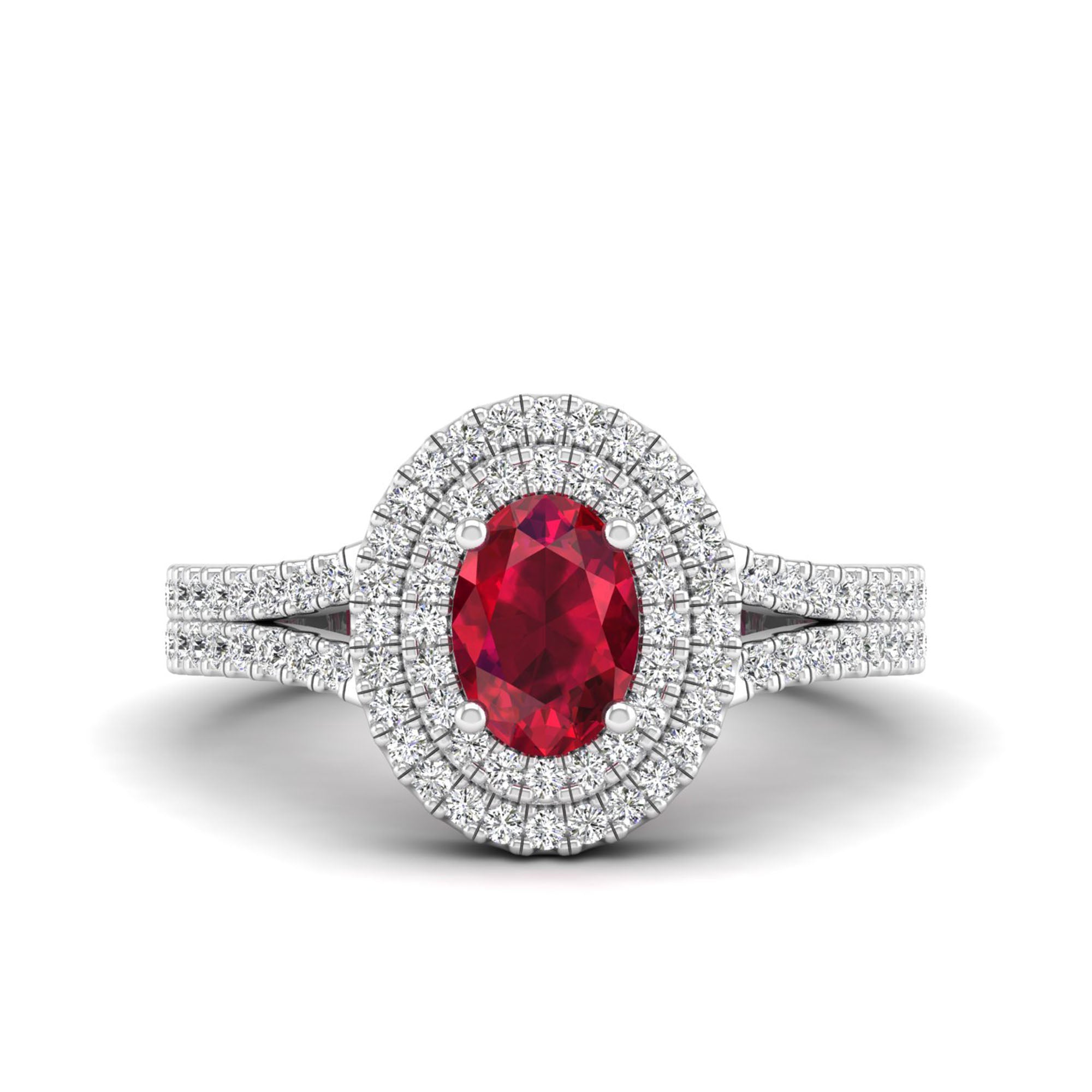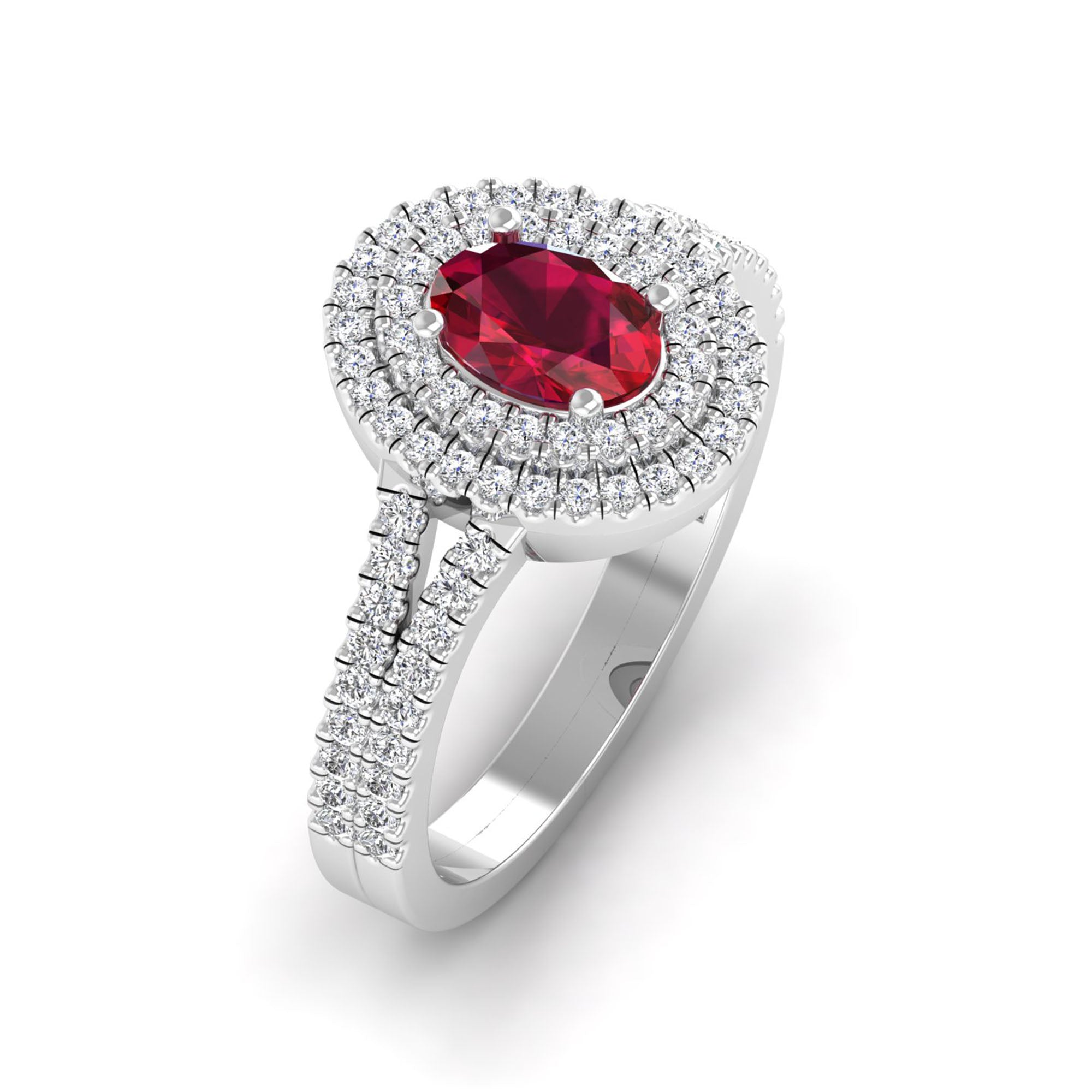 Experience elegance and luxury with our Prong-Set Double Halo Oval Ruby and Infinity Diamond Ring. Designed with precision and expert craftsmanship, our ring features a stunning oval ruby stone surrounded by a double halo of sparkling diamonds.