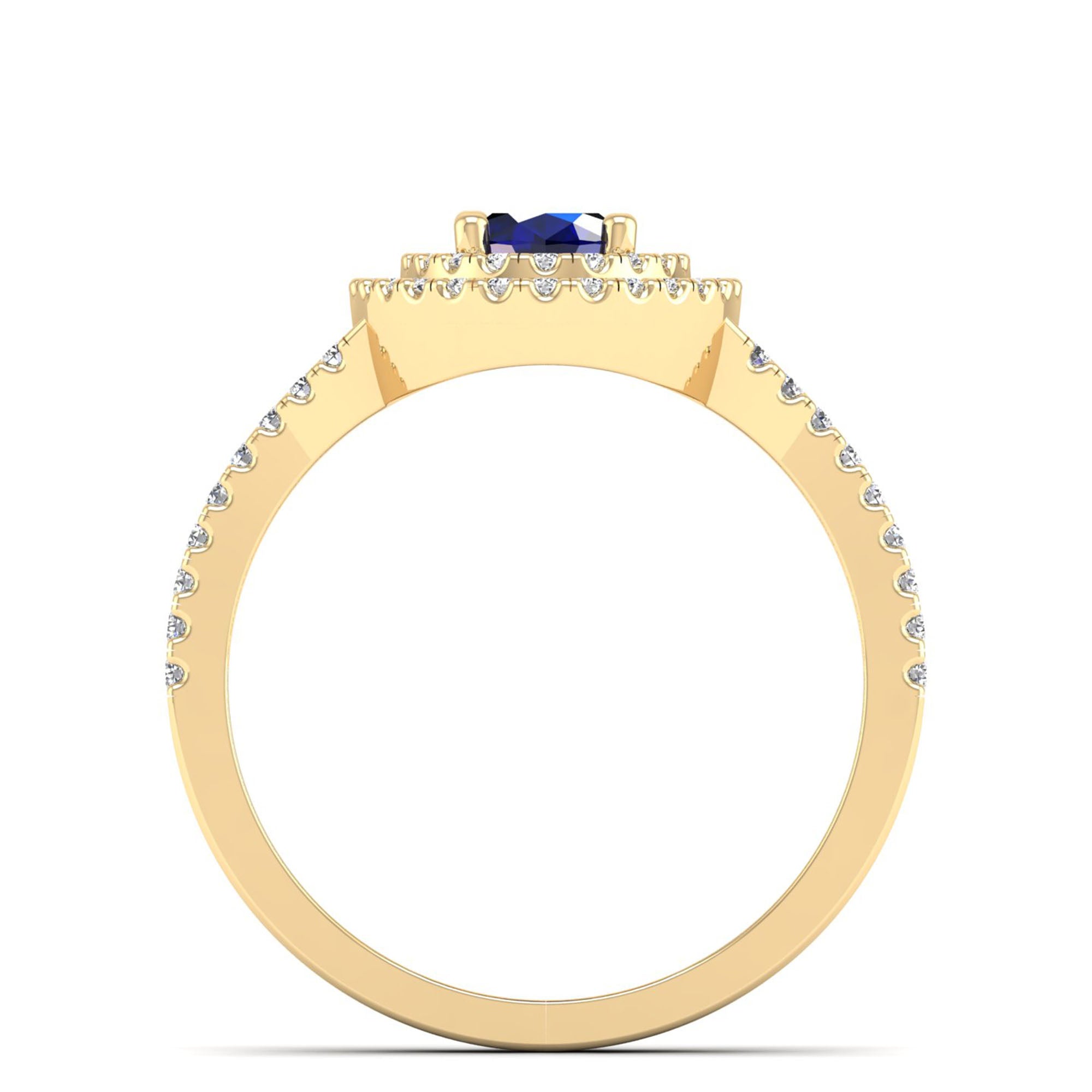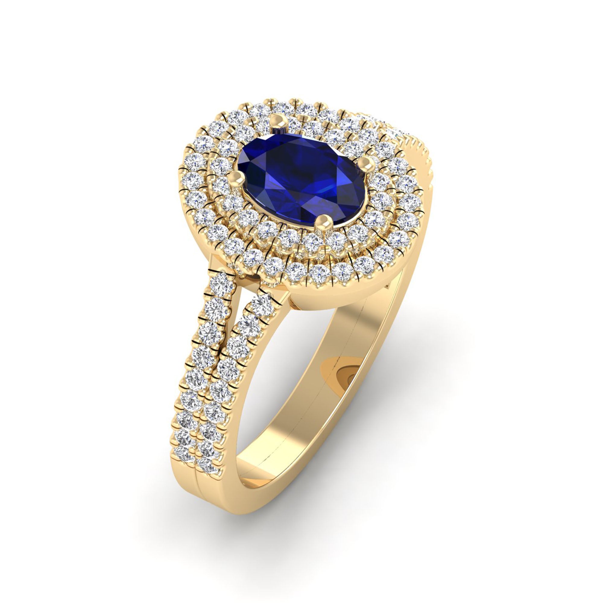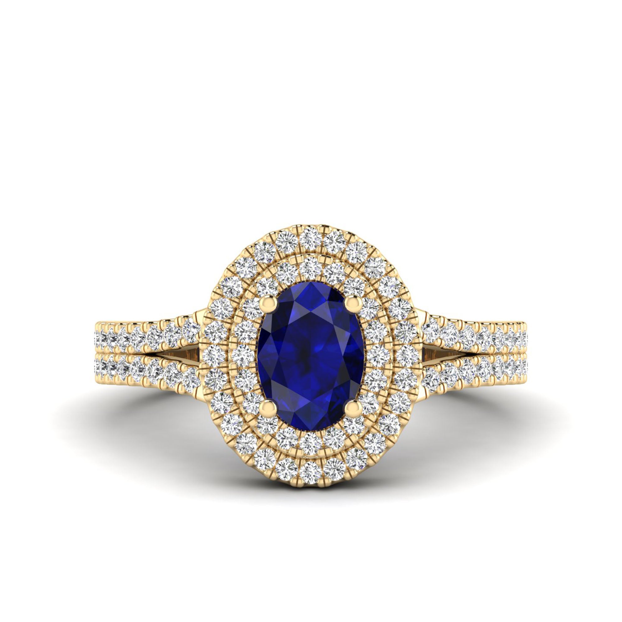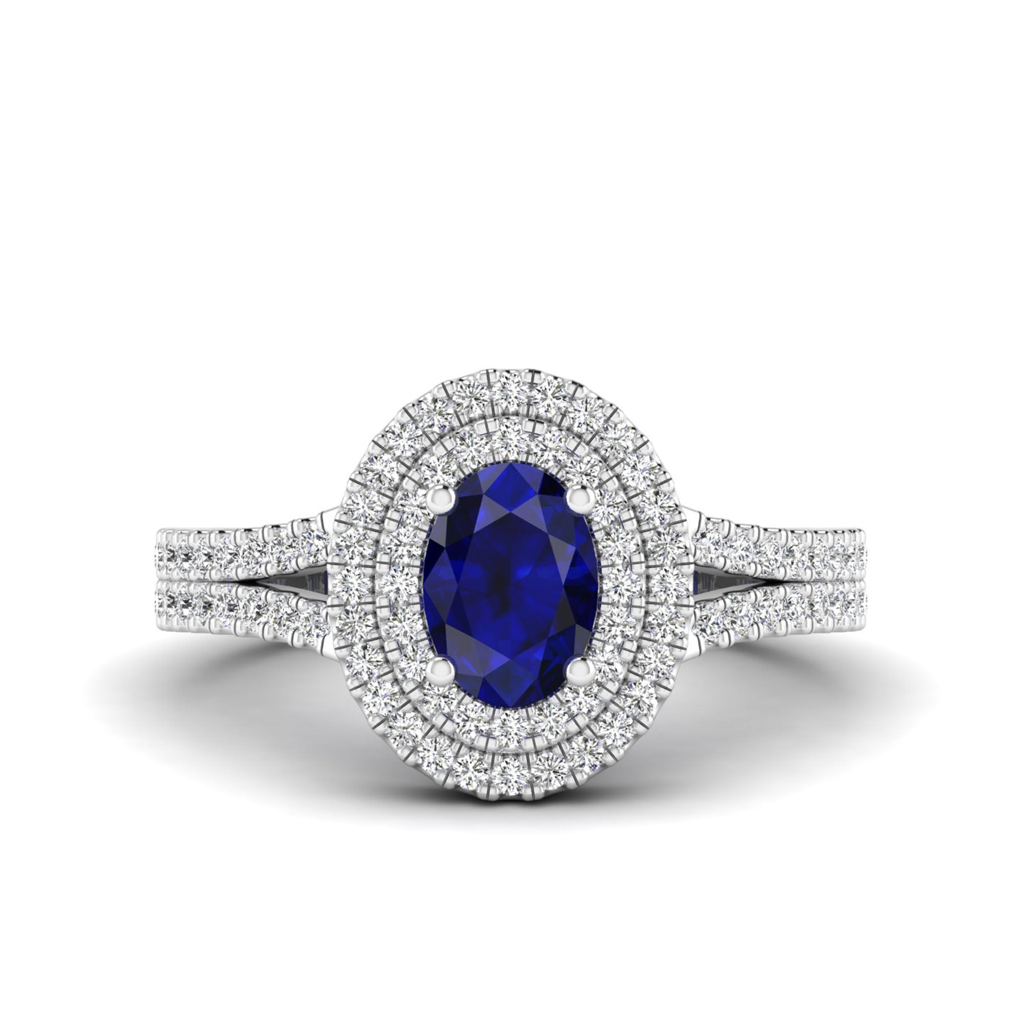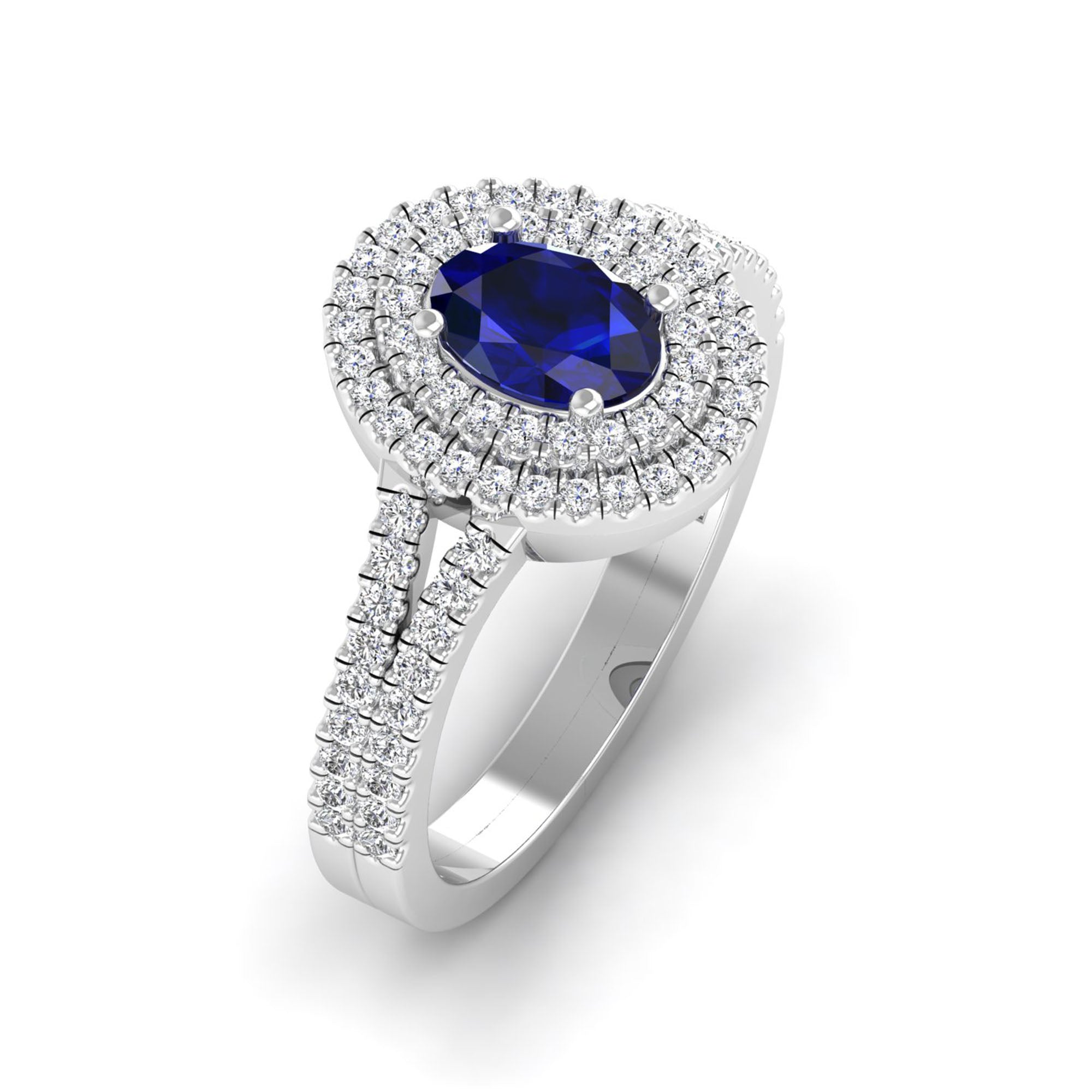 Experience elegance and luxury with our Prong-Set Double Halo Oval Sapphire and Infinity Diamond Ring. Designed with precision and expert craftsmanship, our ring features a stunning oval sapphire stone surrounded by a double halo of sparkling diamonds.