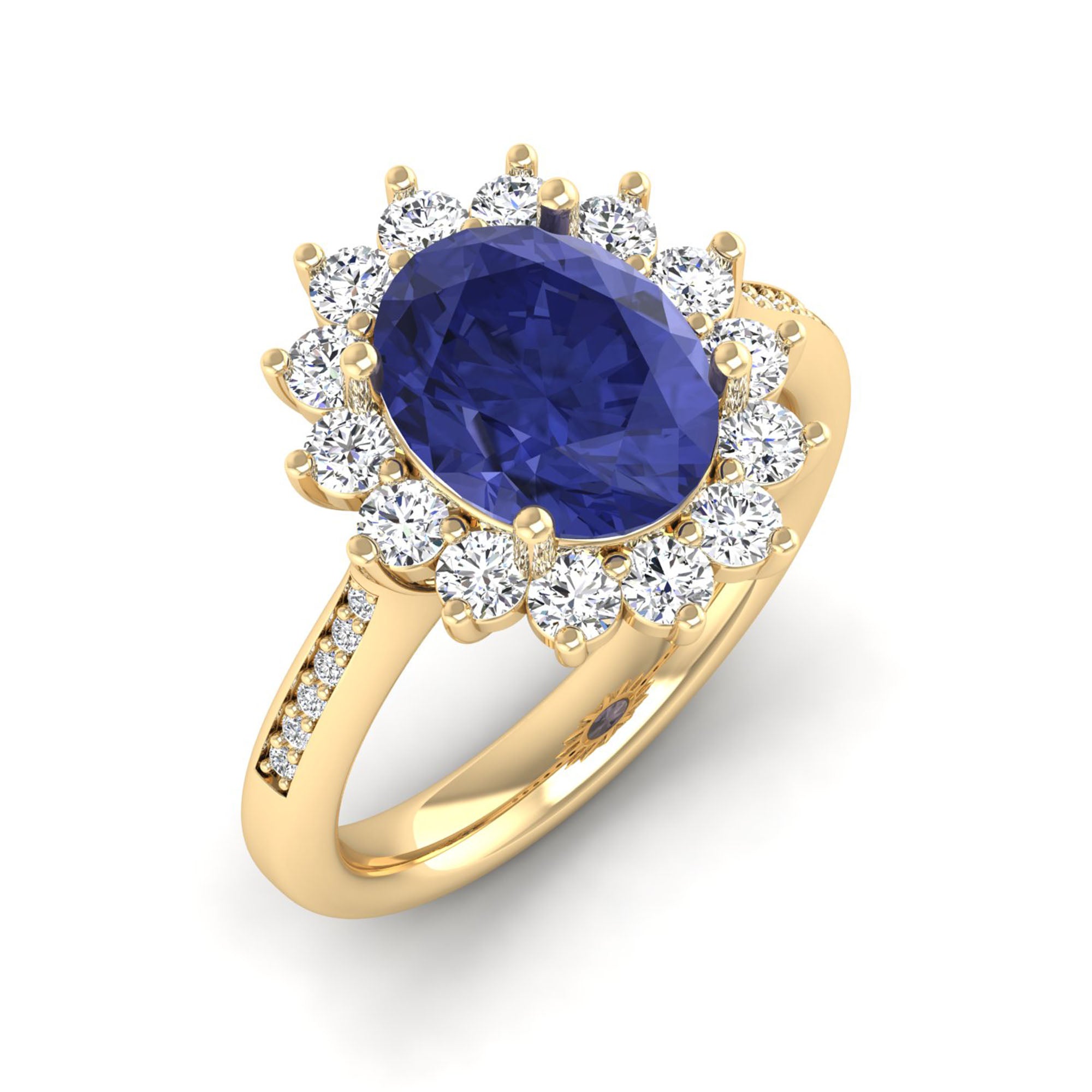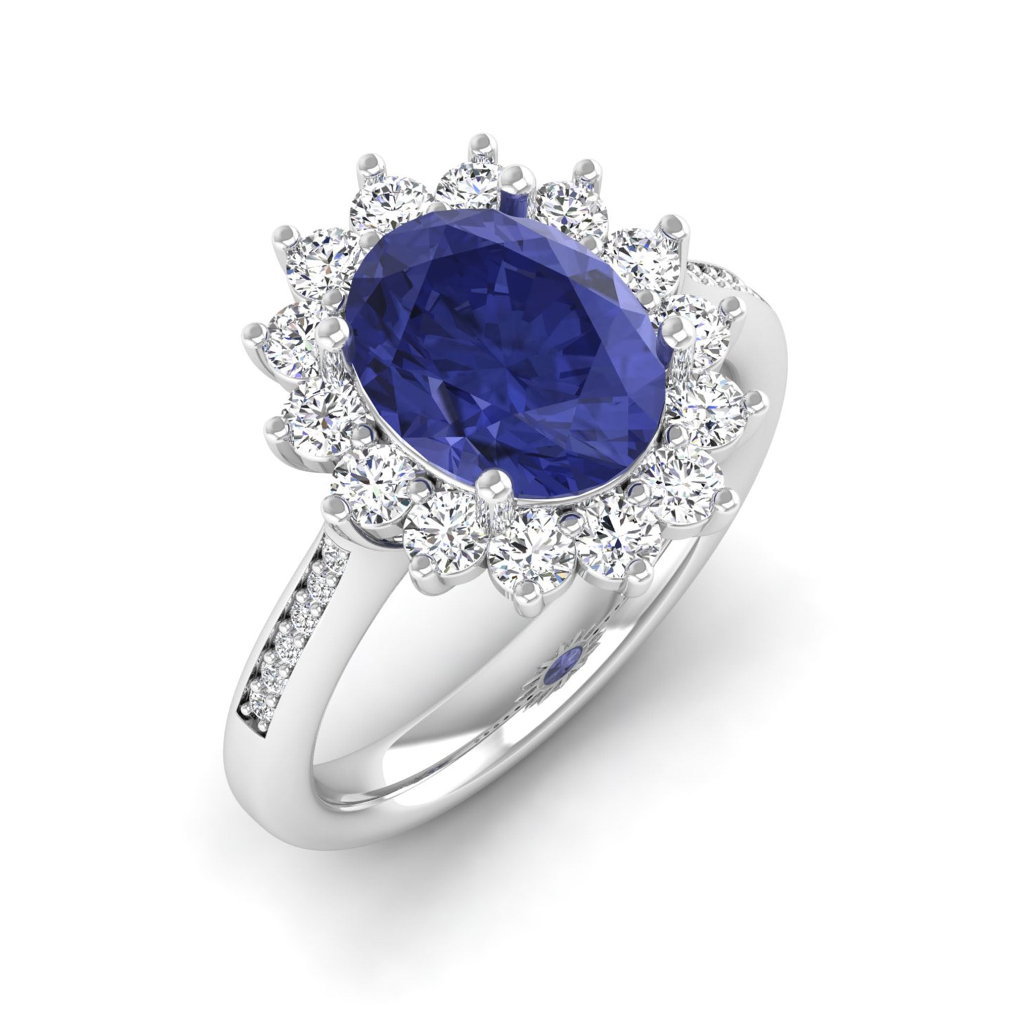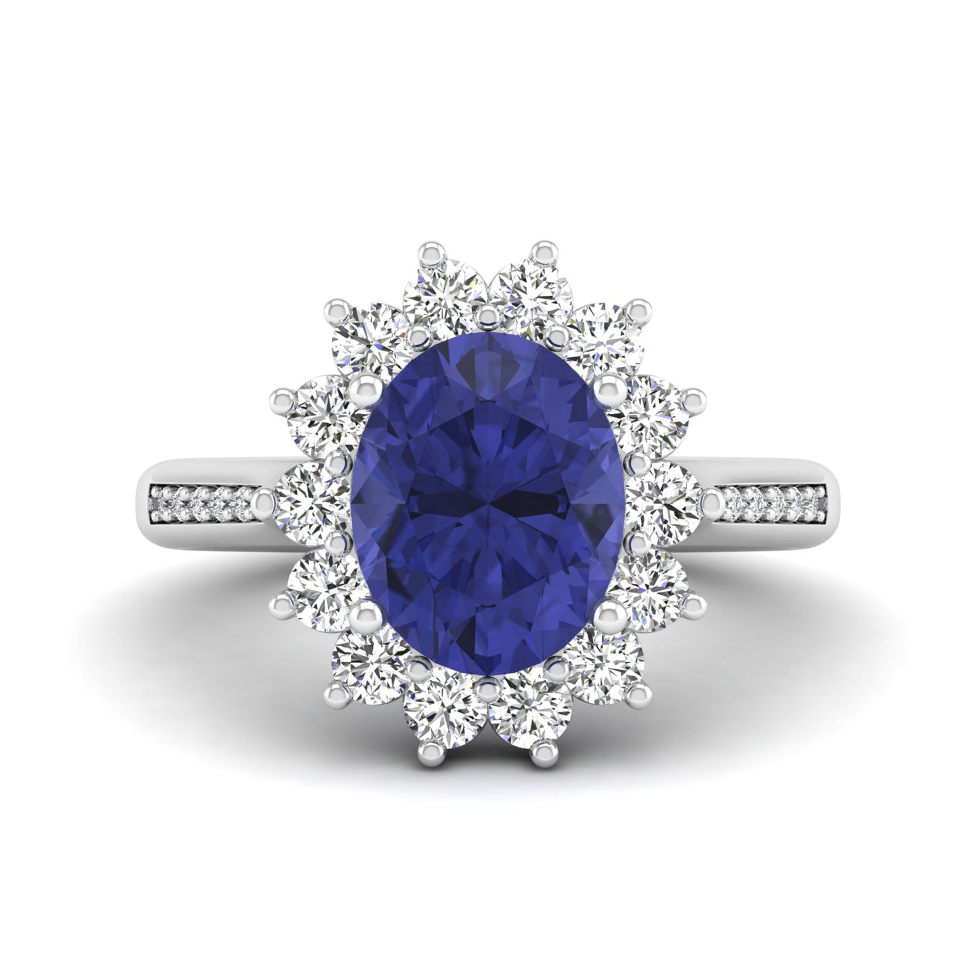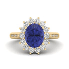 The Prong Set Oval Tanzanite Sunburst Diamond Halo Ring showcases a stunning oval tanzanite gemstone surrounded by diamonds in a sunburst halo design.