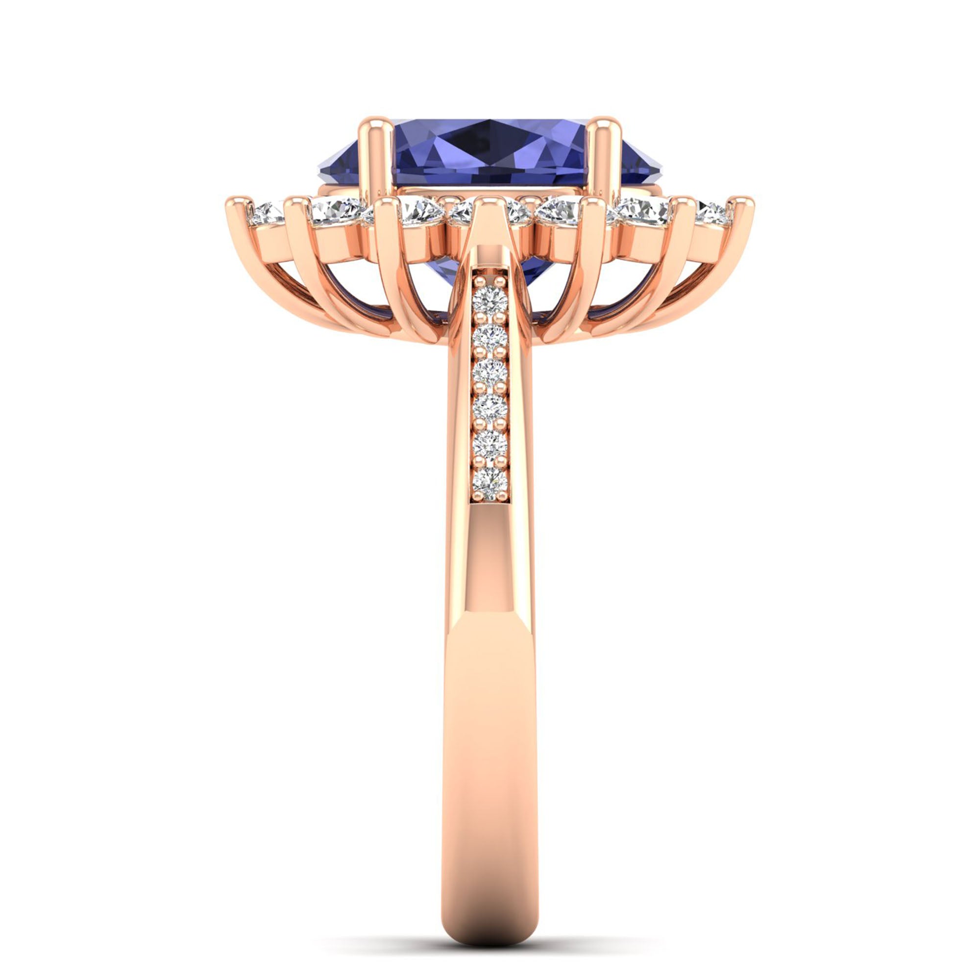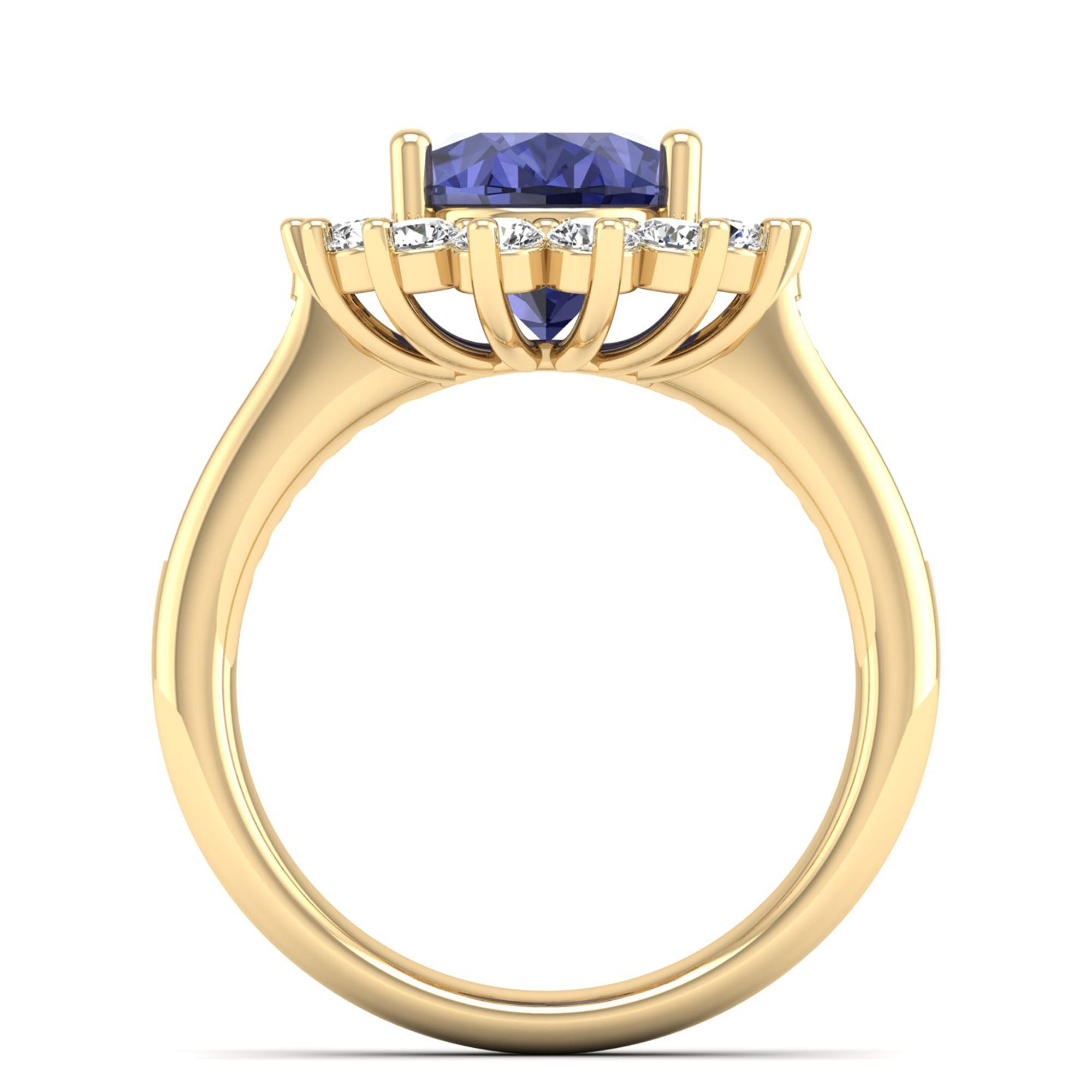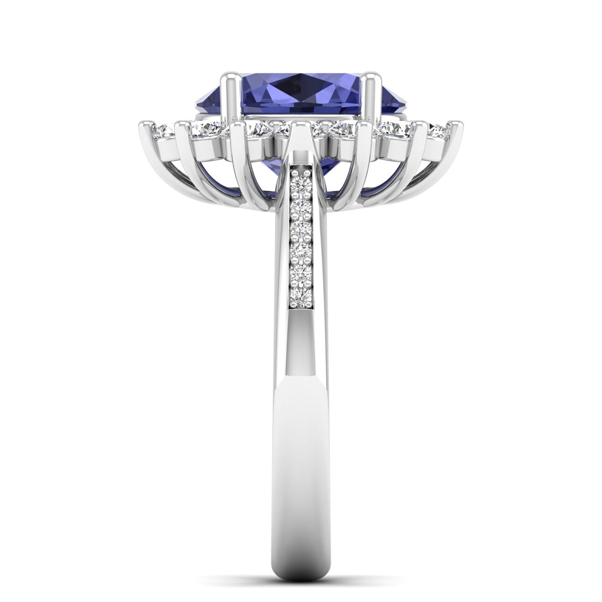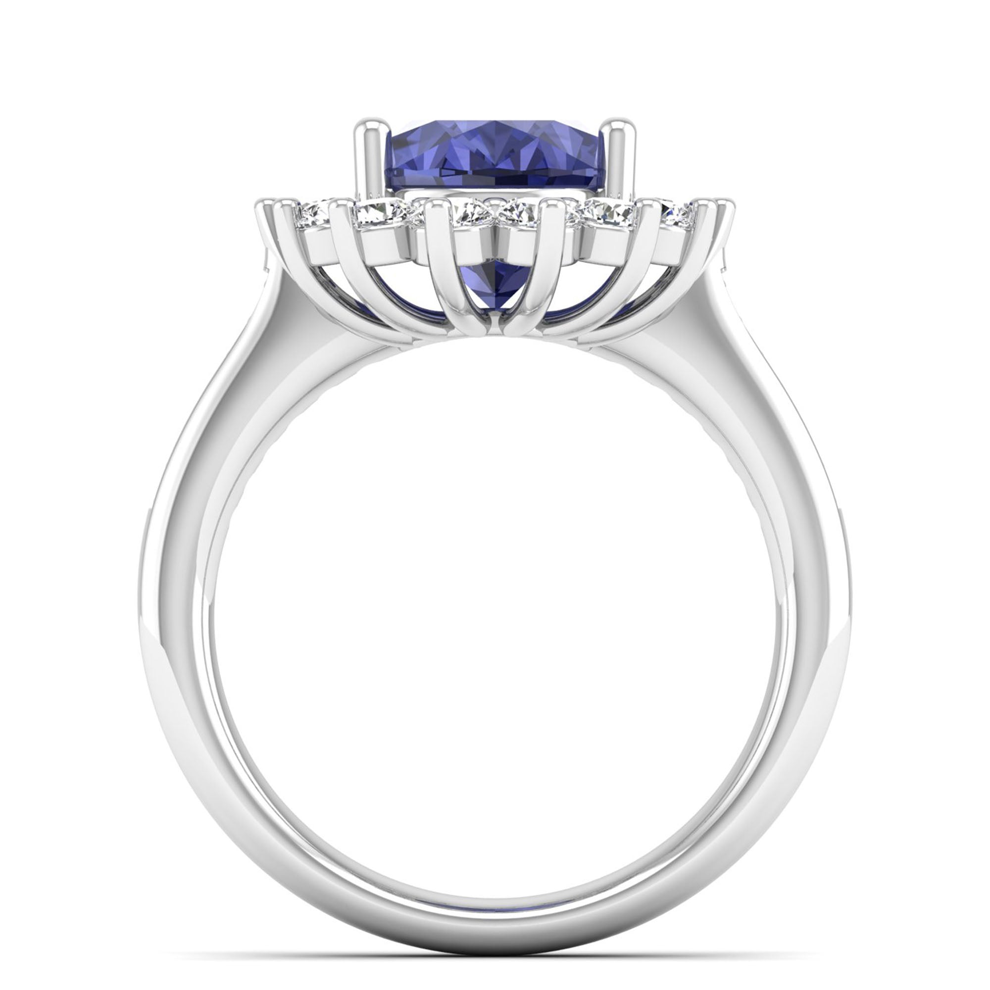 The Prong Set Oval Tanzanite Sunburst Diamond Halo Ring showcases a stunning oval tanzanite gemstone surrounded by diamonds in a sunburst halo design.
