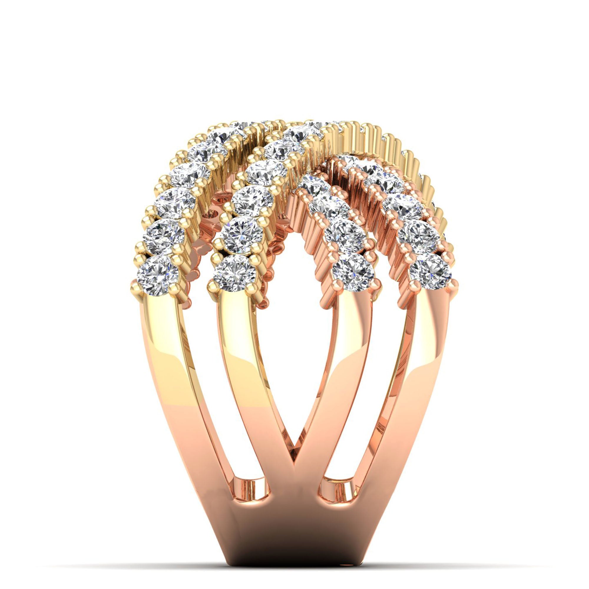 This Prong Set Two-Tone Criss Cross Diamond Ring showcases a unique design with expertly prong-set diamonds. The contrasting two-tone band adds a modern touch to the classic criss cross style.