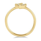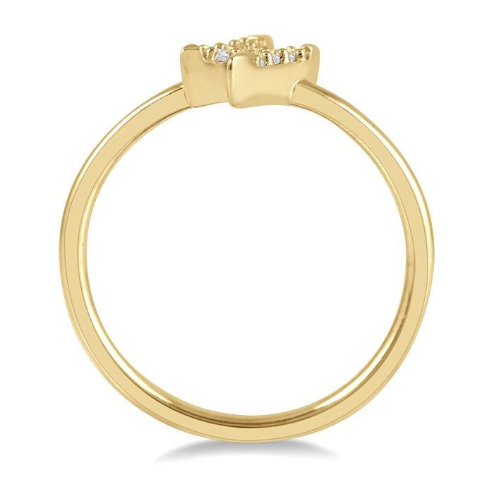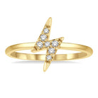 Delicate and attractive, this diamond petite fashion ring makes for a fine choice. It offers slender appeal, true to the Petite collection it comes from. The ring features a well-carved thunderbolt shape centerpiece, decorated with round cut diamonds. 3 each prong set round cut diamonds line the outer arms of the lightning bolt, while a prong set round cut diamond nestles in the center. The Petite diamond fashion ring is framed in 14 karat yellow gold.