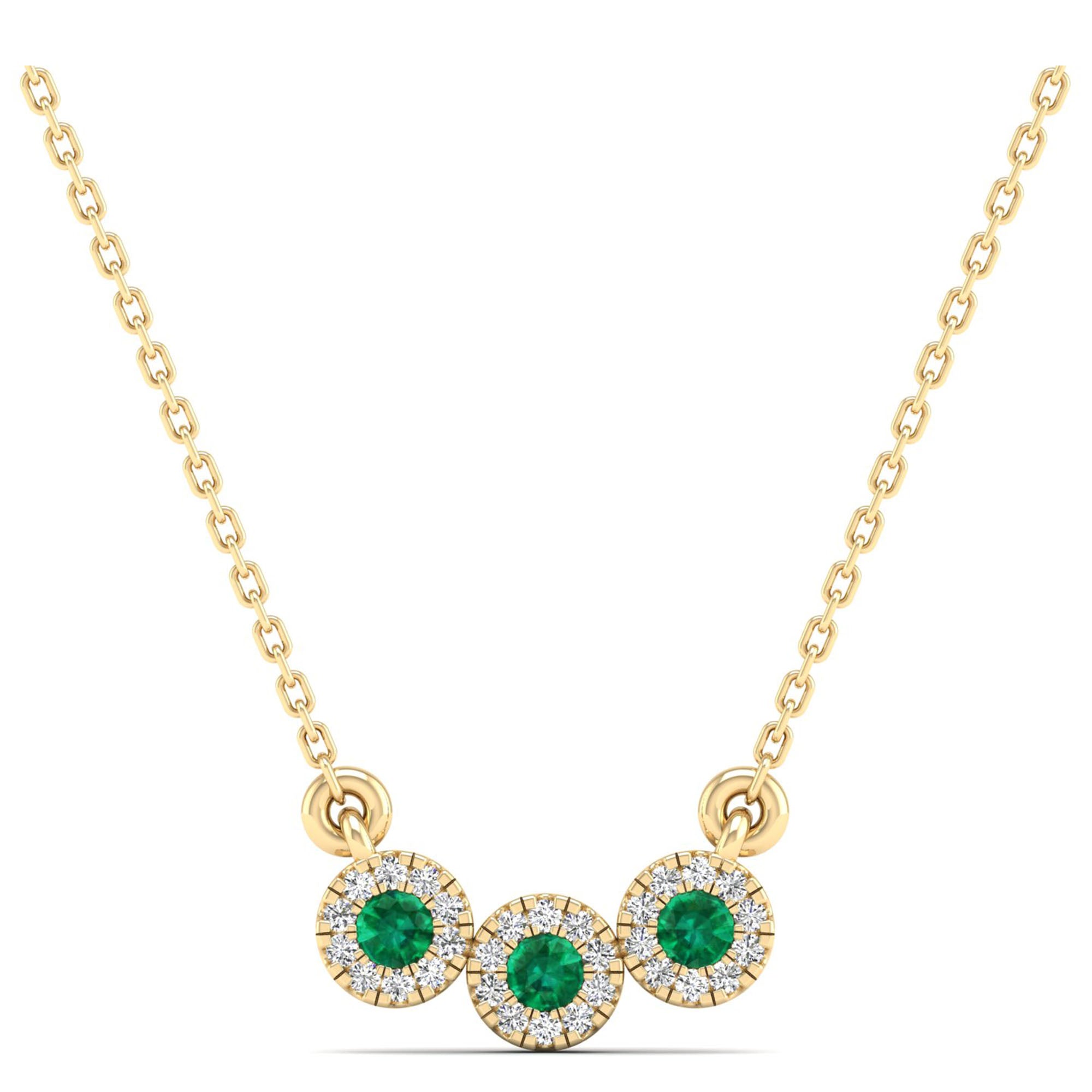 Experience the elegance and brilliance of our Trio Emerald and Diamond Halo Necklace. This stunning 14k gold necklace features a trio of emerald cut emeralds, each surrounded by a halo of sparkling diamonds.