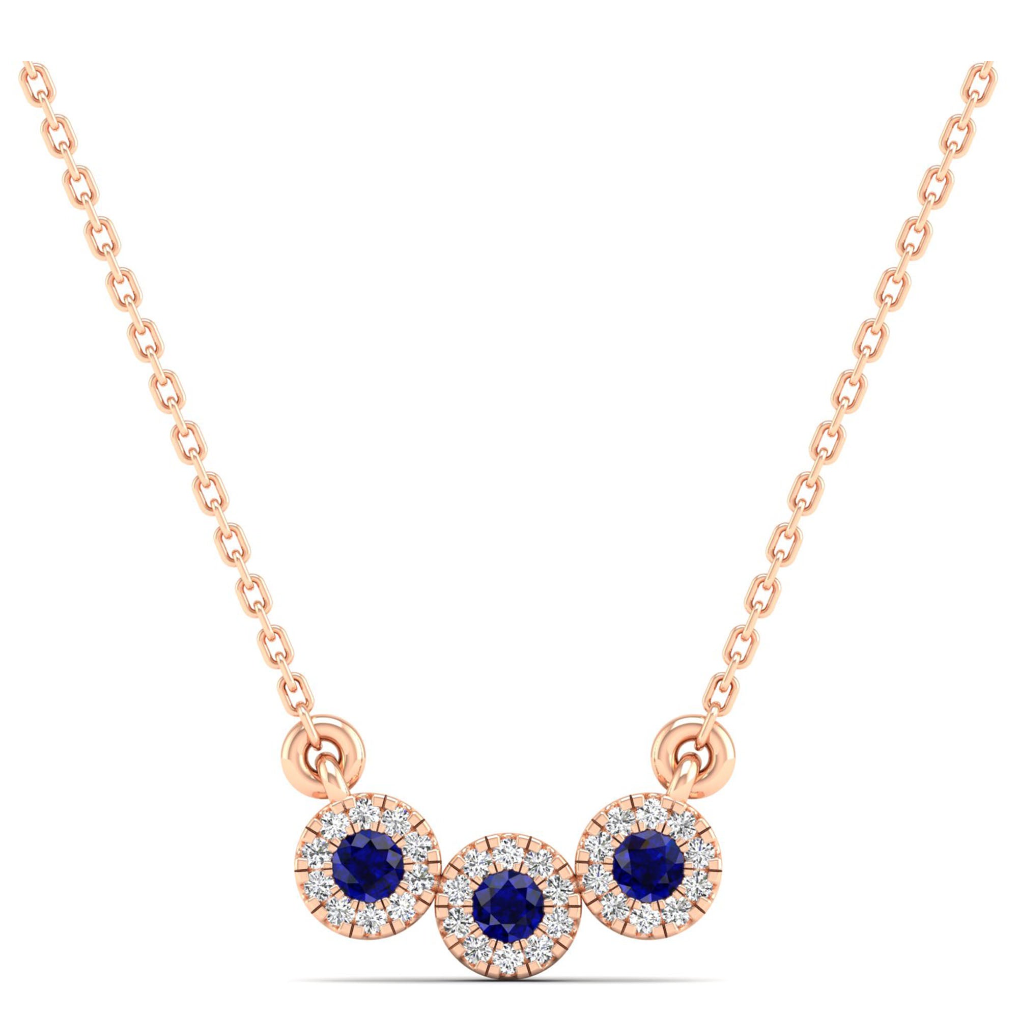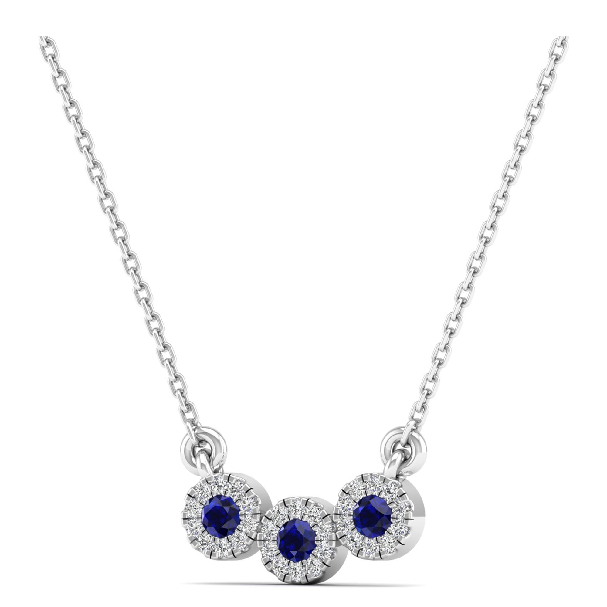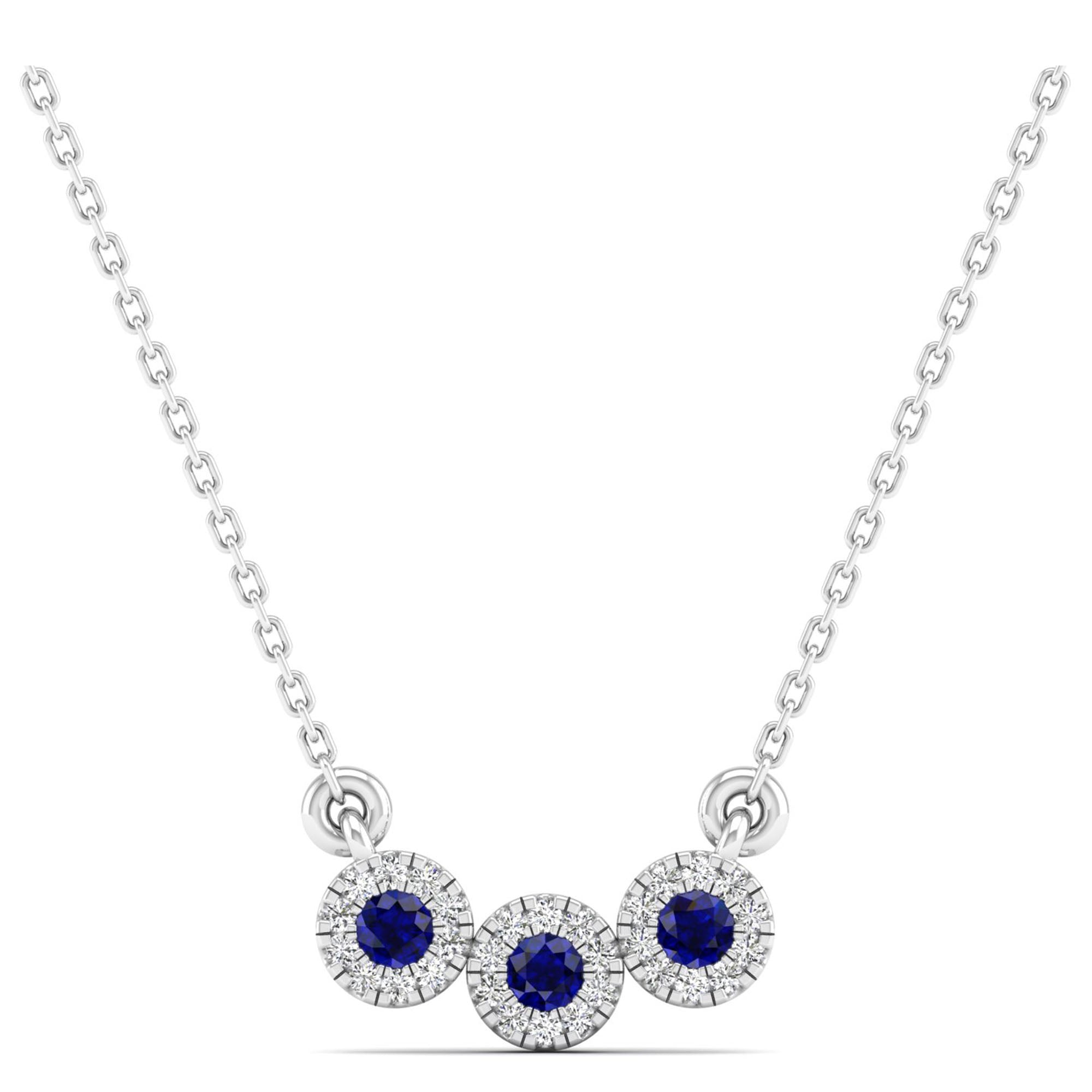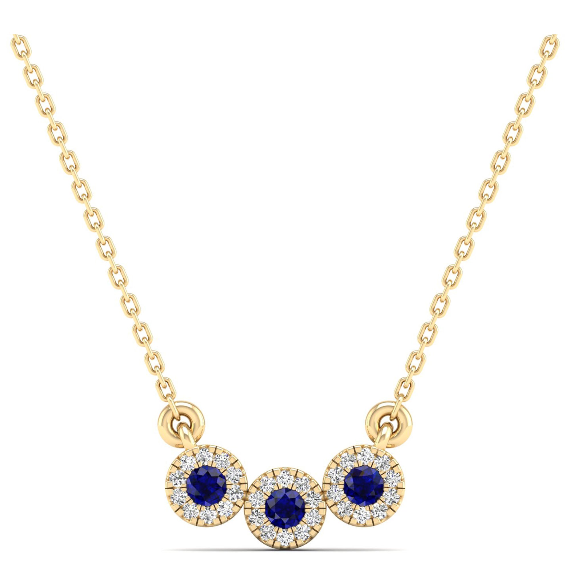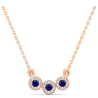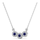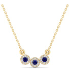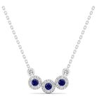 Experience the elegance and brilliance of our Trio Sapphire and Diamond Halo Necklace. This stunning 14k gold necklace features a trio of emerald cut sapphire, each surrounded by a halo of sparkling diamonds.