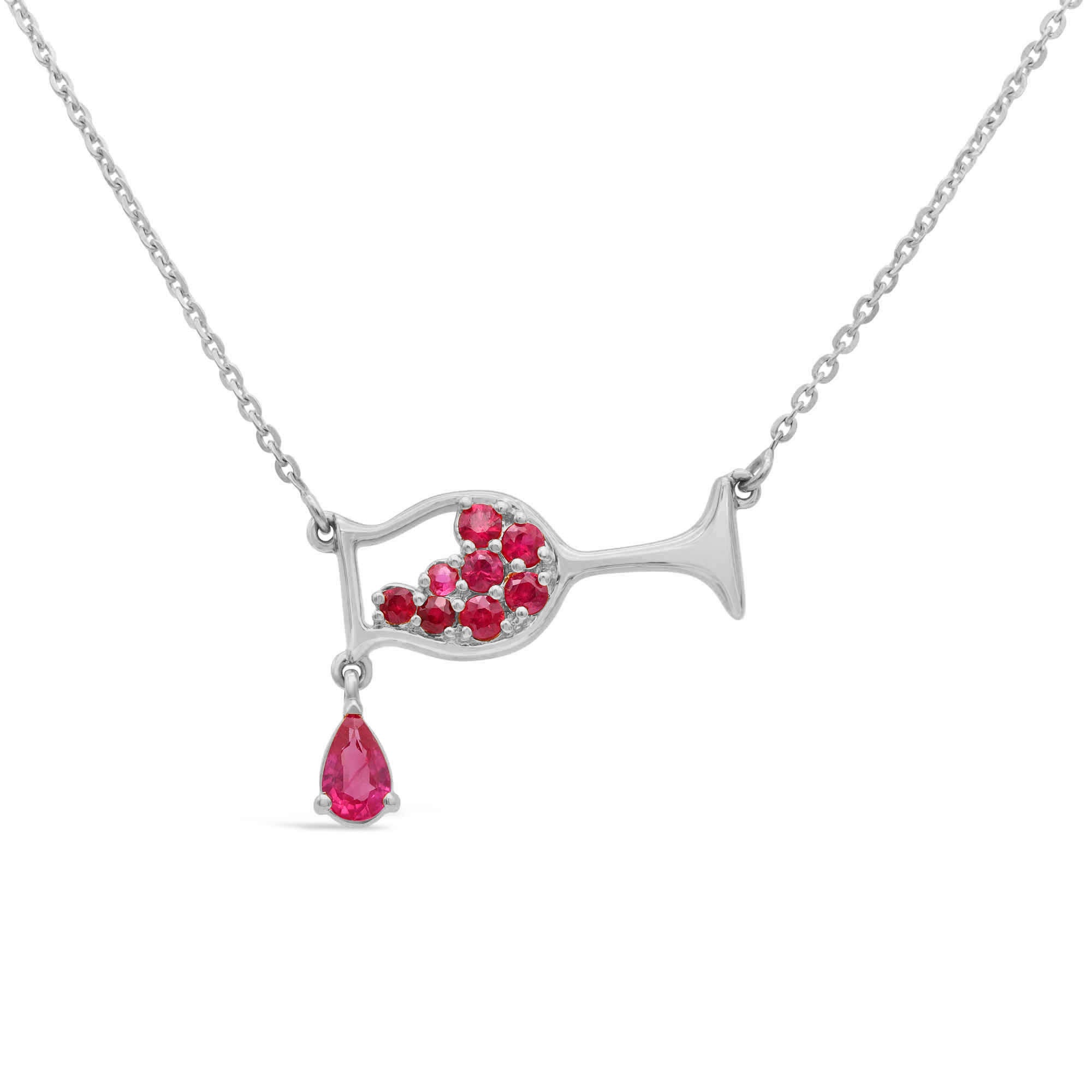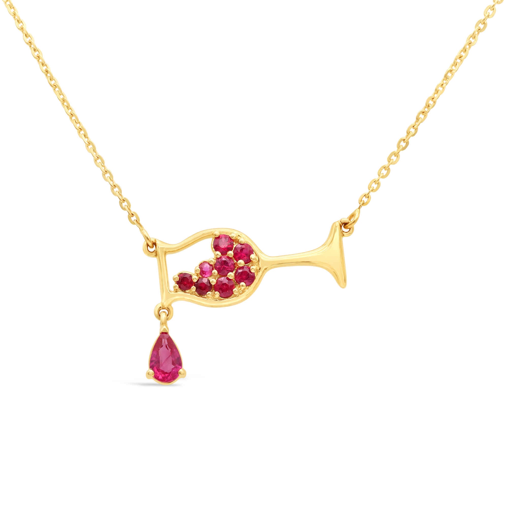 Sip on style with our Wine Glass Ruby Pendant. This quirky necklace features a pear-shaped ruby drop in a gold wine glass design. Perfect for wine lovers who also love a touch of elegance.